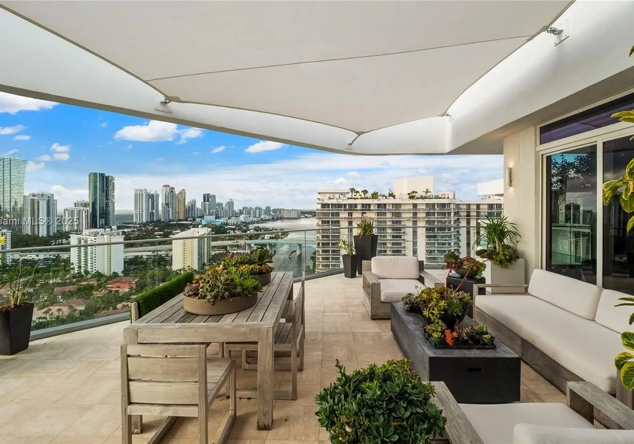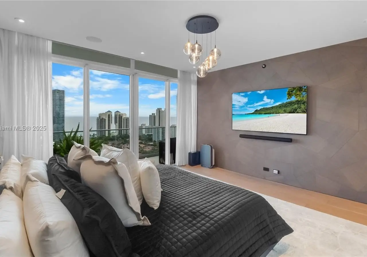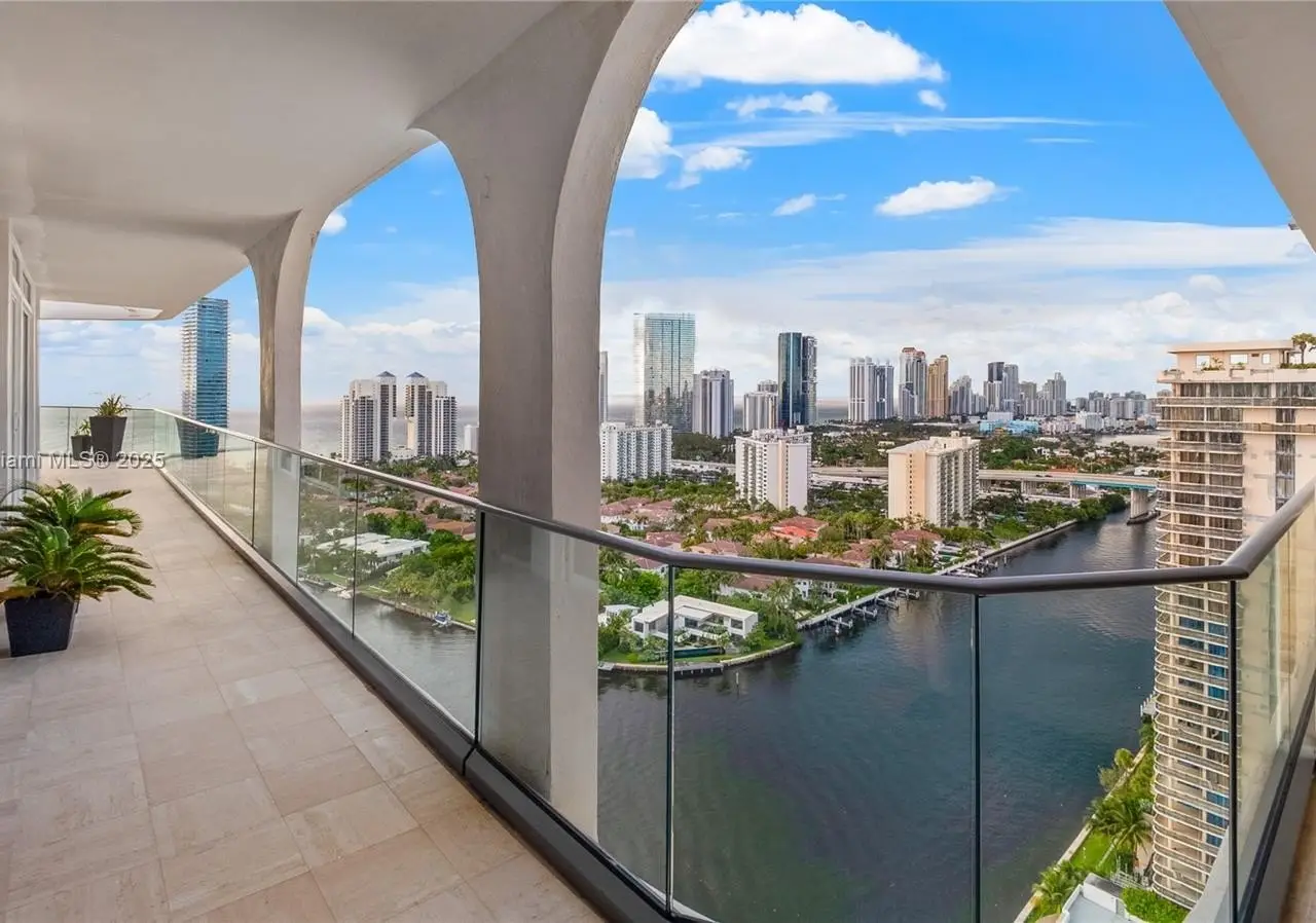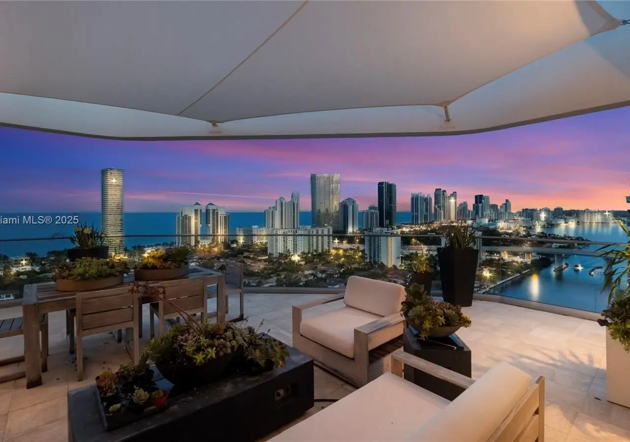 Experience luxury living in this exclusive penthouse with breathtaking direct ocean and Intracoastal views. Perfectly located near Aventura Mall, beaches, and fine dining, this 5-bedroom, 3.5-bath residence features two master suites, including a primary with a custom women's closet and a stunning Versace-tiled bath. The gourmet kitchen boasts Wolf and Sub-Zero appliances, Italian finishes, and Cristalito countertops with underlighting. Elegant interiors include custom cabinetry, a Versace-trimmed fireplace, Sonos audio, Lutron lighting, and remote blinds. A wraparound balcony invites outdoor dining and entertaining. Resort-style amenities include pool, valet, fitness center, restaurant, theatre, social room & marina. Fully funded reserves.
