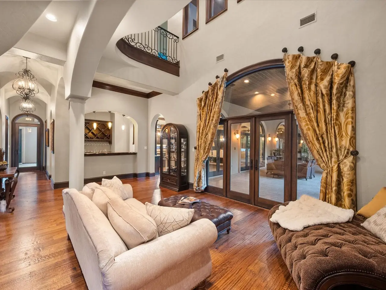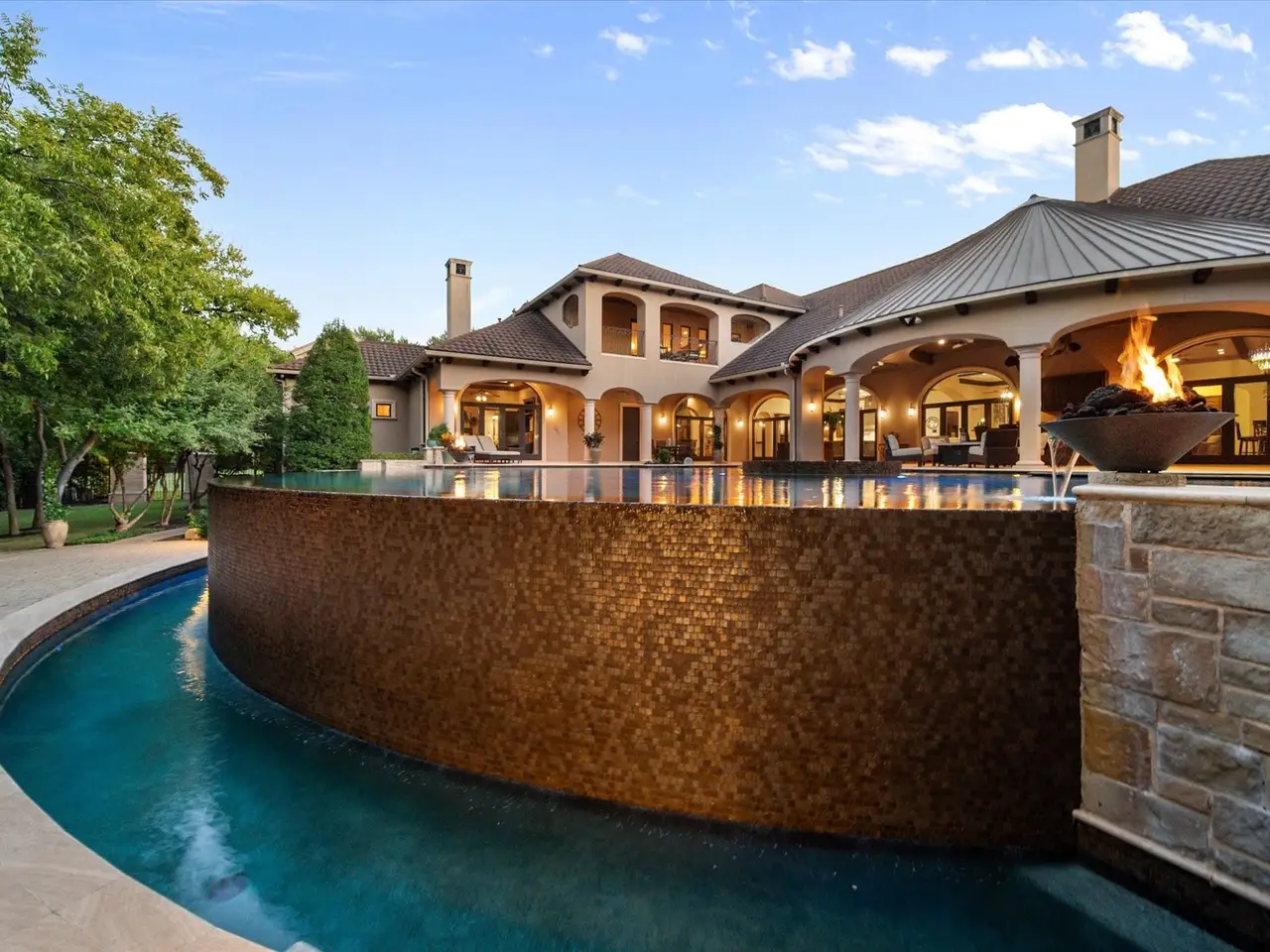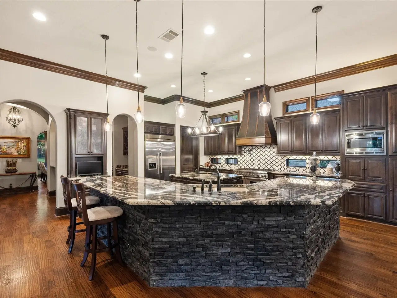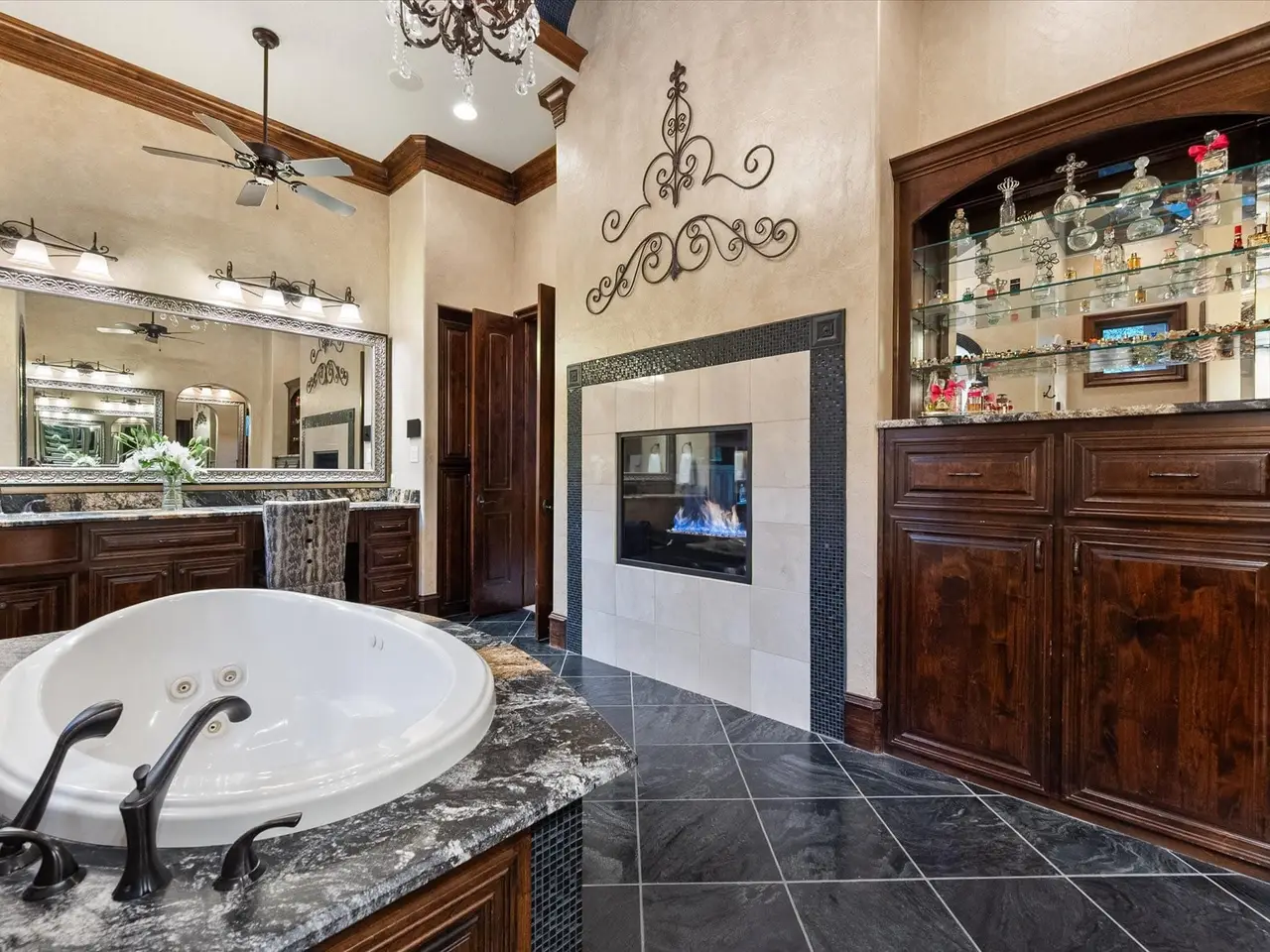 Welcome to a masterpiece of elegance and seclusion in Mansfield’s prestigious Strawberry Fields - a luxury estate where resort living and timeless design unite on two private, beautifully landscaped lots. Behind its stately stucco and stone facade, a grand foyer with a sweeping staircase sets the tone for sophisticated living. Step inside and discover hand-scraped hardwood floors throughout, soaring ceilings, and walls of Custom Marvin windows that bathe every space in natural light. Off the entry, a richly appointed study and formal dining room introduce the homes gracious flow. The primary wing is a private retreat, complete with a fireside bedroom overlooking the pool, a coffee bar with sink and refrigerator, and a spa-worthy bath featuring a Jacuzzi tub and custom cabinetry. Designed for entertaining, the heart of the home reveals a gourmet Thermador kitchen anchored by a striking custom copper vent hood, two dishwashers, butler’s pantry, and open sightlines to the formal living area and double-sided fireplace. A spacious bar with refrigerator, dishwasher and ice maker connects the formal and casual living areas, creating seamless gathering spaces. A second bedroom suite is conveniently located downstairs. Upstairs, movie nights shine in the media room with popcorn bar, flanked by two additional bedroom suites, a large living area, and a balcony overlooking the grounds. Outside, an award-winning pool - featured on HGTVs Cool Pools - steals the show, complete with a heated spa, dramatic fire bowls, multiple covered lounges with fireplace and bar, and a secluded lower fire pit. Expansive lawns offer room for play or future additions. A 4-car foam-encapsulated garage, air-conditioned workshop, Control4 whole-home smart system, tornado shelter, pet shower, and abundant storage ensure modern comfort and peace of mind. This is more than a home – it’s a resort-inspired sanctuary, crafted to impress and designed to be lived in beautifully.