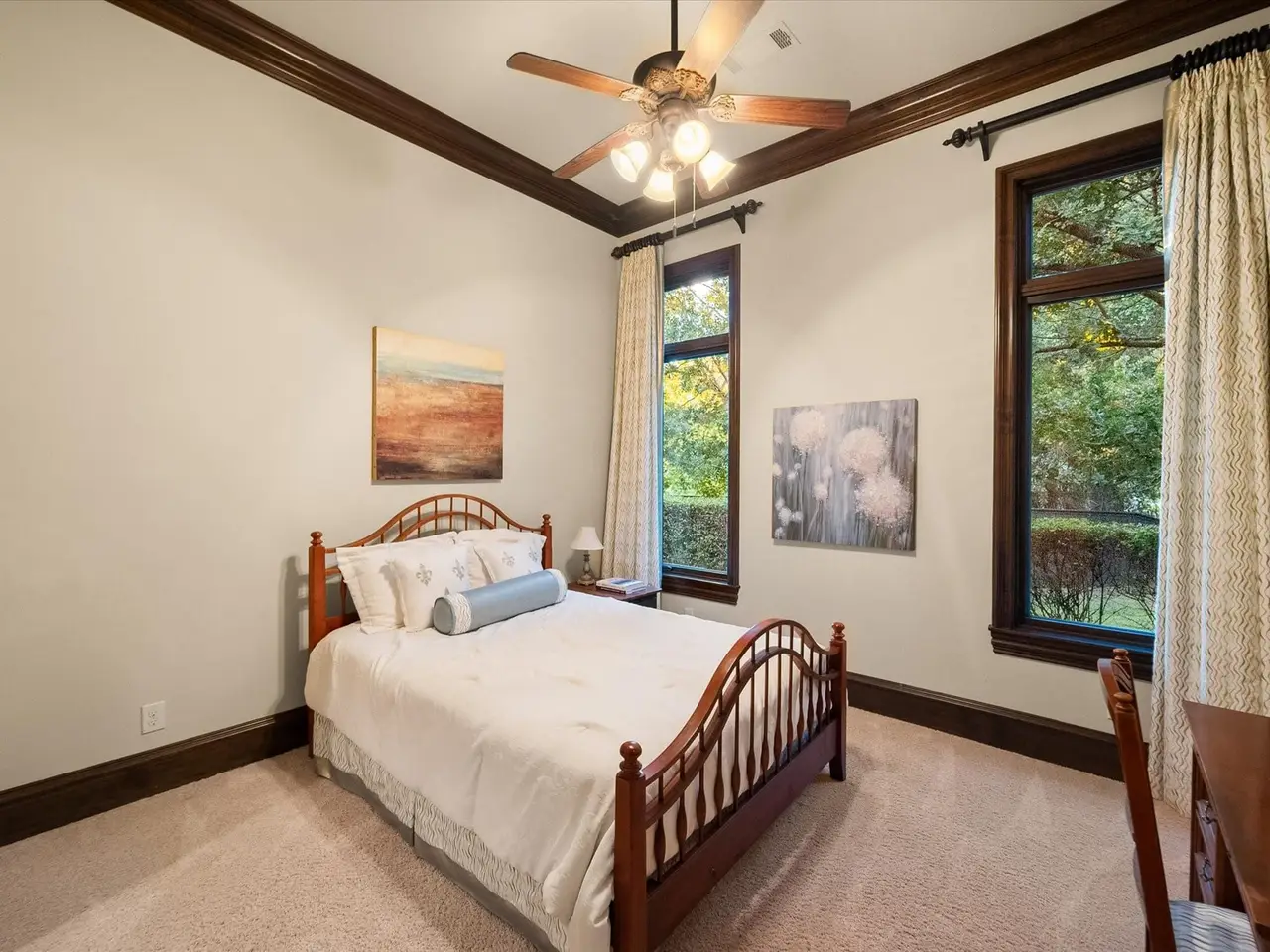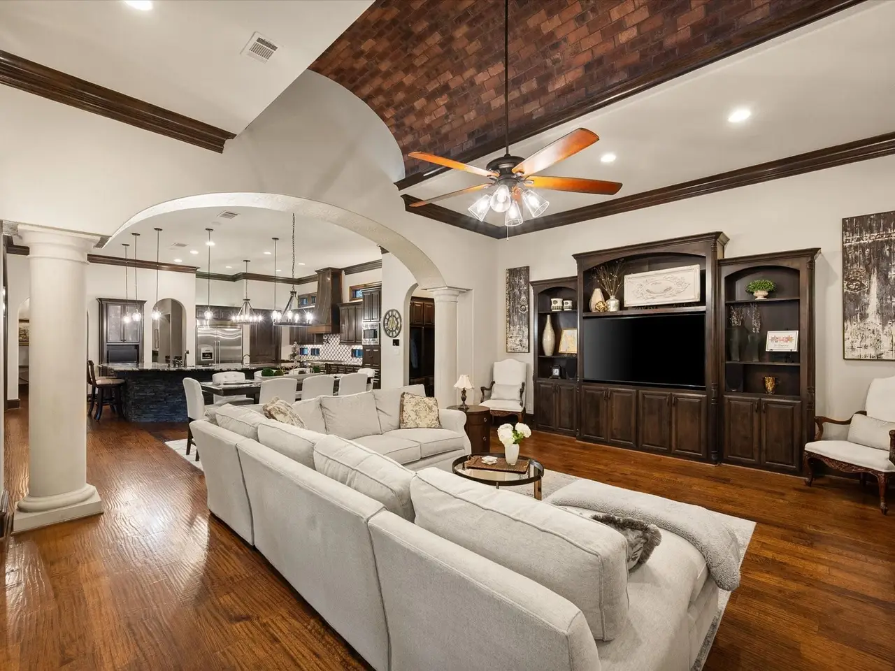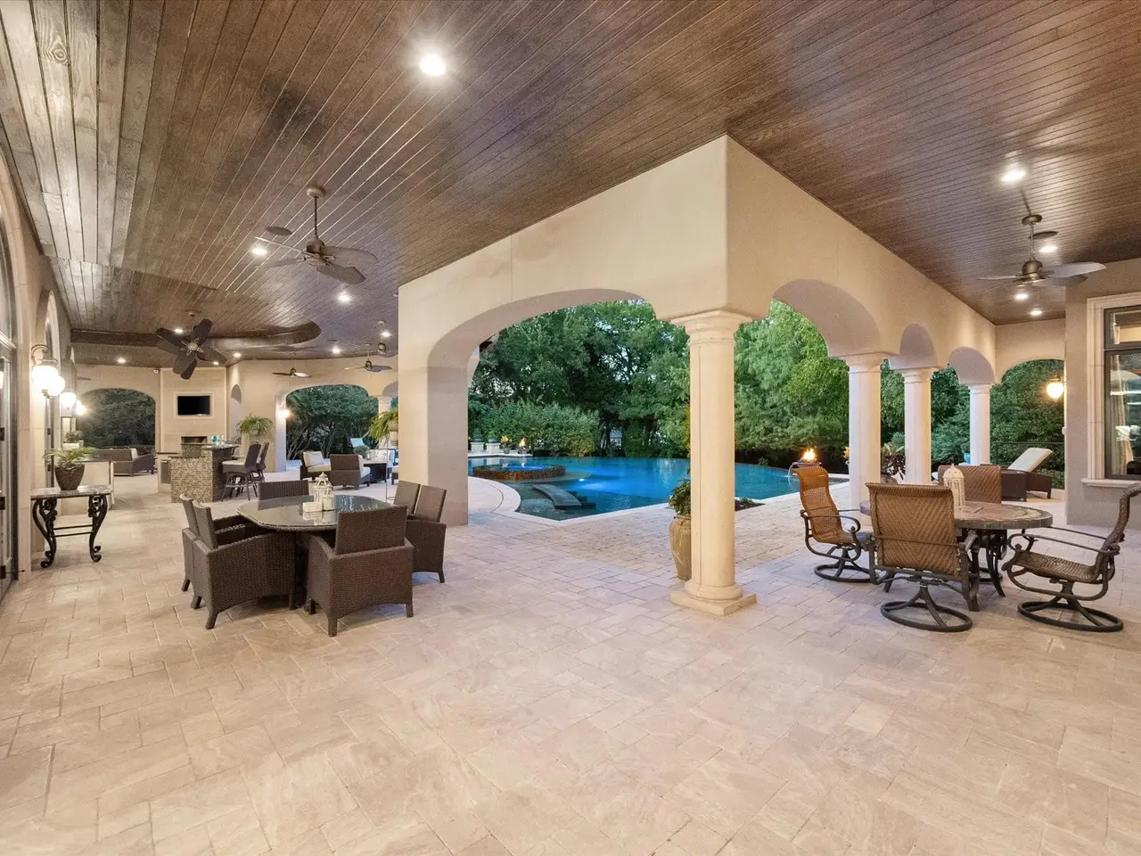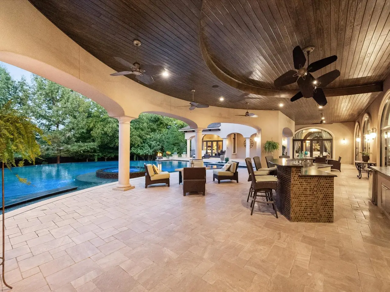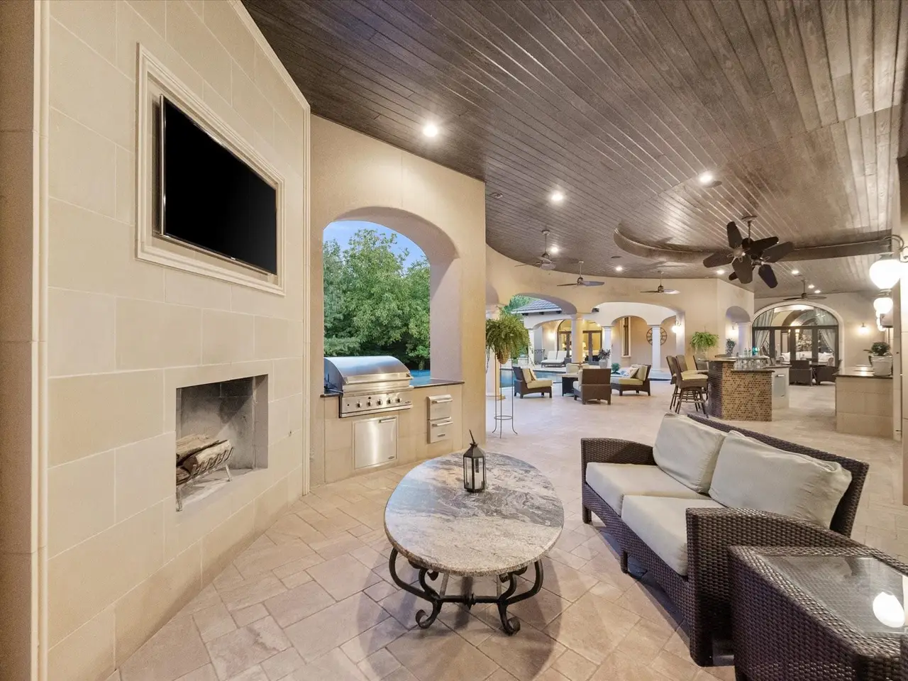 Welcome to a masterpiece of elegance and seclusion in Mansfield’s prestigious Strawberry Fields - a luxury estate where resort living and timeless design unite on two private, beautifully landscaped lots. Behind its stately stucco and stone facade, a grand foyer with a sweeping staircase sets the tone for sophisticated living. Step inside and discover hand-scraped hardwood floors throughout, soaring ceilings, and walls of Custom Marvin windows that bathe every space in natural light. Off the entry, a richly appointed study and formal dining room introduce the homes gracious flow. The primary wing is a private retreat, complete with a fireside bedroom overlooking the pool, a coffee bar with sink and refrigerator, and a spa-worthy bath featuring a Jacuzzi tub and custom cabinetry. Designed for entertaining, the heart of the home reveals a gourmet Thermador kitchen anchored by a striking custom copper vent hood, two dishwashers, butler’s pantry, and open sightlines to the formal living area and double-sided fireplace. A spacious bar with refrigerator, dishwasher and ice maker connects the formal and casual living areas, creating seamless gathering spaces. A second bedroom suite is conveniently located downstairs. Upstairs, movie nights shine in the media room with popcorn bar, flanked by two additional bedroom suites, a large living area, and a balcony overlooking the grounds. Outside, an award-winning pool - featured on HGTVs Cool Pools - steals the show, complete with a heated spa, dramatic fire bowls, multiple covered lounges with fireplace and bar, and a secluded lower fire pit. Expansive lawns offer room for play or future additions. A 4-car foam-encapsulated garage, air-conditioned workshop, Control4 whole-home smart system, tornado shelter, pet shower, and abundant storage ensure modern comfort and peace of mind. This is more than a home – it’s a resort-inspired sanctuary, crafted to impress and designed to be lived in beautifully.