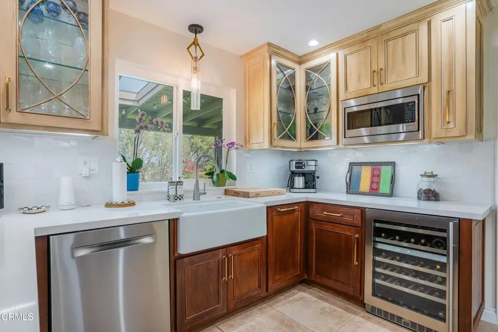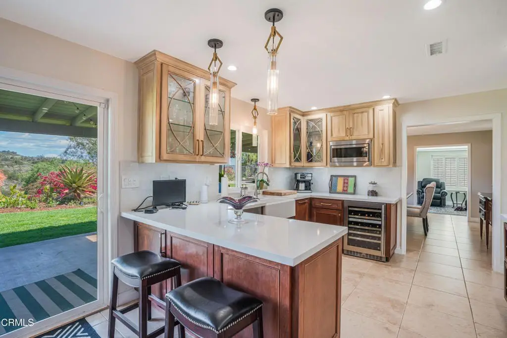 Experience modern luxury, privacy and sweeping VIEWS from this beautifully reimagined custom residence in the prestigious Terra Bella Estates. Set on a private flag lot and designed for both refined entertaining and everyday comfort, this home has been thoughtfully remodeled throughout with timeless finishes and an effortless indoor-outdoor lifestyle. Step inside to a warm, sophisticated living room anchored by a classic custom fireplace. Overhead, an exquisite Tiffany stained-glass chandelier adds a soft, artful glow - creating a space that is both elegant and inviting. The heart of the home is the beautiful chef's kitchen, where sleek quartz countertops, soft-close custom solid wood cabinetry with Rev-A-Shelf pull-outs, contrasting hand-cut lower cherrywood and upper hand painted wood complement high-end stainless-steel appliances including a commercial-grade 5-burner range and professional vent hood. A formal dining room sets the stage for memorable gatherings, while the adjoining family room offers a relaxed, comfortable space for daily living. With six bedrooms, including one conveniently located on the main level, the floor plan provides exceptional versatility. The primary suite is a calming retreat featuring a generous layout and a fully remodeled spa-inspired en-suite with quartz dual vanity, wash-let bidet, luxurious free-standing soaking tub, and an expansive walk-in shower highlighted with marble lattice tile and refined modern fixtures. The home also features a second full bath and two additional half baths, ensuring comfort and convenience for residents and guests alike. Step outdoors and discover your own private oasis! A covered patio invites lounging, dining, and quiet morning coffee moments, while the sparkling pool and spa - complete with a soothing waterfall feature - offer resort-style enjoyment with stunning panoramic views. Surrounded by mature olive trees and thoughtful landscaping, the backyard feels serene and completely private - an escape designed for true relaxation. The home has also been upgraded for modern efficiency and comfort, featuring a brand-new furnace, tankless water heater, and all new PEX plumbing. The two-car garage includes a versatile bonus room ideal for a home gym or studio, and an unfinished attic space offers exciting potential to be reimagined - possibly as an added room with an ocean view. A rare offering blending classic elegance, modern comfort and nature!