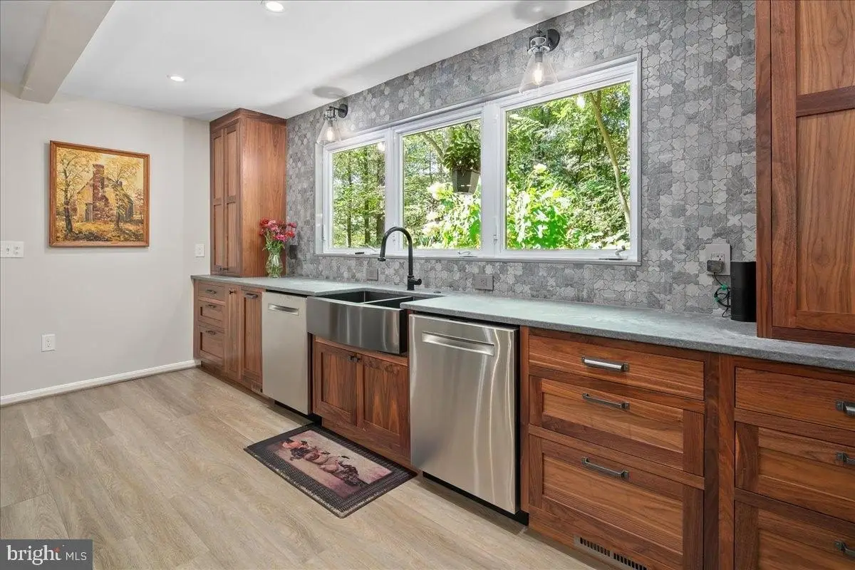 Welcome to this beautifully updated home that seamlessly blends modern design with timeless charm. Featuring a stunning open-concept kitchen, cozy living areas, and abundant natural light, this home offers both comfort and sophistication in every detail. Step into the heart of the home - an incredible gourmet kitchen designed to impress visually and functionally. Updated and expanded in 2023, the kitchen features a stunning Maldives leathered quartzite island (with no seams) with a built-in prep sink and bar seating that anchors the space. It is complemented by rich walnut cabinetry with integrated interior electrical outlets, and sleek Rugged Concrete Caesarstone quartz counters. Top-of-the-line appliances include a Wolf 6-burner gas stove with a custom hood, two dishwashers, and a cabinet-depth refrigerator and freezer. An eye-catching tile backsplash and oversized windows flood the space with light. Adjacent to the kitchen is a spacious family room with exposed wood ceiling beams and a classic brick fireplace, a perfect blend of rustic charm and modern amenities. Glass doors open to a beautiful outdoor patio, enhancing the indoor-outdoor connection. A glorious sunroom offers a relaxed retreat with wraparound windows, ideal for reading, relaxing, or hosting guests. This room is bathed in natural light and offers serene views of the surrounding pastures. The formal dining and living rooms are perfect for hosting gatherings, featuring white oak floors, plantation shutters, & custom draperies. The main level features a bedroom, currently used as an office, that includes a built-in desk. A full bathroom is also conveniently located on this level. Upstairs, the primary bedroom is a serene retreat with a walk-in closet & a beautifully updated en-suite primary bathroom with sleek double vanity, and a large, glass-enclosed walk-in shower with subway tiles. A second washer and dryer are a bonus in the primary suite. The upper level includes four bedrooms, all with hardwood floors, and two full bathrooms, both with double vanities. The finished lower level is an entertainer's dream, offering a versatile space for games and relaxation. A wet bar provides a perfect spot for serving drinks, and a large storage room with utilities offers abundant storage. Step outside to the fantastic outdoor living space, perfect for entertaining and enjoying the serene surroundings. The large patio features an outdoor kitchen, a hot tub, and two tranquil ponds. The property features a 5-stall center aisle horse barn, each with front and back doors leading to its own paddock and a wash stall. There's a separate hay barn, a grass schooling area, and multiple fenced turn-out pastures with elegant 3-board wood fencing. Direct access to incredible ride-out trails makes this a true equestrian's paradise. Beyond the barn, the expansive grounds include a sensational 100 x 50 vegetable garden, a chicken coop, and a tractor shed. A new roof was installed in 2018 and a new hot water heater in 2017. The grand circular driveway was upgraded in 2023 and provides an impressive entrance with an additional parking alcove, leading to a 2-car garage. This home is a perfect showcase of classic character and modern design.