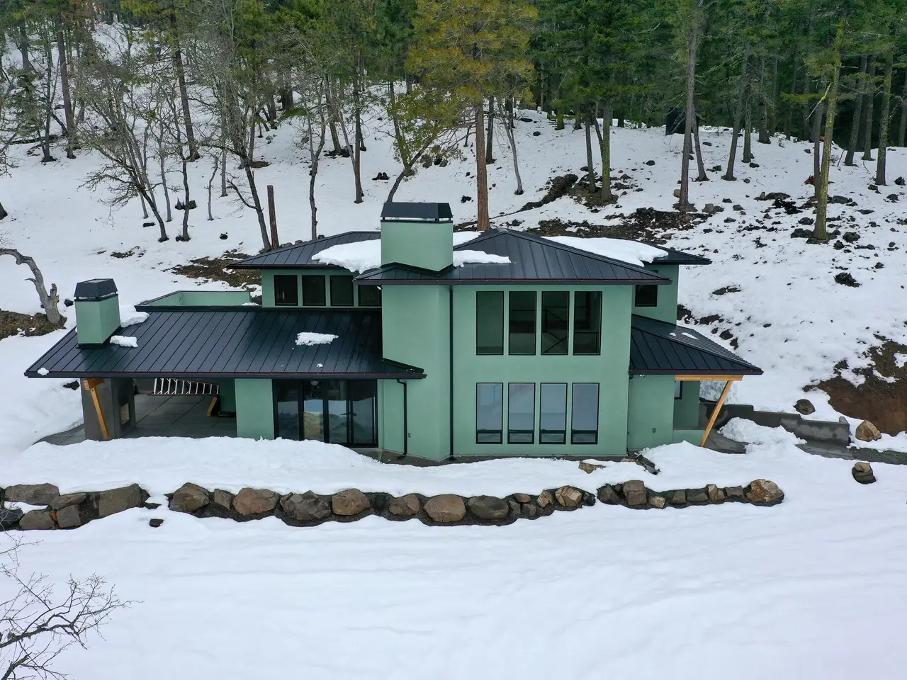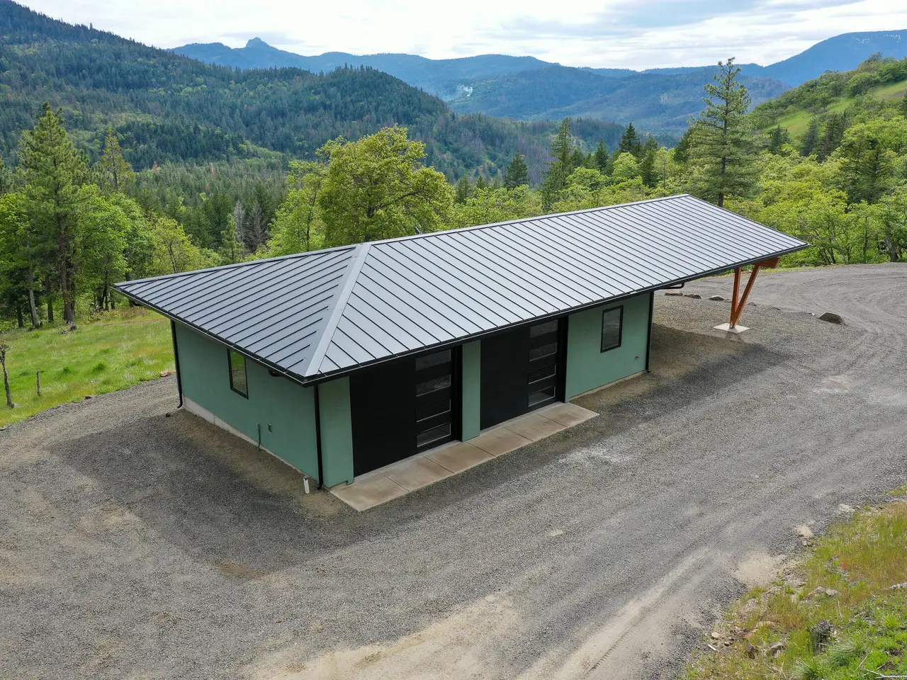 Stunning new contemporary home with mountain views on 20+ private acres! Interior highlights include natural hickory and maple hardwood floors and steps; porcelain tile in kitchen, bathrooms and great room, granite countertops; washer and dryer in upstairs primary bedroom closet and connections for a second set up downstairs, windows wired for electric blinds or shades, beautiful stone fireplace all the way to the ceiling, all Dacor appliances. The exterior has stucco siding, and a metal roof on both the main house and detached garage. The oversized garage has enough space for 2 cars plus a shop area with ample lighting, EV charging outlet, and a heated full bathroom. The garage also has an attached 2 car carport. The covered patio boasts an outdoor fireplace and the upstairs balcony off of the primary bedroom is a perfect place to accommodate a hot tub and enjoy the views. There is also a 200 amp service to the home and an additional 200 amp service for future construction.