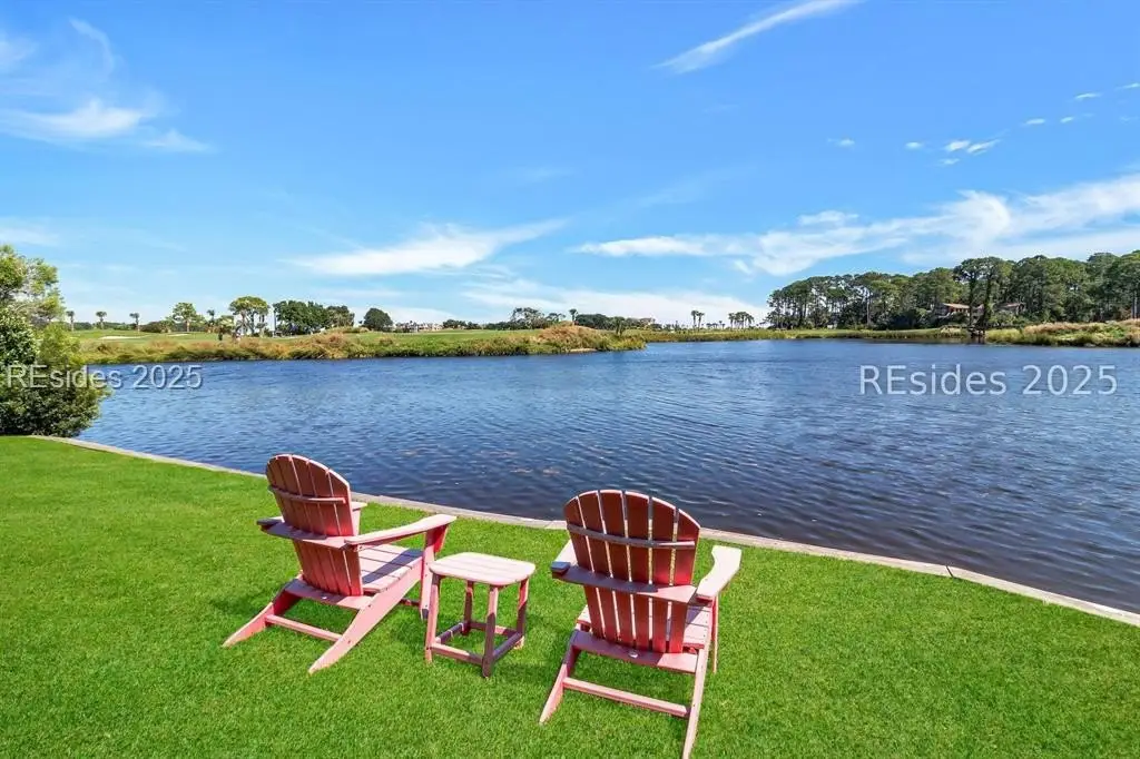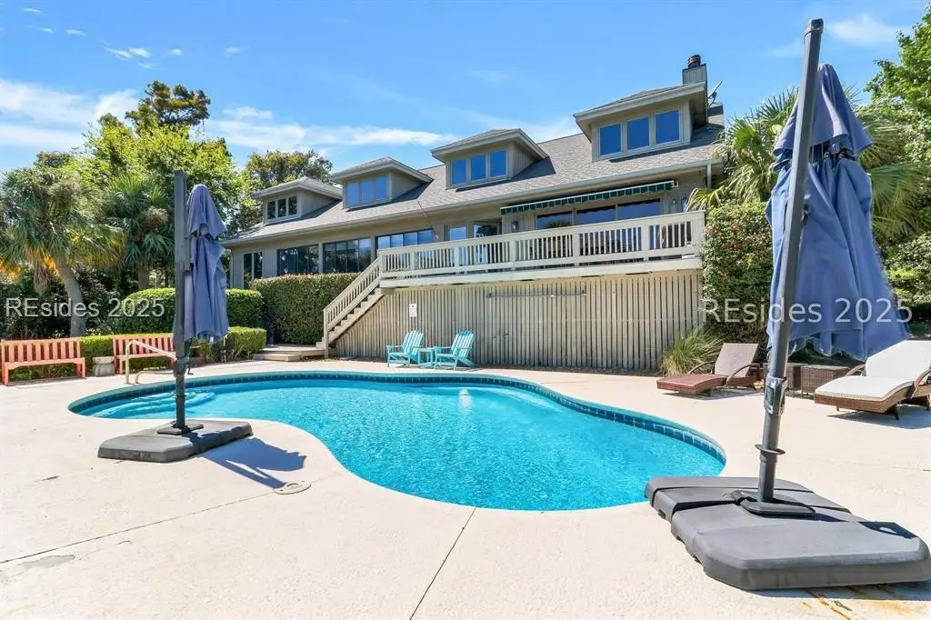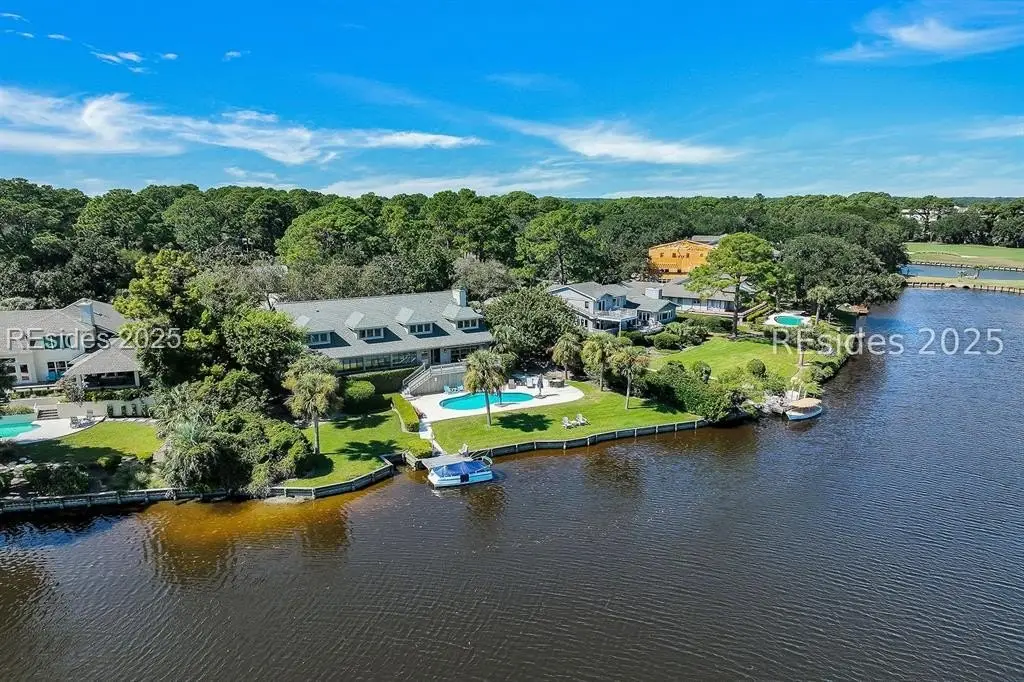 This 4500 sqft stunning 5-bedroom, 5-bath residence offers breathtaking lagoon and multiple holes of the Robert Trent Jones Golf Course (#12 green, #13 hole, #9 tee, and the 10th/11th fairways) with distant OCEAN views. This home has an inviting open kitchen/family room, expansive 1st level owner suite, spacious enclosed porch with dining area, and 4 oversized guest ensuites providing privacy and comfort for family and friends. Outdoor living is unmatched with a trex deck swimming pool, and private dock with access to the 11-mile lagoon making it ideal for fishing, kayaking, or electric boating right out your backyard. Additional features include 3 car garage and 2017 roof. The highly sought-after oceanfront community of Palmetto Dunes is known for its resort lifestyle where residents enjoy access to two beach clubs, three miles of pristine beaches, three championship golf courses, world-class tennis and pickleball facilities, Shelter Cove Harbour & Marina, exceptional dining, shopping, bike paths, and the scenic 11 mile lagoon system.