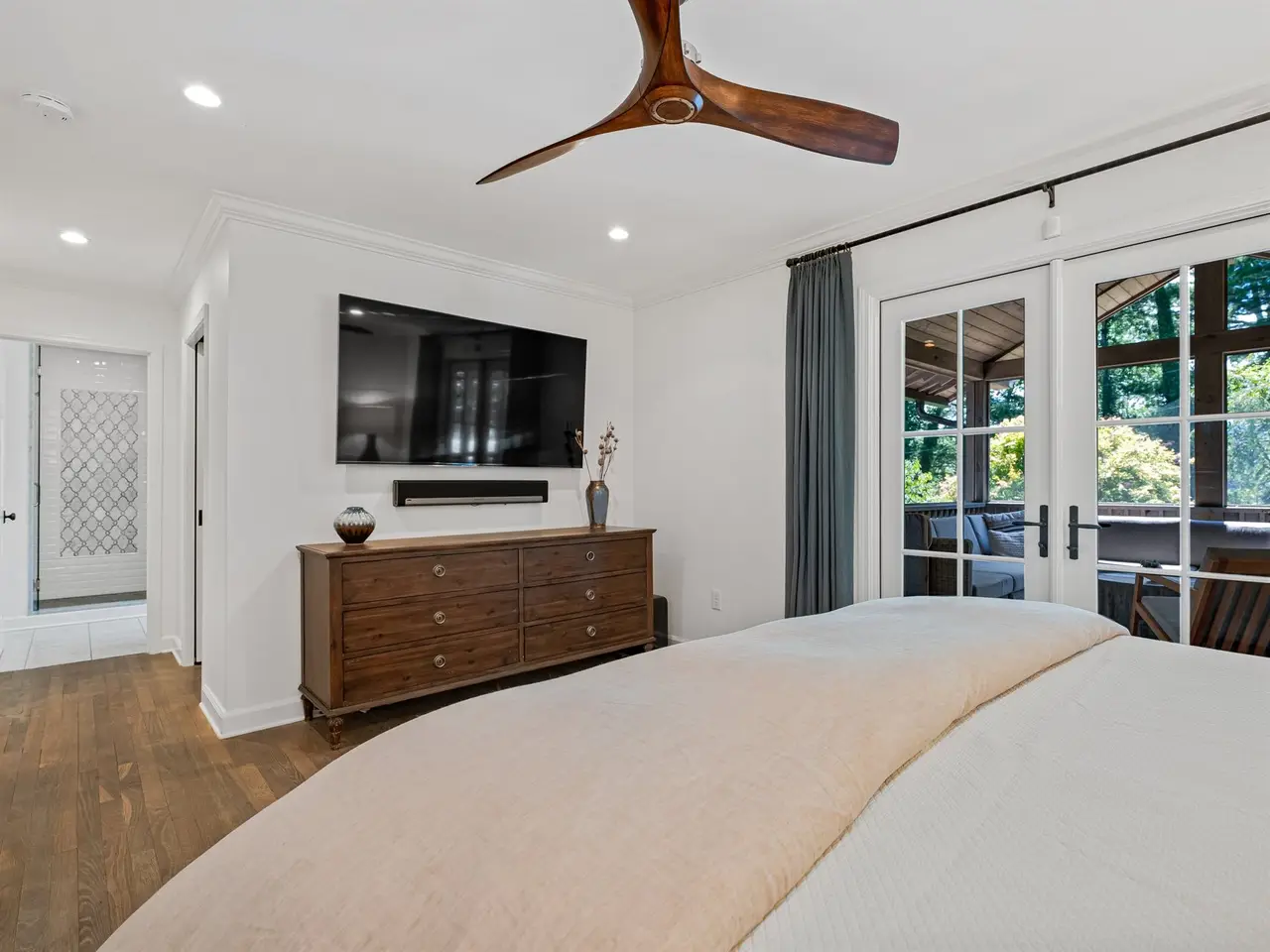 Don't miss this quintessential North Asheville remodeled and redesigned contemporary ranch style home. Enjoy this great location that backs up to the Country Club of Asheville Golf Course and is within an easy walk to the clubhouse. Wow, they thought of everything, will be your first thought when you walk in and see the open space with highly designed finishes and wall of French doors that bring the outdoor living room inside. Entertaining will be a pleasure in the open floor plan and custom kitchen with Thermador appliances, cleverly hidden outlets and rollout shelving. The primary suite is well appointed and walks out onto a private screened porch with a stone fireplace and ample room to relax or start your day. The bath has an oversized tub and beautiful walk-in shower, Carrara marble counters and accents. There are two additional ensuite bedrooms on the main level and a stylish powder room as well. The fully finished lower level has a full bath, bonus/theater room, built-ins and Jotul wood stove.