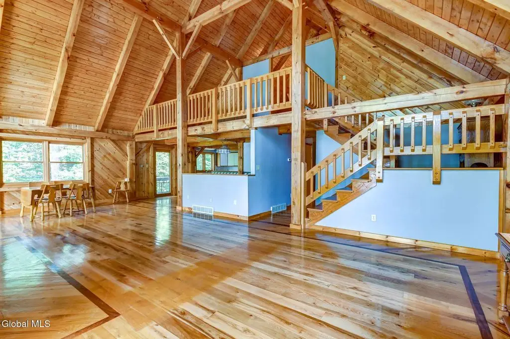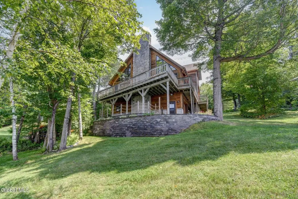 This exceptional 5-bedroom, 3-bath post-and-beam home offers 82.8 feet of direct lake frontage on the pristine Great Sacandaga Lake. With sweeping mountain views and unforgettable sunsets, it's the perfect year-round retreat. Located in low-tax Saratoga County, this 2,670 sq ft home features stunning oak floors with black walnut inlay, vaulted ceilings, and bright, open living spaces. The main floor includes a spacious primary suite with a walk-in closet, while the upper level boasts a large loft overlooking the lake, a dedicated office, three additional bedrooms, and a full bath. The walkout basement offers limitless potential - whether you're dreaming of a game room, gym, guest suite, or expanded living area. Just a short 30-minute drive to Saratoga Springs or Lake George. Dock included.