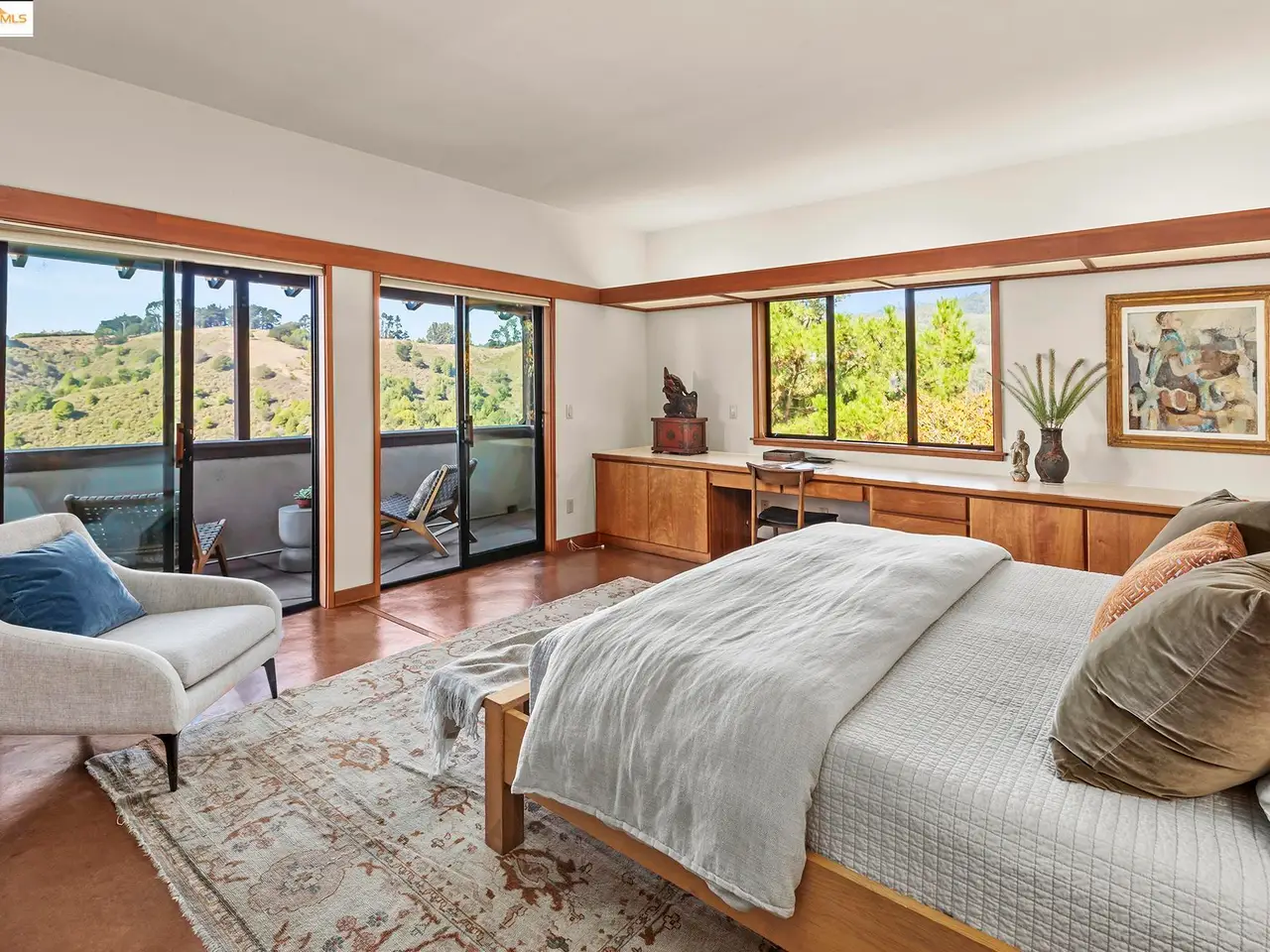 Set on a rare triple lot, together spanning just under an acre, at the end of a peaceful cul-de-sac, this expansive Japanese-influenced mid-century rebuild, offers privacy, volume & serene canyon & Bay views. Soaring double-height ceilings & integral color concrete floors define a dramatic, serene, modern interior with seamless indoor-outdoor flow. First time on the market, it is thoughtfully situated on the downslope with access directly into a 3-car garage. The 3 level design creates a strong connection to the landscape, with all levels being on grade. The main level features generous open living spaces, built-in cabinetry & a chef's kitchen. It has 3 beds and 2 ensuite baths on this level, plus a powder room. Expansive decks extend the living area and capture green and Bay vistas. An elevator services all levels, including a 1 bd. in-law with separate access, ideal for guests, multi-generational living or a creative retreat. This distinctive property blends architectural sophistication & modern comfort in one of Berkeley's most private & sought after settings. Easy access to freeways and parks.