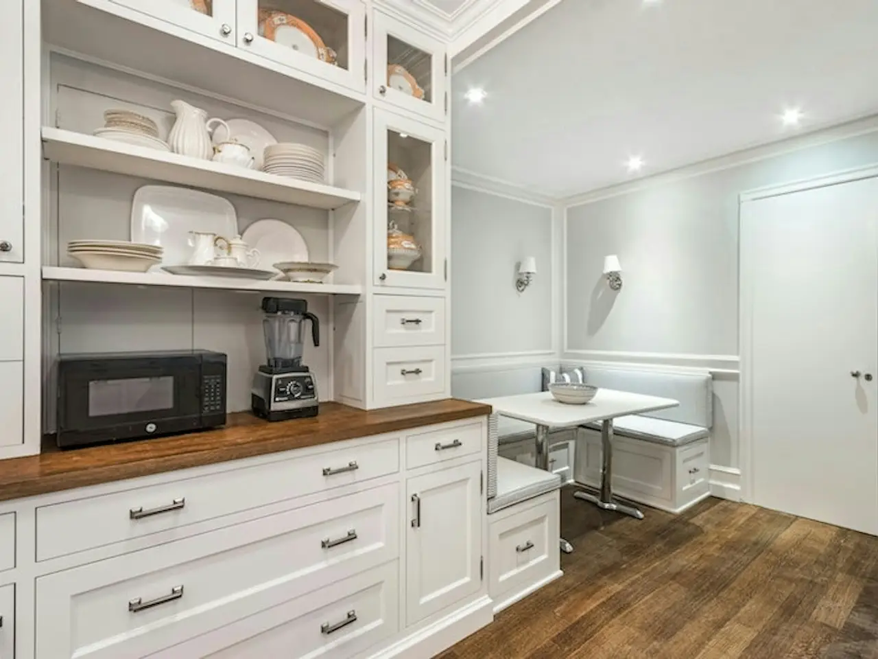 Renovated eat-in-kitchen with marble counters