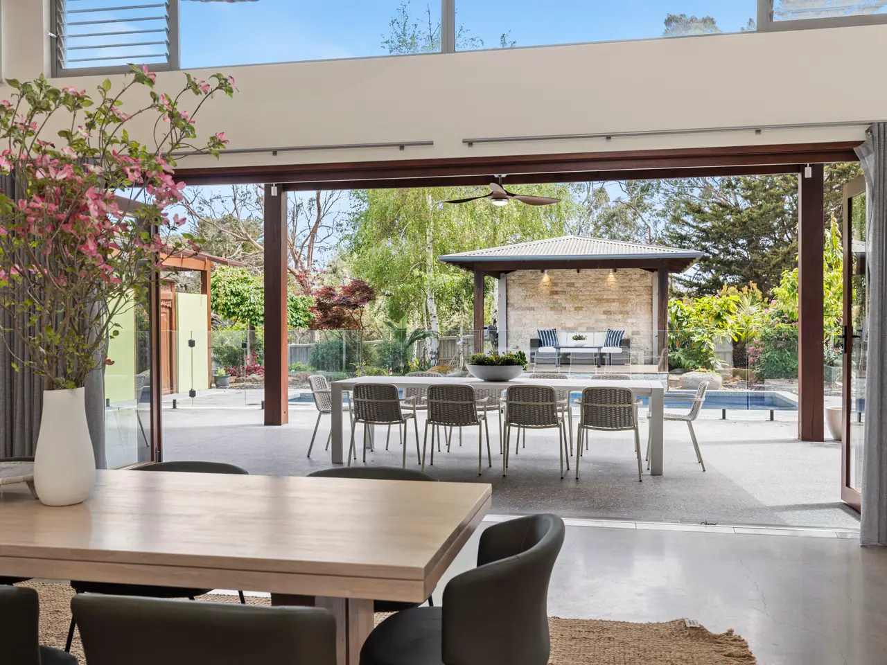 ~ Come and experience the lifestyle at 1 Cameron Way, Mt Eliza Saturday 8th November, 2-2:45pm, champagne and cheese tasting on arrival~ A masterfully executed blend of contemporary architecture and resort-style living, this exceptional c2011 residence showcases the very best of modern luxury. Distinguished by its environmentally conscious design, the home's deliberate north-facing orientation harnesses optimal natural light, while the thoughtful architecture works seamlessly with the site's natural conditions-evidence of the meticulous planning that defines this exceptional residence. The home's statement façade, rendered in sophisticated neutral tones and feature stone, sits beautifully within its leafy surroundings. Set back from the street via a private driveway, the substantial 1,937sqm (approx.) grounds reveal a landscape of genuine distinction. The recent professionally landscape designed gardens are a highlight in themselves: beautifully composed with specimen Japanese maples, ornamental pears, and layered subtropical plantings that evoke the tranquility of a serene retreat. Enter to discover gleaming polished concrete floors and an impressive sense of scale, as six-metre ceilings soar overhead and draw the eye toward the stunning centrepiece: a solar and gas-heated in-ground pool with integrated spa, beautifully appointed poolside pavilion, and sweeping entertaining terrace finished in newly laid premium polished concrete. The pool area has been enhanced with a new pump system and elegant waterfall feature, while frameless glass balustrades ensure uninterrupted views across the manicured landscaped gardens. The home's pavilion-inspired layout creates an effortless connection between indoors and out. Living spaces flow seamlessly through newly installed timber bi-fold doors to the magnificent alfresco area, where a timber Skillion ceiling and integrated fan provide comfortable shelter for entertaining on the grandest scale. This impressive outdoor space, with its generous polished concrete surface, becomes the natural gathering point for summer entertaining by the pool or relaxed evening occasions under the stars. The gourmet kitchen features Caesarstone benchtops throughout, centred around a substantial island bench with integrated sink and dishwasher, complemented by premium new Smeg built-in oven and convection microwave. A stylish wet bar with expansive wine storage sits adjacent, perfect for effortless hosting. The open-plan dining area and lounge, warmed by a new contemporary gas fireplace, connect to a separate rumpus and fully fitted theatre room, creating versatile spaces for family life and entertainment. The accommodation is thoughtfully zoned for privacy and functionality. The luxurious master suite occupies its own private wing, complete with walk-in robe, stone-appointed ensuite featuring double vanity, and a striking terrazzo bathtub positioned to overlook a secluded courtyard. Separately zoned, three additional generous bedrooms are serviced by a well-appointed family bathroom with separate powder room. A dedicated home office provides a quiet workspace, while a substantial laundry with rear access completes the practical layout. Recent substantial investment in premium infrastructure and finishes sets this property apart. A new hydronic underfloor heating system with contemporary boiler delivers luxurious warmth throughout the cooler months. A comprehensive automated irrigation system, recently installed throughout, ensures the gardens maintain their immaculate presentation year-round whilst expansive newly laid exposed aggregate pathways wind through garden rooms complementing this landscaped masterpiece. Energy-efficient LED lighting has been installed throughout, while comprehensive Crimsafe security screens and doors provide robust protection without compromising aesthetics. Security is further enhanced by a cutting-edge alarm system featuring night-time facial recognition capability, with access controlled via beautifully crafted custom wrought iron feature gates that make a striking first impression. Further appointments include reverse-cycle air conditioning, ceiling fans, plantation shutters, strategically placed highlight and louvre windows for natural ventilation, and a heavy-duty in-ground water tank. The double lock-up garage provides secure internal access and ample storage. Positioned among the Peninsula's most prestigious addresses, this exceptional property sits moments from Peninsula Grammar School and Toorak College, the boutique shops and cafes of Mount Eliza Village, and the pristine coastline of Moondah Beach. More than just a residence, this is a carefully crafted sanctuary offering year-round luxury living in one of the region's most sought-after locations.