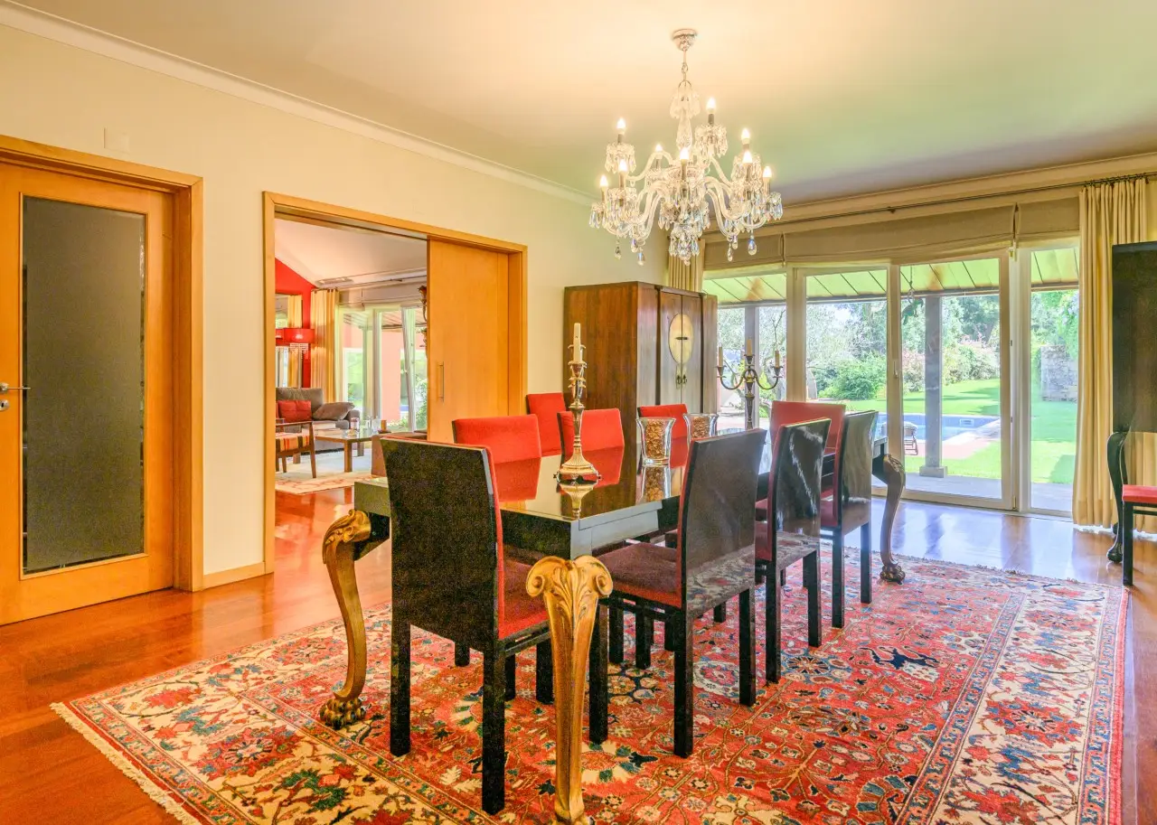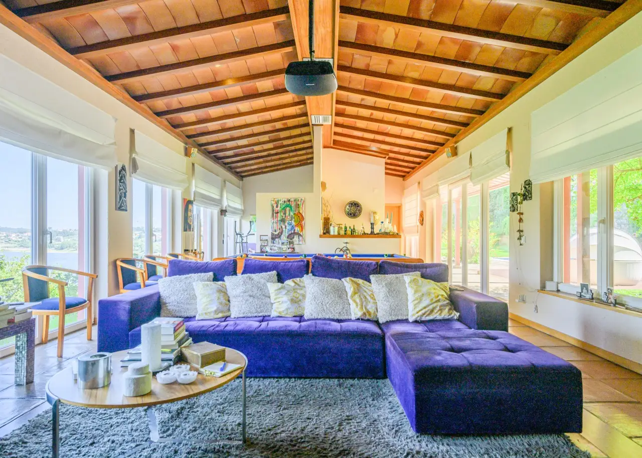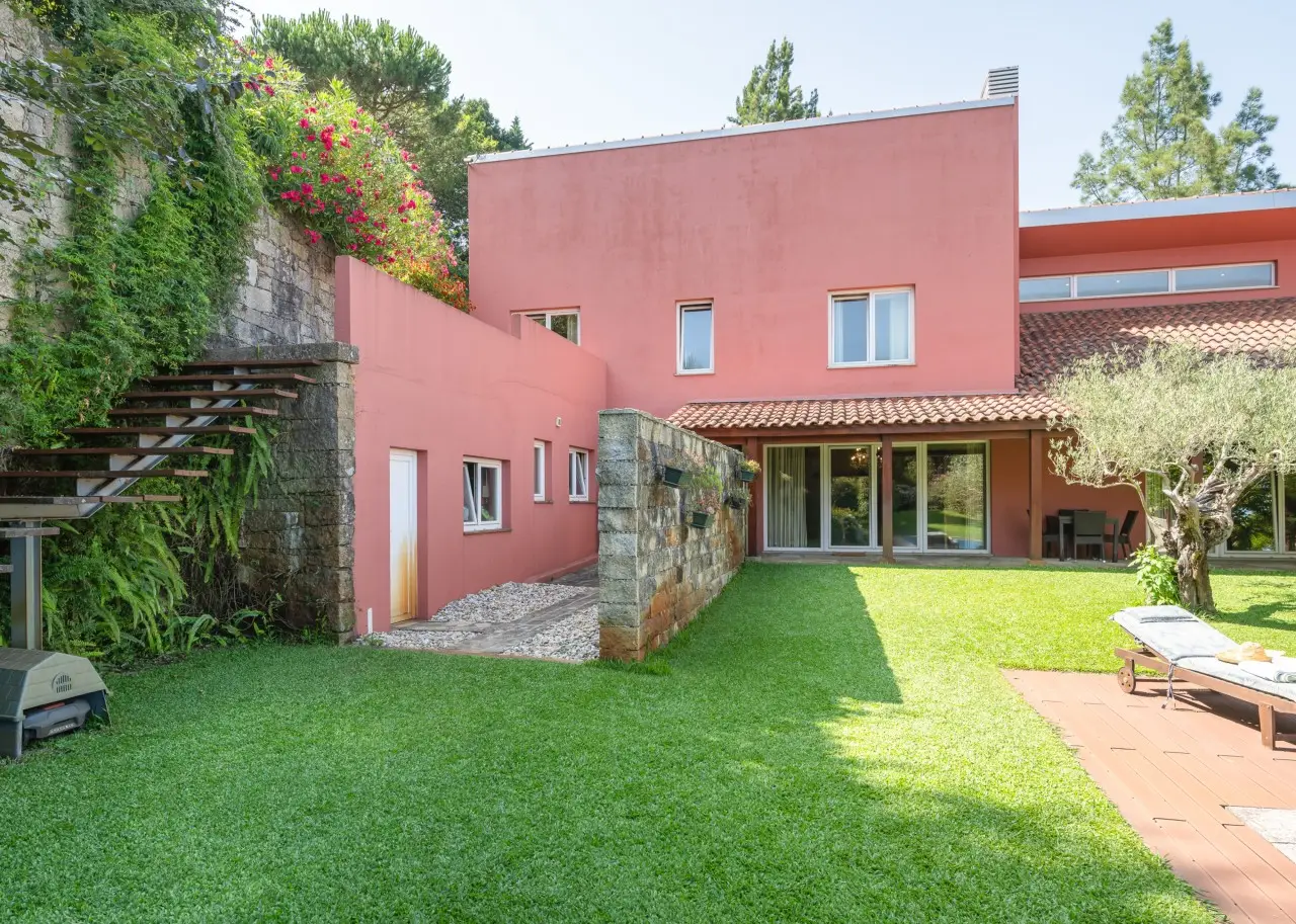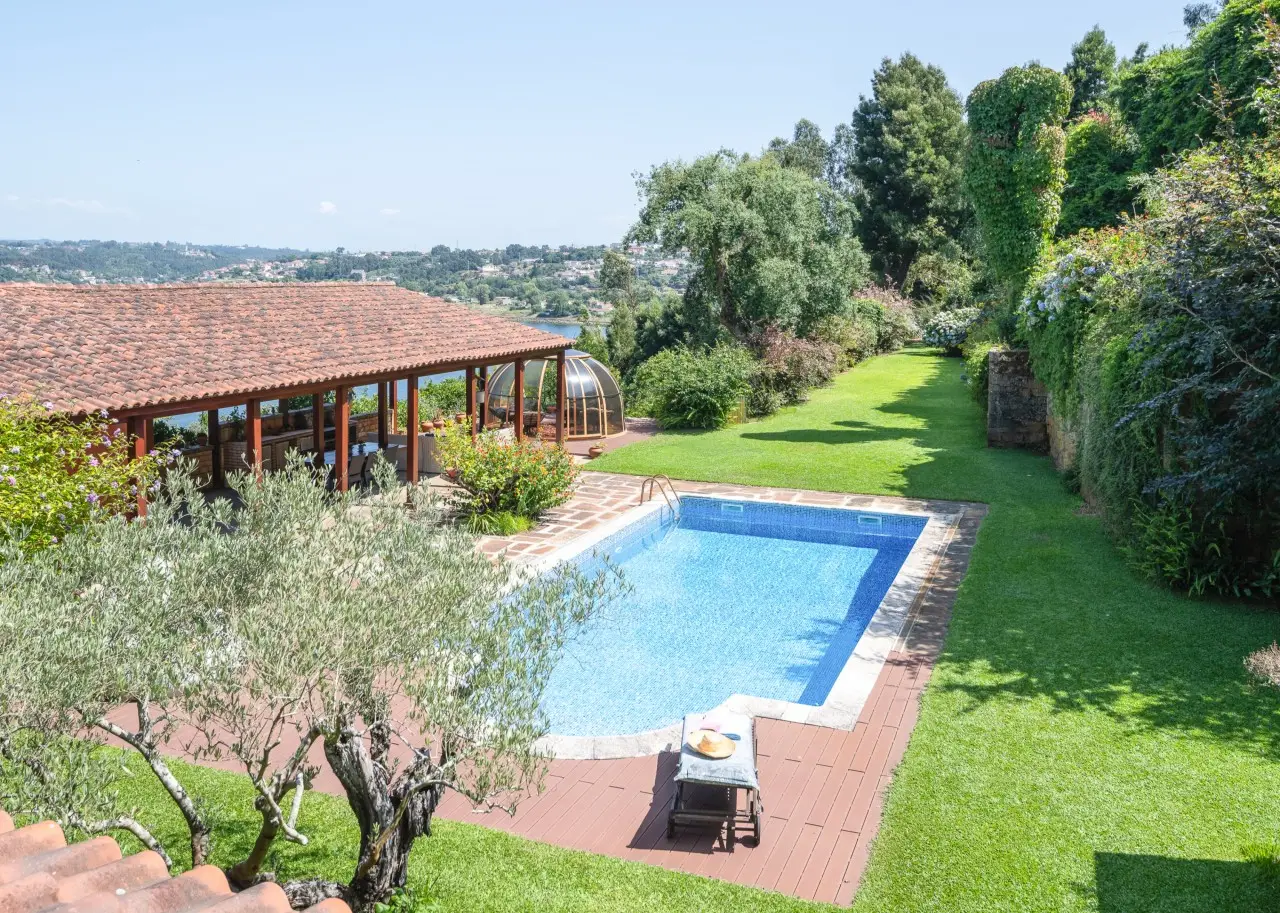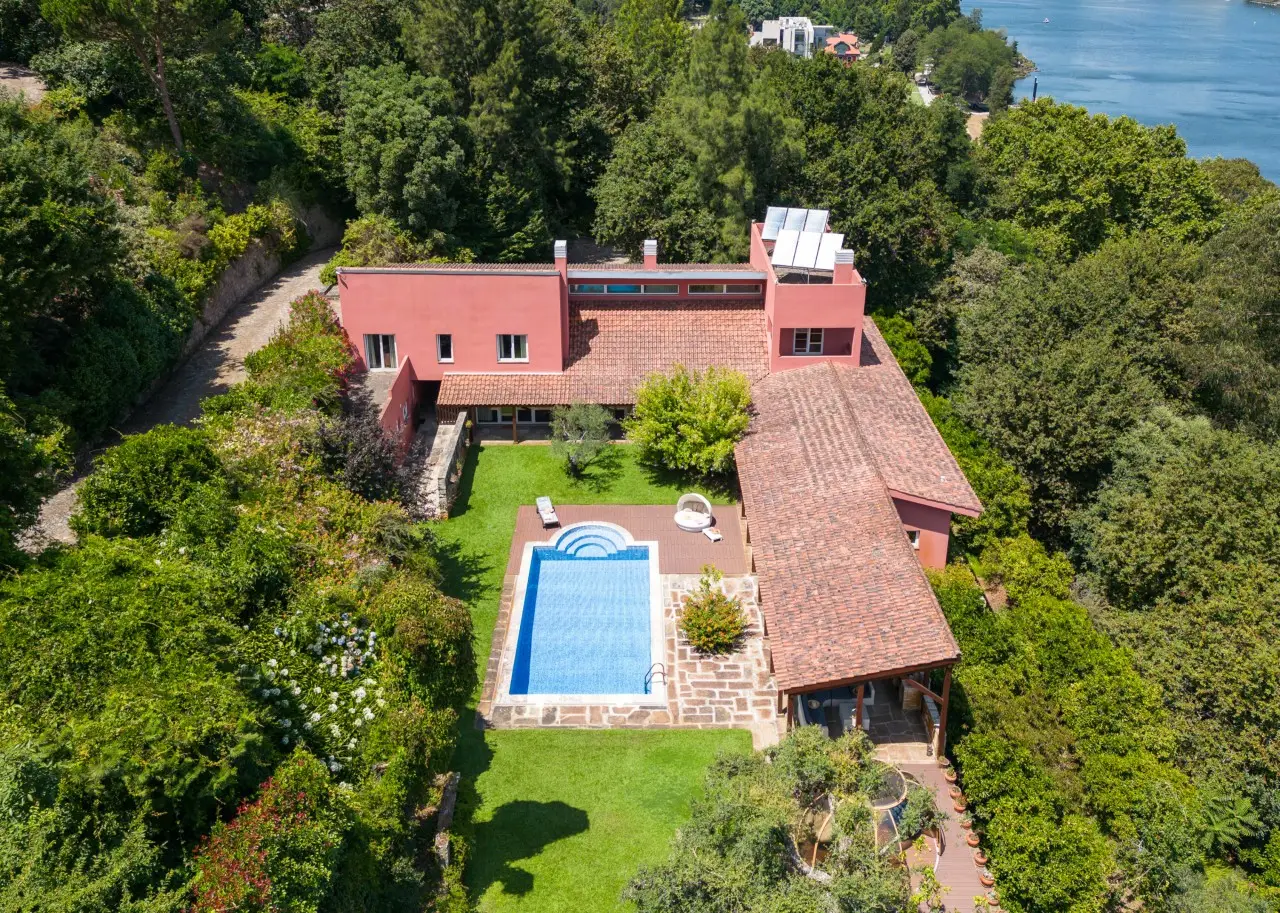 After crossing the access gates, we are enveloped by the woods that allow us to glimpse only the river, as far as the property boundary extends. The access path to the house confuses our senses. The feeling is that of being in some exotic paradise, and not at the gates of the cities of Gaia and Porto. it is more than a hectare of terraces that alternate between dense woods, mature gardens or fruit trees. The house surprises by its clean and straight lines, opening south to the extensive lawn where we find the pool and which anticipates the view of the immense river arm that seems to grow as we approach the limit of the landing on which we find ourselves. The distribution of the interior spaces was made in a fluid way and are organized in two levels. On the lower level we have the social areas that take special advantage of the direct communication with the surrounding garden. On the upper floor we find the bedrooms that benefit from the light and the unique views of the property. In the house, noble materials such as natural stone , floors and other carpentry in solid woods, Philippe Stark sanitary ware, thermal break frames and options such as the air conditioning system by ducts (air conditioning) stand out. We also find a gym area, sauna, garages, storage and other support areas essential to a property of these dimensions. CHARACTERISTICS: Plot Area: 12 282 m2 | 132 202 sq ft Deployment Area: 290 m2 | 3 122 sq ft Building Area: 556 m2 | 5 985 sq ft Bedrooms: 5 Bathrooms: 6 Garage: 4 Energy efficiency: B- FEATURES: River Views Garden Woodland Orchard Swimming pool