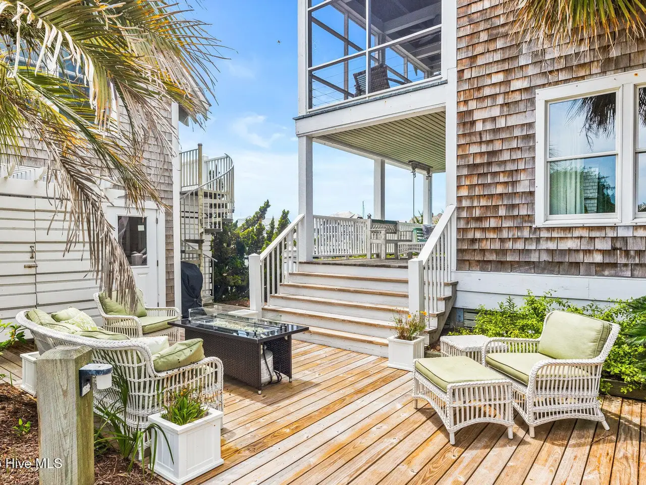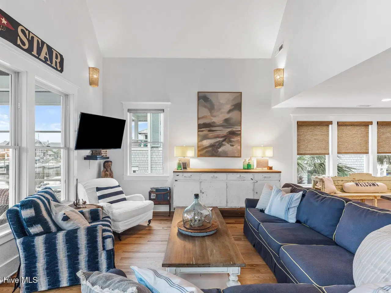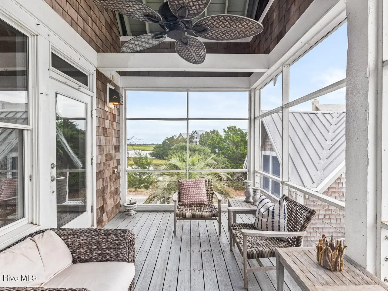 Coastal charm on one of the island's most iconic corners. At the meeting of Keelson Row and Transom Row, this Nantucket-style retreat offers front row views of the marina, sweeping saltwater marshes, and the daily rhythm of Bald Head Island. With 4 bedrooms and 4.5 baths total, the home spans just over 2,300 square feet and is designed for laid-back island living. The reverse floor plan makes the most of its elevated views. Upstairs, the vaulted living room opens to a screened porch where you can watch boats drift by and spot the beacon of Old Baldy. A renovated kitchen blends coastal character with modern function, creating a warm and welcoming flow throughout. On the main level, you will find two guest suites. One of which opens directly to a covered porch with a swinging bed that catches the breeze and invites long, lazy afternoons. Just outside, the wraparound front porch is lined with rocking chairs and offers a perfect perch to watch the island go by. A cozy fire pit patio just off the side adds one more spot to unwind. The top-floor primary suite is a true retreat with sweeping marsh views, a cozy reading nook, and a spacious walk-in shower. The crofter, accessed by a spiral staircase, offers two twin beds and a full bath for guests or flexible living space. Sold furnished and including two 4-passenger golf carts, this home offers a front porch lifestyle made for slow mornings, sunset views, and timeless island memories.