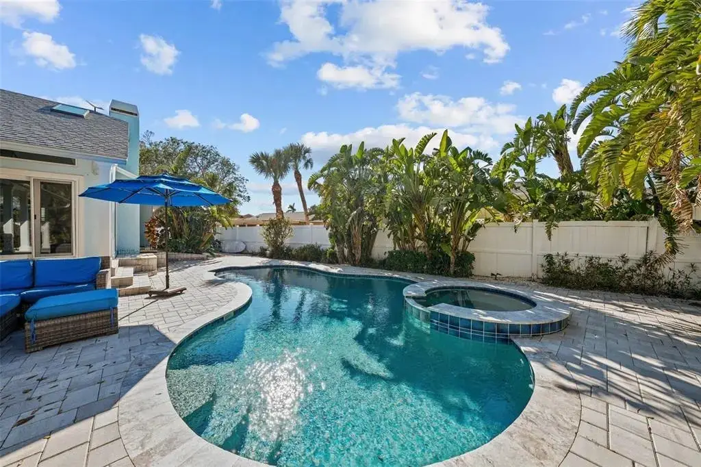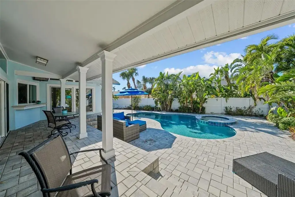 Welcome to this exquisite Tropical Paradise in Tierra Verde. Situated on over a quarter of an acre, this four-bedroom residence features a freeform pool with spa and a private sport court. Host gatherings for friends and neighbors with activities such as basketball games, morning yoga sessions, or convert the space into a private pickleball court. Upon entering, you will be greeted by a grand foyer leading to formal dining or living areas, all seamlessly connected to the covered lanai. To the left, a spacious gathering room encompasses an updated open kitchen with a breakfast bar, providing ample space for movie nights or game nights. This room is enhanced by a fireplace and several cozy reading nooks, flooded with natural light from skylights in the vaulted ceilings and sliding doors that open to the pool and lanai. The split bedroom layout ensures privacy for the Primary Suite. This luxurious retreat includes a large bedroom with sliding doors to the pool and patio, an ensuite bath with a double vanity, walk-in shower, and water closet, as well as a walk-through closet with custom built-ins for efficient storage. The second and third bedrooms, located on the opposite side of the home, share a hall bath with a double vanity and a tub with a shower. The fourth bedroom, featuring a private exterior entrance, serves as an ideal home office, fitness room, or guest space. Natural light permeates the entire home through expansive windows, sliding doors, and skylights, further accentuated by vaulted ceilings. The wide driveway and attached two-car garage provide ample parking and storage solutions, with space for bikes and beach toys. Additionally, the garage is equipped with an EV charger and an adjacent laundry room. Residents can store or rent a boat at Tierra Verde Marina, enjoy dining at Island Grill, or watch the sunset with cocktails at the rooftop bar, all within walking distance. Tierra Verde, an island community at the southern end of Pinellas County, offers easy access to the natural shoreline and pristine beaches of Ft. DeSoto Park, bicycle trails, and the interstate. It is conveniently located a few minutes from Downtown St. Petersburg, thirty minutes from Tampa International Airport, and a short drive south across the Skyway Bridge to Bradenton, Sarasota, and beyond