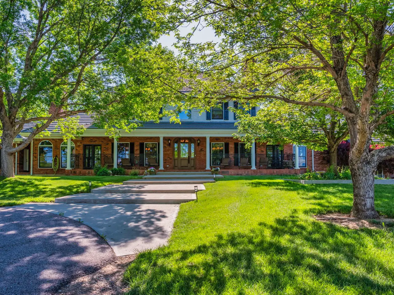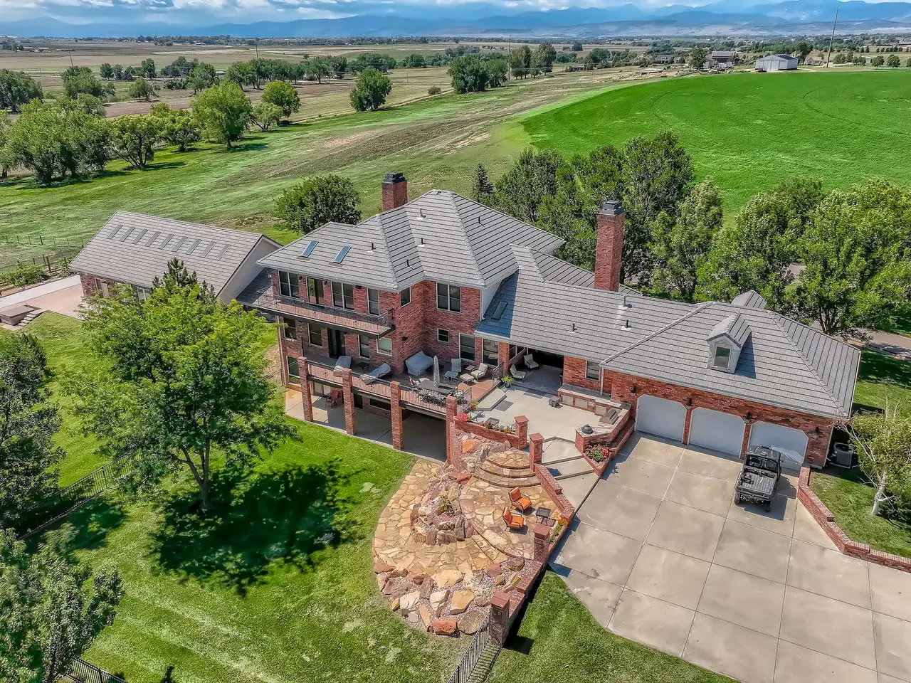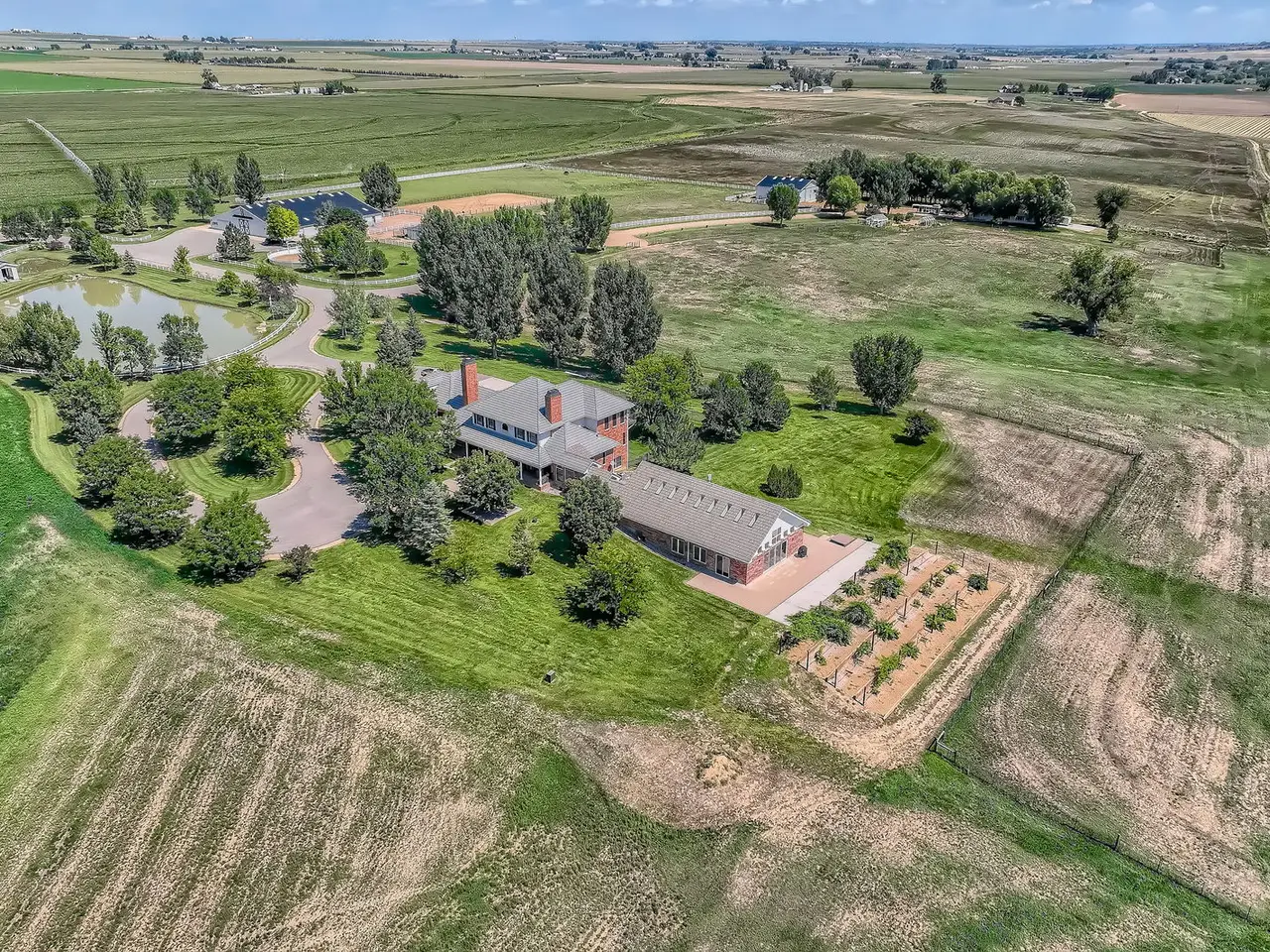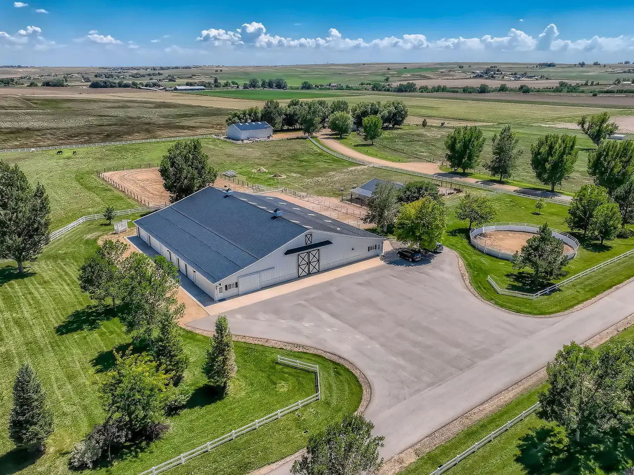 Refined Country Living near Berthoud, Colorado. Welcome to a rare equestrian paradise where luxury and wide-open freedom unite. Spanning 75 acres of pristine countryside, this extraordinary ranch estate is designed for both world-class horse enthusiasts and lovers of refined rural living. A tree-lined driveway leads you to the heart of the property; a stately colonial residence, blending rustic elegance with modern comfort. Soaring ceilings, reclaimed wood floors, walls of glass framing panoramic views and hand-selected natural materials and custom finishes create a warm, elevated aesthetic in this multi storied home. Multiple fireplaces, a chef's kitchen, and spacious entertaining areas invite gatherings both intimate and grand. Where evenings begin and stories unfold - the custom-built bar is a showpiece of Western elegance, wrapped in rich detailed wood carvings and just steps away, a wine room cradles your private collection. Each of the home's three spacious bedrooms is a retreat, showcasing warm wood tones, serene views of the surrounding landscape and handcrafted details in each of the private bathrooms. Thoughtful design and luxury converge to create restful spaces that feel both timeless and inviting. For the equestrian, the ranch features a fully equipped state-of-the-art barn with oversized stalls, tack rooms, grooming stations, an apartment/guest cottage perfect for a ranch hand or an ADU, and a professional-grade riding arena. With the Rocky Mountains just a few miles away, the possibilities for riding and exploration are endless. Additional highlights include an indoor pool, seven outbuildings, private pond, pivot sprinkler, Handy Ditch water rights valued at $1,080,000, expansive outdoor living spaces, and meticulously landscaped gardens. With its unobstructed mountain views, the spaciousness and serenity of the property, this estate is the Yellowstone Ranch of Colorado.