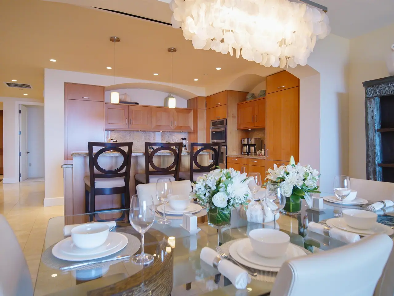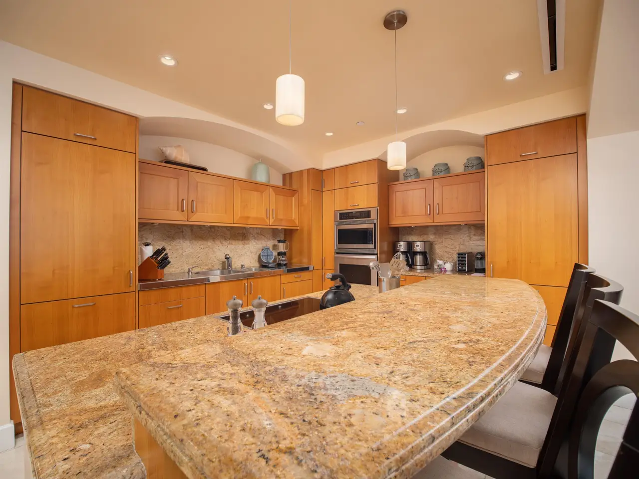 Welcome to Wailea Beach Villas J505! This spectacular, rarely available top-floor, 3-bedroom, 3-bath penthouse unit offers direct west-facing views of the ocean, Molokini, Kaho‘olawe, Lanai, and breathtaking sunsets. Featuring over 2,000 square feet of luxurious indoor and outdoor living space, J505 provides an ideal setting for upscale oceanfront living. The primary suite offers stunning ocean views, an ensuite bathroom, and a walk-in closet. The additional guest bedrooms are spacious and inviting. Elegantly furnished with modern designer decor and high-end finishes, including travertine flooring, marble and granite countertops, and a gourmet Studio Becker kitchen with top-of-the-line appliances such as Sub-Zero and Gaggenau. This residence includes a reserved parking space with extra storage for your personal items and beach gear. Wailea Beach Villas is hotel zoned, gated with 24/7 security, and features beautifully landscaped gardens, glowing tiki torches, waterfalls, and two heated pools—one for adults and one for families. Additional amenities include outdoor spas, meeting rooms, a billiards game room, and a business center. Located near world-class dining, boutique shopping, tennis, and championship golf courses, this exceptional residence embodies the ultimate Maui lifestyle.