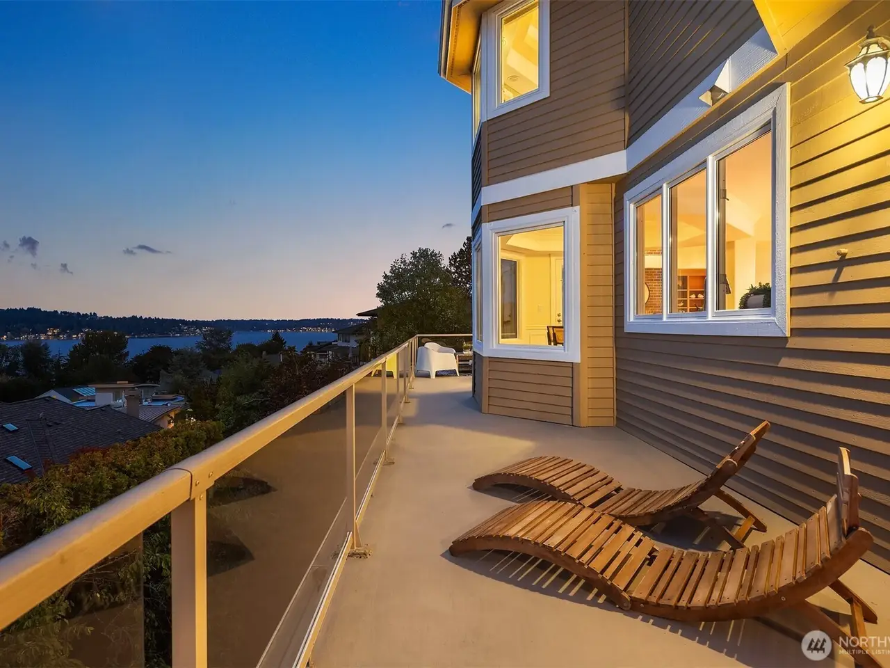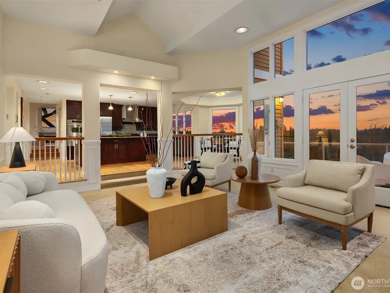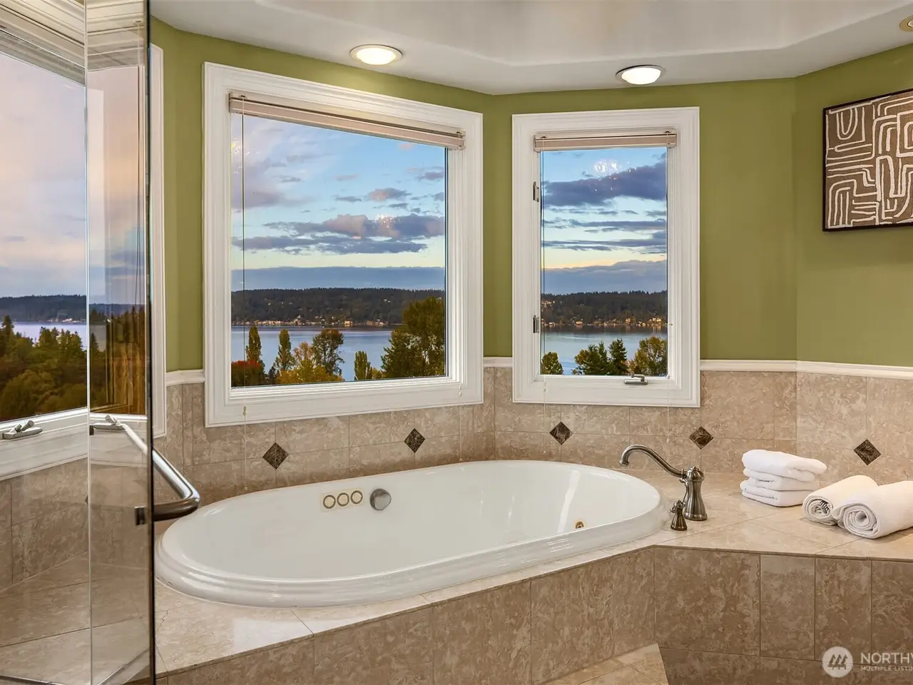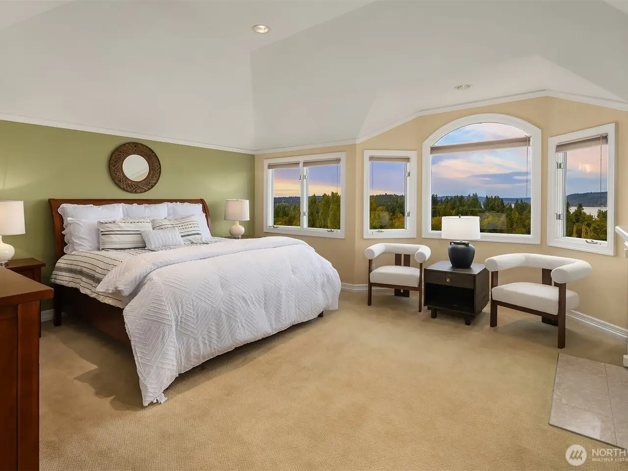 Perched above Lake Washington in highly desirable Inverness neighborhood, this NW contemporary residence showcases stunning panoramic views from nearly every room. Sunlight fills open-concept living spaces through expansive floor-to-ceiling windows & soaring ceilings. Timeless layout flows from elegant living room to formal dining room. Gourmet kitchen opens to spacious family room. Upstairs, luxurious primary suite & additional en-suite bedroom. Lower level offers generous bonus room, 3 view-filled bedrooms & 2 more baths. Extensive millwork & built-ins throughout. Enjoy expansive view decks & low-maintenance private backyard. Dual-zone HVAC, 5 gas fireplaces & 3-car garage. Close to B-G Trail, parks, Seattle Children's, U Village & UW.