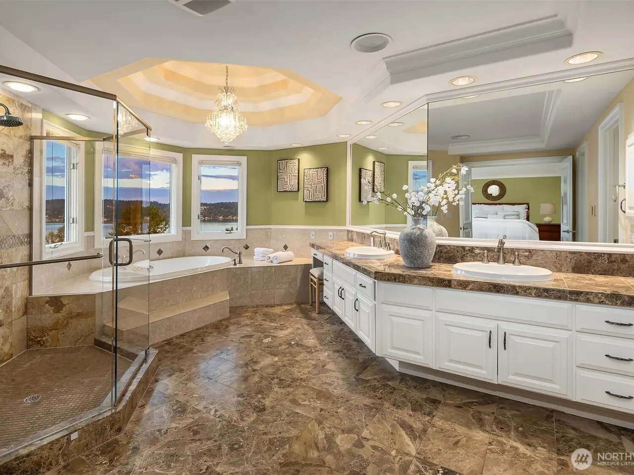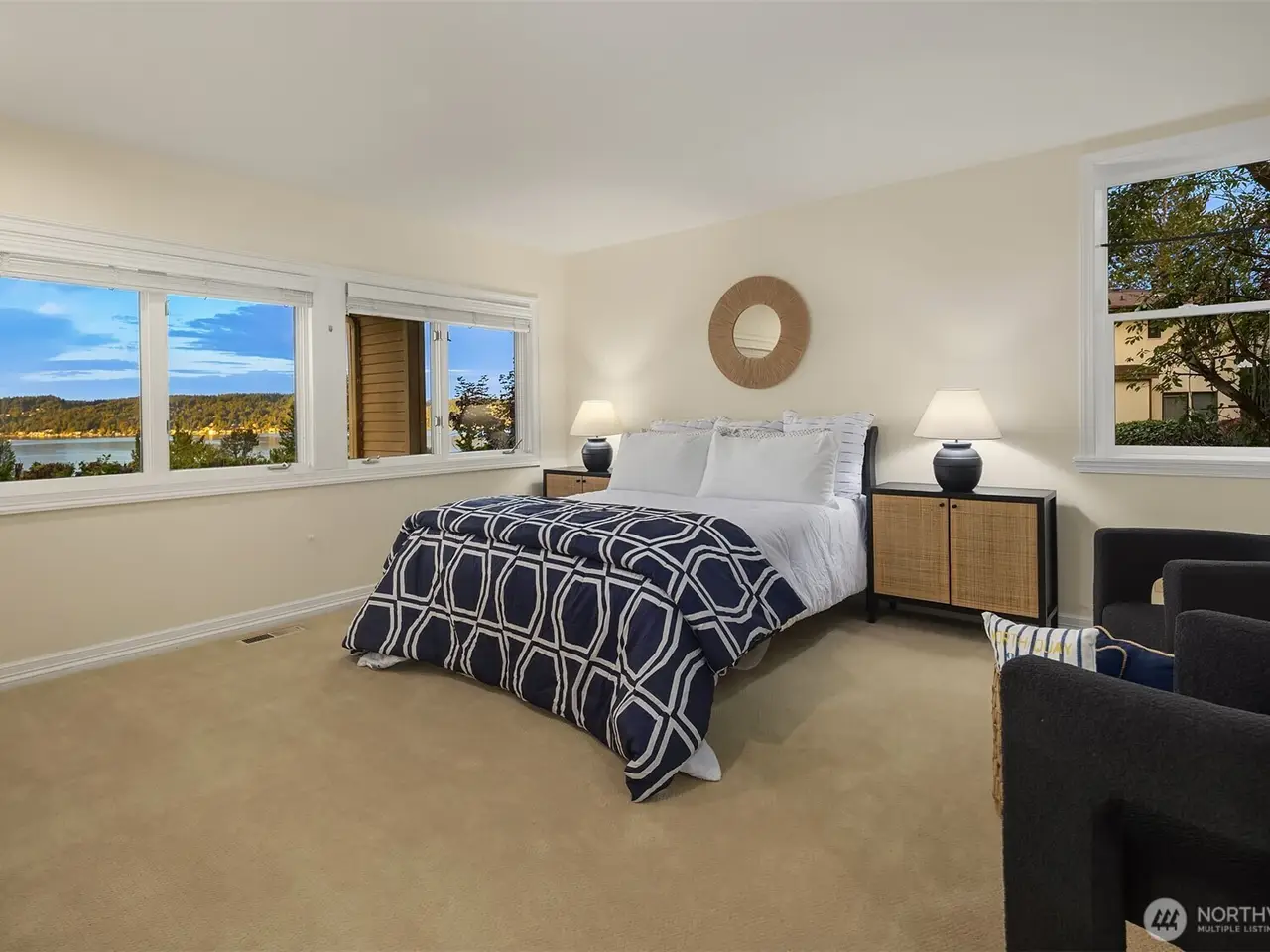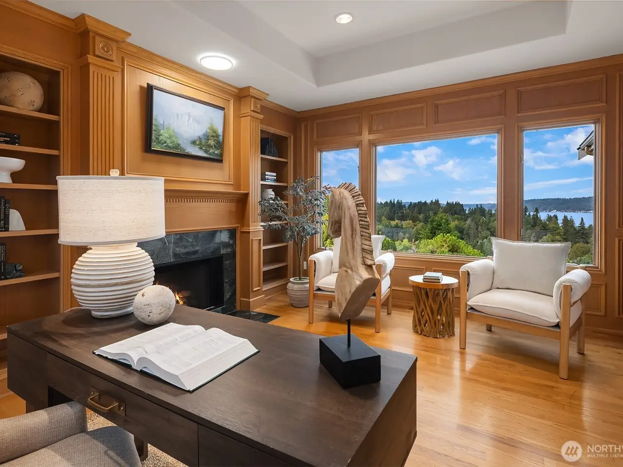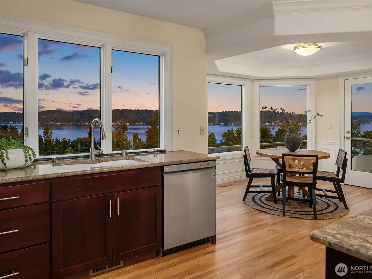 Perched above Lake Washington in highly desirable Inverness neighborhood, this NW contemporary residence showcases stunning panoramic views from nearly every room. Sunlight fills open-concept living spaces through expansive floor-to-ceiling windows & soaring ceilings. Timeless layout flows from elegant living room to formal dining room. Gourmet kitchen opens to spacious family room. Upstairs, luxurious primary suite & additional en-suite bedroom. Lower level offers generous bonus room, 3 view-filled bedrooms & 2 more baths. Extensive millwork & built-ins throughout. Enjoy expansive view decks & low-maintenance private backyard. Dual-zone HVAC, 5 gas fireplaces & 3-car garage. Close to B-G Trail, parks, Seattle Children's, U Village & UW.