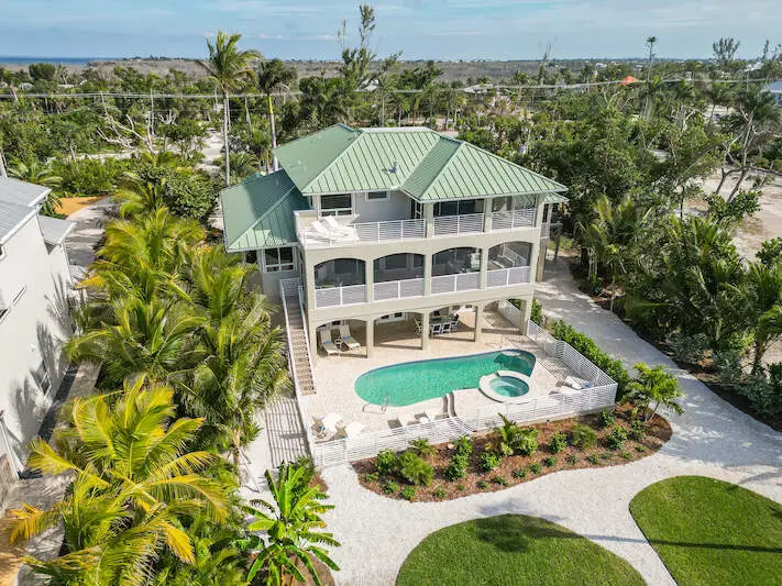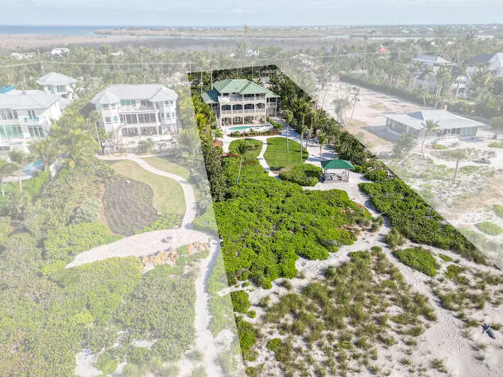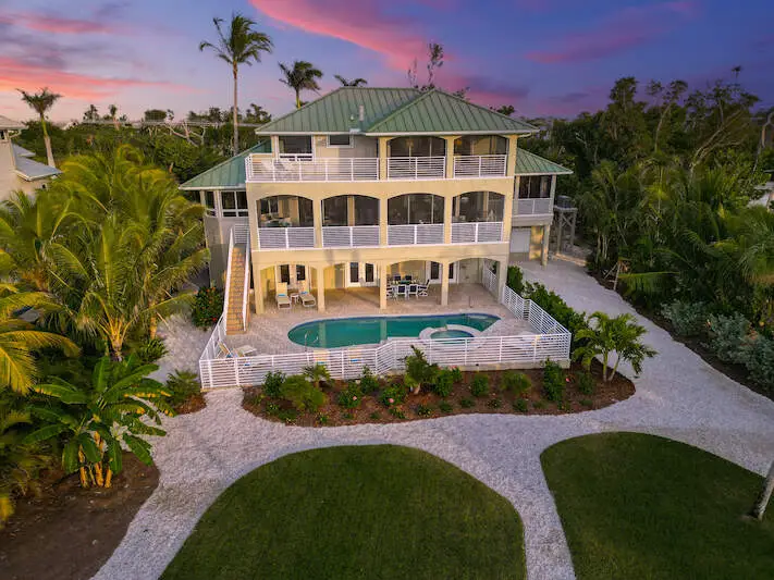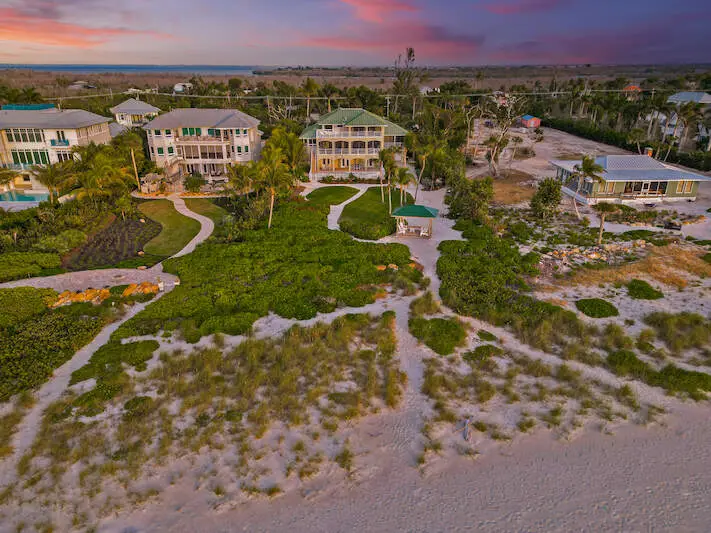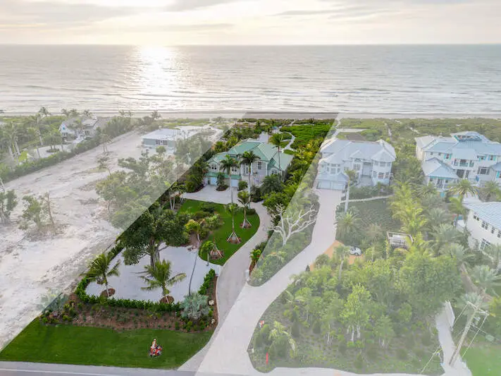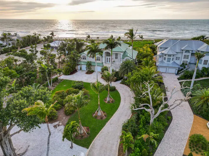 SOUTH HAVEN - Experience unparalleled tropical luxury at South Haven, a meticulously designed concrete piling home that seamlessly blends elegance and functionality. Recent enhancements include a fully remodeled kitchen, dining room, and primary bath, along with a 2023 roof replacement and premium finishes throughout. The main level features a sunlit foyer, guest accommodations, and dual guest retreats in a private wing. The redesigned kitchen boasts modern amenities and a bright dining nook, while the living room offers sweeping coastal views. Upstairs, the owner's suite captivates with Gulf of Mexico vistas, a stone-clad electric fireplace, and sophisticated woven flooring. The ground level includes a spacious garage and versatile spaces, all accessible via an elevator serving every level. Outside, Royal Palms frame the exquisitely designed pool area, complete with a sunbathing platform, covered dining, and lounging spaces. A beachside yard features a private cabana, landscaped greens, and a serene walkway to the shore. South Haven is the ultimate coastal retreat, offering exceptional craftsmanship, lush surroundings, and unforgettable sunsets.