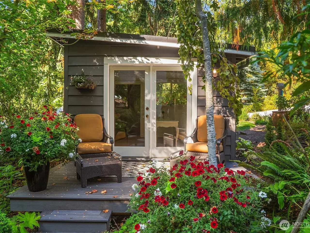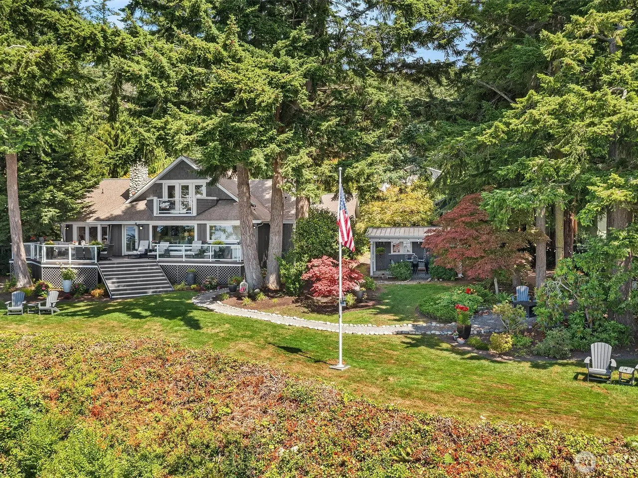 Set among lush gardens and framed by evergreens for privacy, this special home has desirable features around every corner. Understated luxury combined with privacy and unobstructed western views of Saratoga Pass, Olympics, and marine traffic. Designed for single-level living, the interior showcases thoughtfully designed spaces, new Wolf appliances (including micro), panel ready fridge, wine fridge, new roof, detached office, cottage shed, and huge deck together with multiple areas to relax and enjoy the yard. Enjoy the beach access footsteps away. 2 bedrooms + additional guest room. Carport and detached shop complete with a media lounge! Cross the bridge to Camano and feel the retreat vibe of the island-full time or part time. .