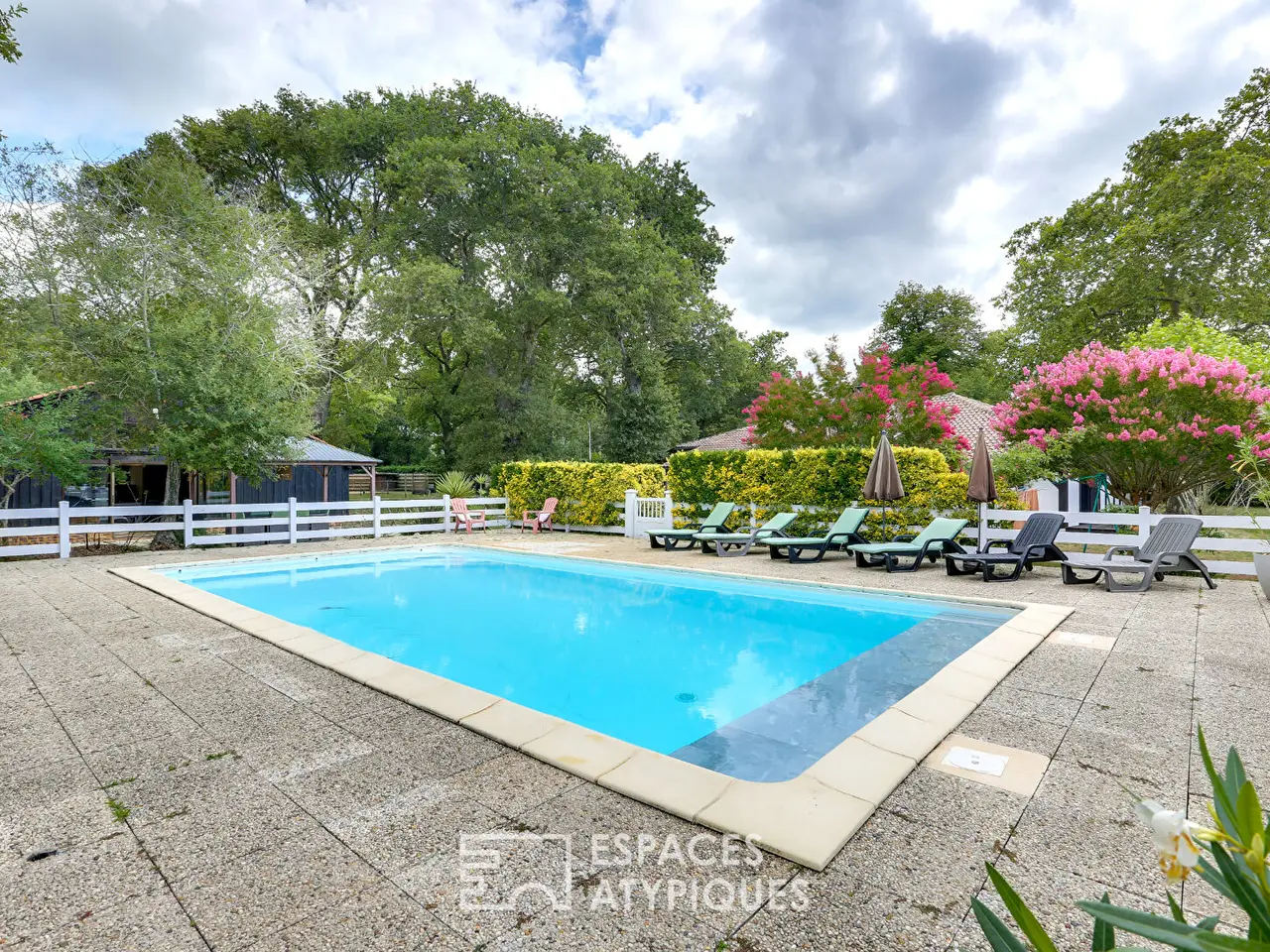 Less than ten minutes from the ocean beaches, this unique airial dating from 1850 displays all the charm of a carefully renovated character property. Set on a vast wooded plot of 6,778 m2, this estate consists of two independent single-story houses: a resolutely Landes-style main house with 169 m2 of living space and a renovated old barn of 91 m2, totaling eight bedrooms. A swimming pool, century-old oak trees and a petanque court complete this rare ensemble. Both homes offer generous volumes and a warm atmosphere, enhanced by a quality renovation combining authenticity and contemporary comfort. Exposed beams, brick walls, solid wood joinery, every detail tells the story of the place while ensuring functionality and aesthetics. The main house includes a bright and welcoming living space, four bedrooms, and elegantly appointed bathrooms. The fully independent cottage offers the same comforts, allowing for perfect flexibility depending on the project. The meticulously maintained landscaped grounds are a true haven of peace. The swimming pool, the heart of the property, offers a refreshing escape amidst the vegetation. The petanque court, nestled in the shade of the trees, extends the art of outdoor living. Located in the immediate vicinity of the village of Azur, the property is close to shops, schools and all amenities, in a privileged natural environment. With its unique character, its multiple possibilities of use and its remarkable energy performances (DPE A for the gite and DPE B for the main house), this Landes property seduces with its authenticity and its potential. REF. 12287EALDAdditional information* 14 rooms* 8 bedrooms* 1 bathroom* 3 shower rooms* Outdoor space : 6778 SQM* Property tax : 1 515 €Energy Performance Certificate Primary energy consumptionb : 67 kWh/m2.yearHigh performance housing*A*67kWh/m2.year2*kg CO2/m2.yearB*C*D*E*F*G Extremely poor housing performance* Of which greenhouse gas emissionsa : 2 kg CO2/m2.yearLow CO2 emissions*2kg CO2/m2.yearA*B*C*D*E*F*G Very high CO2 emissions Estimated average annual energy costs for standard use, indexed to specific years 2021, 2022, 2023 : between 880 € and 1270 € Subscription Included Agency fees The fees include VAT and are payable by the vendor Mediator Mediation Franchise-Consommateurswww.mediation-franchise.com29 Boulevard de Courcelles 75008 ParisInformation on the risks to which this property is exposed is available on the Geohazards website : www.georisques.gouv.fr