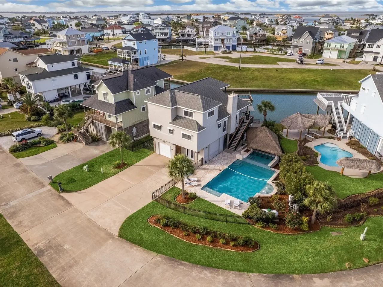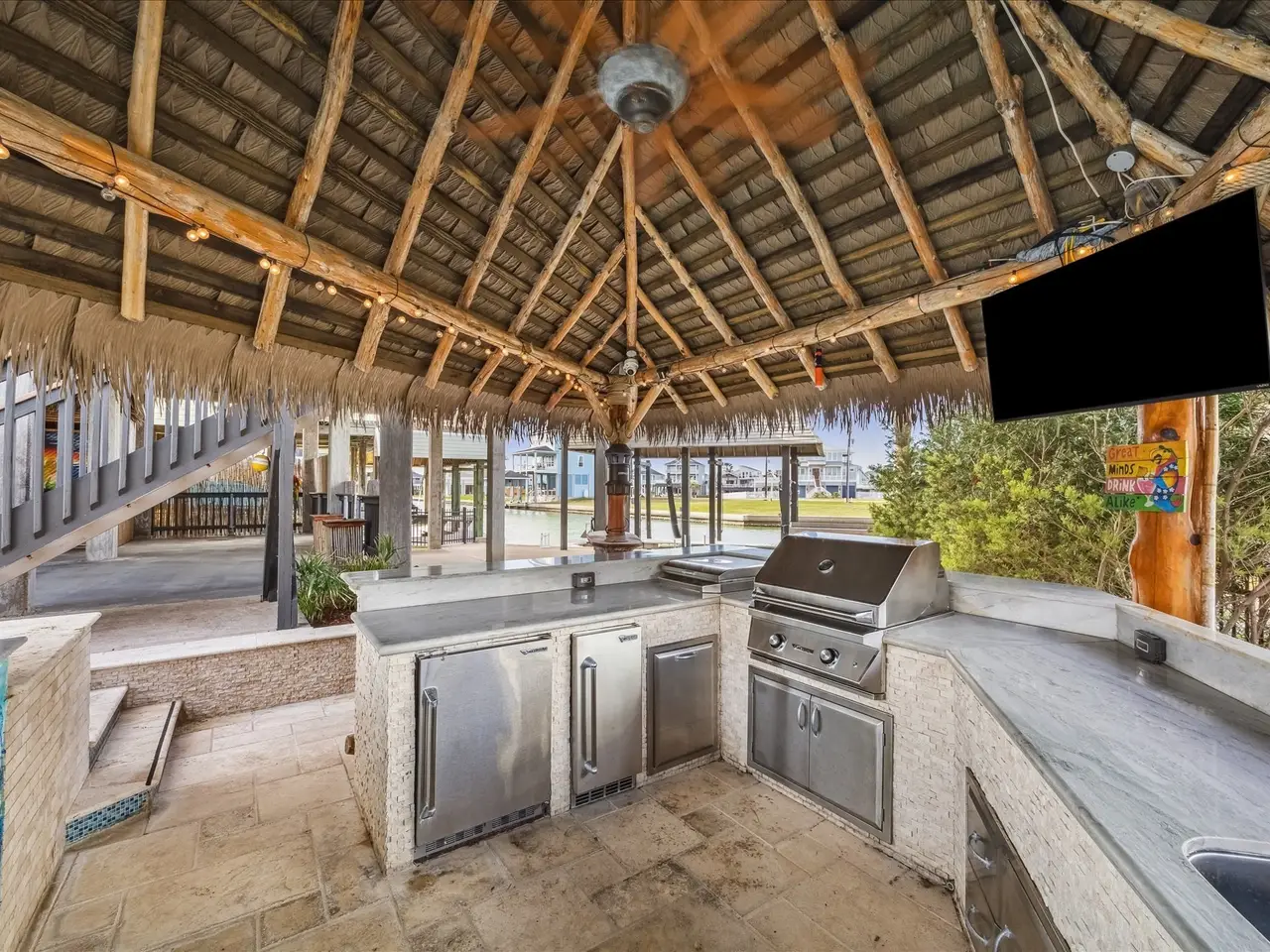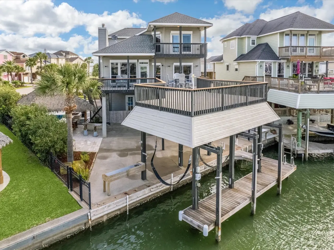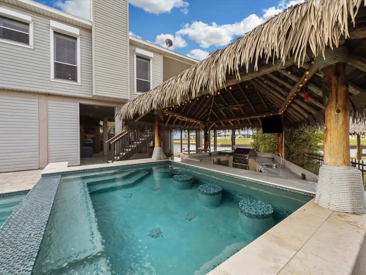 Experience waterfront living at its finest in this stunning Tiki Island home with breathtaking bay views and direct water access. Set on a spacious canal lot, this property is a dream for boating and fishing enthusiasts, with deep-water canal access to West Galveston Bay. The outdoor space features a heated pool with a swim-up bar, a recently updated synthetic Coastal Shade palapa (2023), and a fully equipped summer kitchen, perfect for entertaining. Inside, the home boasts high ceilings, wood floors, and a spacious kitchen. The oversized primary suite offers a private retreat with an ensuite bath and large walk-in closet, while three guest bedrooms ensure ample space for visitors. Thoughtful updates make this home move-in ready. Located in the exclusive Tiki Island community, this home is ideal for both vacation and full-time coastal living, just minutes from Galveston. Enjoy boating, fishing, swimming, and creating lasting memories in this one-of-a-kind home. All per Seller.
