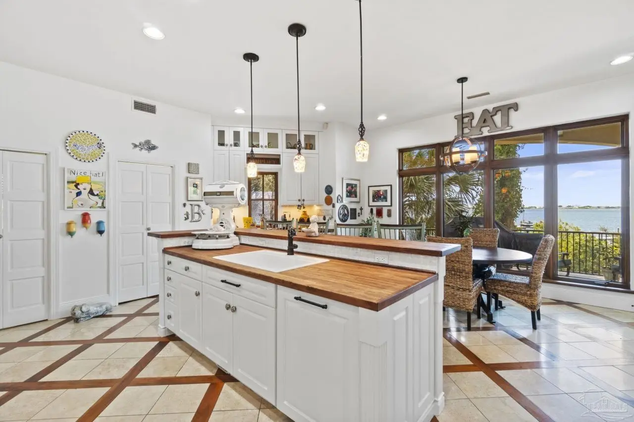 This elegant waterfront French Country home provides a panoramic view of Pensacola Sound and breathtaking sunrises and sunsets. From the courtyard and stacked stone/stucco facade to the end of the boat house and dock with boatlift, you will appreciate the construction and attention to detail. Dramatic travertine floors inlaid with a walnut accent extend into the hallway and kitchen. The 2 story vaulted living room ceiling and beams provide visual interest and large natural wood beams accent the ceilings in the entry, living room, dining area and master suite. The view of the Sound is enhanced by the windows, French doors and balconies facing south. Both the living and dining rooms enjoy the fireplace with custom stone surround, wall sconces, and custom cabinetry. The master bedroom with a 20' ceiling overlooks the water. The spacious master bath features a double vanity area, designer fixtures, built-in cabinetry, a spacious shower and a freestanding tub. The separate his and her closets are walk-in, one has a cedar closet and attic access for additional storage. The kitchen shows chef's level high end appliances and a large kitchen island provides abundant work space and bar style seating. The wet bar and ice maker add to easy entertaining. A small office space is perfect for a computer work station. Note the dramatic beauty of the library/office with 8' double entry doors from New Orleans and a dramatic coffered ceiling. The large laundry houses a second refrigerator. The elevator or the stairway lead upstairs to the bedrooms have walk-in closets and full baths. A private sitting area overlooks the living room, and could be converted into a 4th bedroom. The Geothermal A/C units, ICF construction and Icynene insulation keep this space (and the entire house) cool and quiet. Enjoy the huge 4 car garage! Fifty-four concrete pilings add stability and safety to the home.