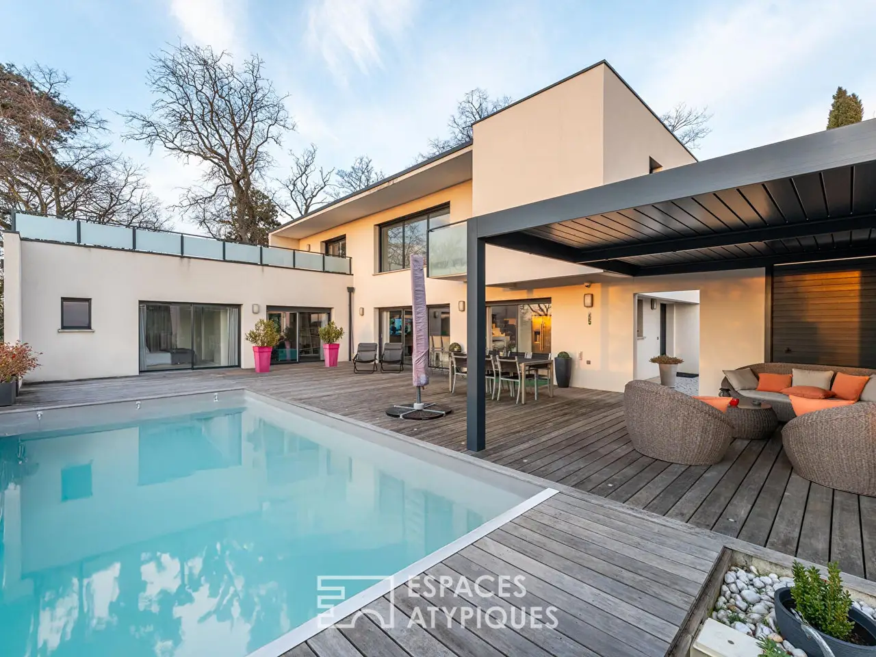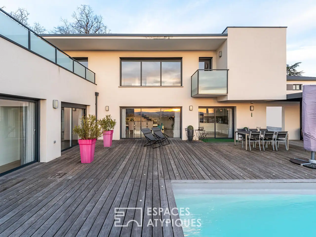 Nestled in the heart of the prestigious town of Limonest, this contemporary villa of approximately 300 sqm offers a privileged living environment, combining modernity and comfort. Built on a landscaped plot of 1,020 sqm, it benefits from a breathtaking view of the sunset and the Monts du Lyonnais. From the entrance, you will be seduced by the generous volumes and the omnipresent light, enhanced by large bay windows adorning the facades. The ground floor opens onto a vast living area composed of a lounge, a dining room, and a fully equipped open-plan kitchen. This space extends harmoniously towards a wooden terrace with a heated swimming pool, ideal for relaxing moments outdoors. The ground floor also includes a spacious master suite with a dressing room and shower room, a laundry room, and a very large garage. Upstairs, the sleeping area consists of four spacious bedrooms, two of which have access to large terraces offering breathtaking views. These bedrooms share an elegant bathroom. The landscaped garden, a veritable green setting, is home to a swimming pool perfectly integrated into the environment. A bioclimatic pergola completes this outdoor space dedicated to relaxation and leisure. Ideally located in the immediate vicinity of amenities and renowned schools, this villa represents a rare opportunity in the Limonest area. ENERGY CLASS: D / CLIMATE CLASS: D REF. 9585-1 Additional information * 6 rooms * 5 bedrooms * 2 bathrooms * Outdoor space : 1020 SQM * Property tax : 3 200 €