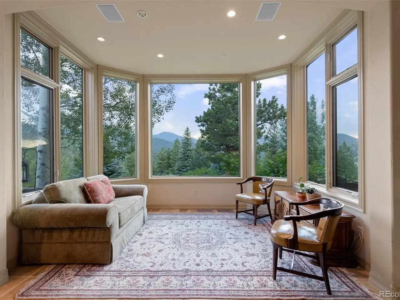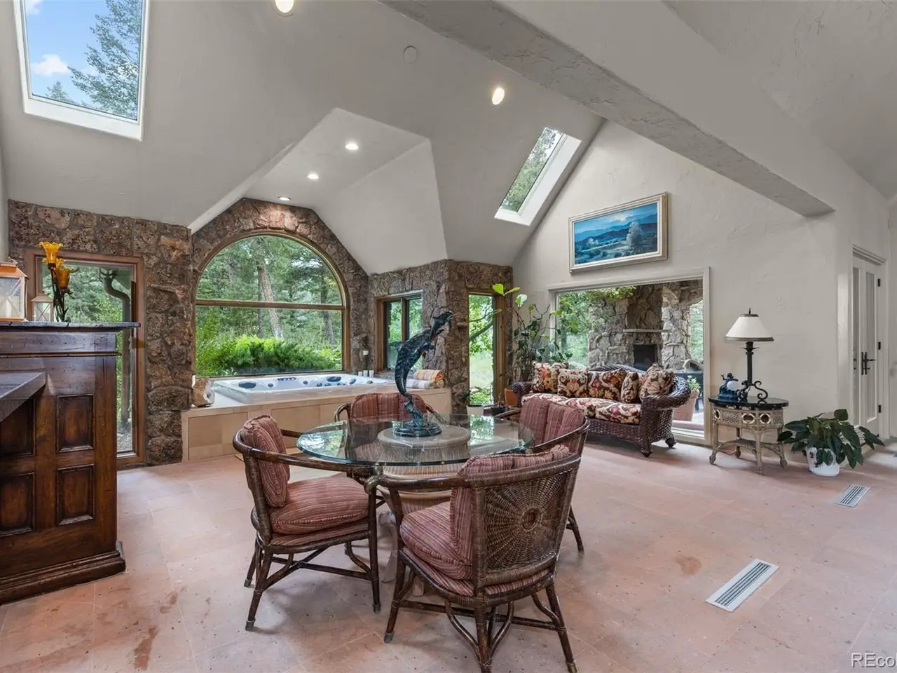 Perched atop two lots comprising 14.5 acres on the pinnacle of Soda Creek, 1275 Silver Tip Lane is the quintessential Colorado property. It offers the utmost in privacy and seclusion - an estate surrounded by mature foliage, bands of aspens and towering pines. Easy access to downtown Evergreen, an hour to top ski resorts or DIA and only 30 minutes to downtown Denver make this retreat ideal for those seeking all that Colorado has to offer. Ten private patios, tiered terraces, gas firepit and fireplaces, an outdoor bbq and bar, and two fully fenced acres all offer views that are magnificent and seemingly endless. The home’s exquisite craftsmanship and unique features are unparalleled and inimitable - handcrafted pecan wood is a marvel, an indoor swimming pool and spa, full-sized tennis court with basketball hoop and viewing deck, classic bar with temperature-controlled wine cellar, home theater, gym, indoor water feature with waterfalls…the list goes on. The grand staircase in the great room leads to the primary suite, positioned to offer some of the best views on the property from the private balcony or sitting area with floor-to-ceiling windows. Relaxation is top of mind while soaking in the tub watching the sunset. Three additional bedrooms offer similar comforts, each with its own 5-piece ensuite bathroom, walk in closet, mountain views and private patio. A guest suite is a haven of its own, providing accommodations such as a full bathroom, sitting area, and private patio. The kitchen’s limestone counters are illuminated by a glass atrium above. Two sinks, a professional grade La Cornue range, extra spacious paneled fridge and freezer, a walk-through pantry, and large island add ease and elegance to daily life. Additional flex spaces offer room for work, leisure or anything in between. This property delivers in every realm and will impress even the most discerning buyers.