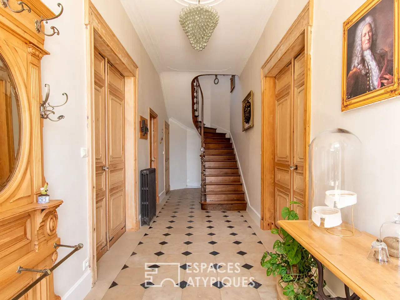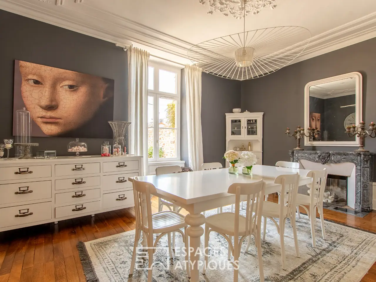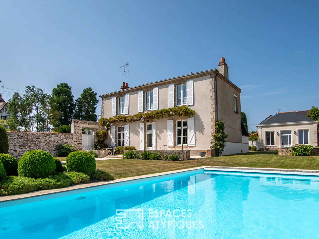 Nestled in a verdant setting, sheltered from view, this sumptuous 18th-century manor house is located in the very heart of Cholet. It unfolds its elegant architecture over 260 m2 of living space, set within a rare landscaped plot of over 1,400 m2. This prestigious residence is a true testament to refinement, combining charm, space, and authenticity to offer a unique living environment. This exceptional property consists of a main building and a stone outbuilding. The entrance hall reveals an interior where solid wood flooring, delicate moldings, sumptuous marble fireplaces, and generous ceiling heights blend harmoniously. On either side, a charming living room with a fireplace invites relaxation, and a refined dining room where every detail has been carefully considered. An independent semi-professional kitchen combines noble materials with contemporary design in a warm atmosphere, opening onto a pleasant terrace under a covered patio. A wooden staircase leads to the upper floor, comprising four spacious bedrooms, including a master suite with a walk-in closet and private bathroom, as well as two additional shower rooms. An 80 m2 outbuilding currently houses a large office with exposed beams, a valuable asset for this estate. The property also includes three covered garages and several outdoor parking spaces. The entire ensemble is enhanced by a landscaped, tree-filled garden, a heated swimming pool, and an orangery?elements that invite wonder and escape. This property captivates with its authenticity, comfort, and generous volumes, all orchestrated with care in a bucolic setting, just steps from the amenities of the town center. Only 5 minutes from the train station, 50 minutes from Angers and Nantes, and 1 hour and 10 minutes from Les Sables-d'Olonne. REF. CH4567 Additional information * 7 rooms * 4 bedrooms * 1 bathroom * 2 shower rooms * 1 floor in the building * Outdoor space : 1439 SQM * Parking : 3 parking spaces * Property tax : 4 504 € Energy Performance Certificate Primary energy consumption d : 163 kWh/m2.year High performance housing