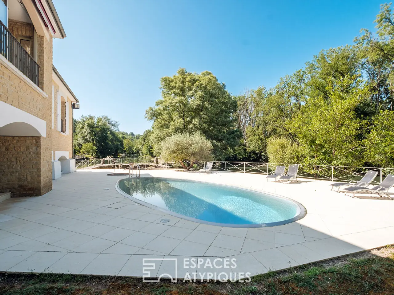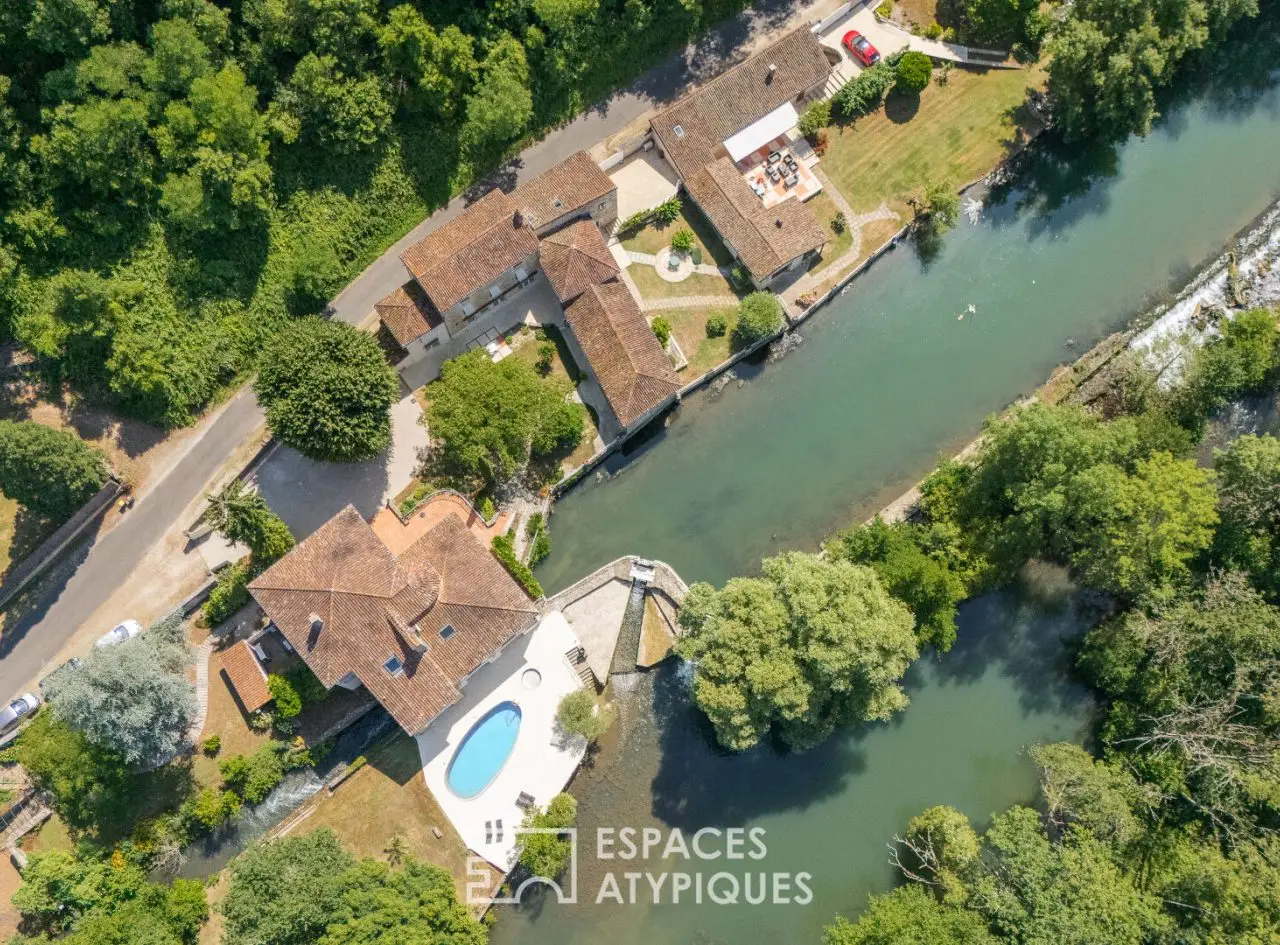 EXCLUSIVE ATYPICAL SPACES Nestled in an exceptional natural setting just 15 minutes from Poitiers, this former 19th-century mill offers approximately 650 sqm of living space, spread across four independent buildings in the heart of a wooded plot bordered by the river. The main residence, measuring 300 sqm, reveals from the entrance a warm living space where the charm of the old blends harmoniously with a custom layout. The spacious and bright reception room is organized around a double living room with a fireplace and large windows opening onto the terrace. The custom-designed kitchen opens to the exterior and extends into a utility room. An office, as well as a master suite on one level with a dressing room and shower room, enrich this level. Upstairs, three suites offer privacy, with privileged views of the green landscapes and the river. The estate also includes two independent gites: each with an entrance, living room, equipped kitchen, and several suites with private bathrooms. A final building, now rented, completes this complex. All accommodations have independent access, preserving everyone's privacy. The landscaped garden is a true haven, punctuated by terraces, trees, and paths leading to the water. A private island, accessible by a small bridge, houses a stainless steel swimming pool perfectly integrated into its environment. A summer kitchen, a gym, a workshop, a cellar, and a double garage complete the features of this property. Ideally located, this property is in close proximity to shops, schools, and services. Poitiers and its TGV station can be reached in 15 minutes, Futuroscope in 20 minutes, and Poitiers-Biard airport in less than 25 minutes. DPE: C (125 kWh/sqm/year) GES: C (14 kg CO2/sqm/year) Estimated annual energy costs for the home (including subscriptions), for standard use, between 2562 euros and 3466 euros per year, according to average energy prices indexed for the year 2021 (concerning the main residence).REF. EAP156Additional information* 17 rooms* 12 bedrooms* 4 bathrooms* 6 shower rooms* 2 floors in the building* Outdoor space : 14000 SQM* Parking : 10 parking spaces* Property tax : 4 858 €Energy Performance CertificatePrimary energy consumptionc : 125 kWh/m2.yearHigh performance housing*A*B*125kWh/m2.year14*kg CO2/m2.yearC*D*E*F*GExtremely poor housing performance* Of which greenhouse gas emissionsc : 14 kg CO2/m2.yearLow CO2 emissions*A*B*14kg CO2/m2.yearC*D*E*F*GVery high CO2 emissionsEstimated average annual energy costs for standard use, indexed to specific years 2021, 2022, 2023 : between 2562 € and 3466 € Subscription IncludedAgency feesThe fees include VAT and are payable by the vendorMediatorMediation Franchise-Consommateurswww.mediation-franchise.com29 Boulevard de Courcelles 75008 ParisInformation on the risks to which this property is exposed is available on the Geohazards website : www.georisques.gouv.fr