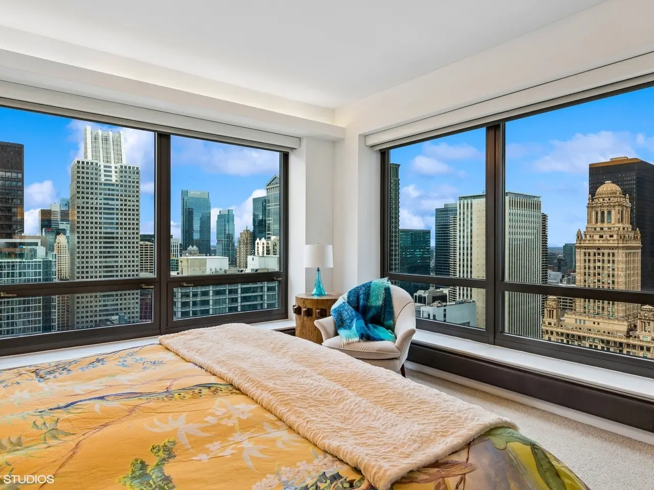 Discover urban elegance in this highly upgraded 3BR/3BA residence on the 41st floor of the Heritage, perfectly positioned on Chicago's Cultural Mile for downsizers and second home buyers seeking proximity to theater, Millennium Park, Lake Michigan, and the Museum Campus. Breathtaking North/East/West corner views of the city skyline, lake, and park unfold through floor-to-ceiling windows, amplifying the 2157 sq ft layout. Custom motorized shades, cove lighting, and bespoke cabinetry elevate the sophisticated interiors. The open kitchen, dining, and living areas feature upgraded hardwood flooring, abundant counter space, a breakfast bar, and access to a spacious recessed balcony-ideal for relaxing or entertaining. The primary suite boasts a Jacuzzi bath, separate shower, walk-in closet, and custom Abitare cabinetry. A dedicated laundry room (not a closet), guest suite, and third bedroom/home office with tailored desk and shelving add practicality and charm. Enjoy Crestron-controlled Lutron lighting and Boston Acoustics surround sound for effortless ambiance. Building amenities include an indoor pool, hot tub, saunas, fitness center, community rooms & co-working space, dog run, 24/7 door staff, and direct pedway access to rail transit for seamless O'Hare connections. Steps from world-class theater, Symphony Center, Art Institute, Museum Campus, and lakefront trails, this home offers vibrant city living with the serenity of a well-appointed retreat. Stroll to Millennium Park's Lurie Gardens, sail from Monroe Harbor, or dine along the Magnificent Mile-all just outside your door.