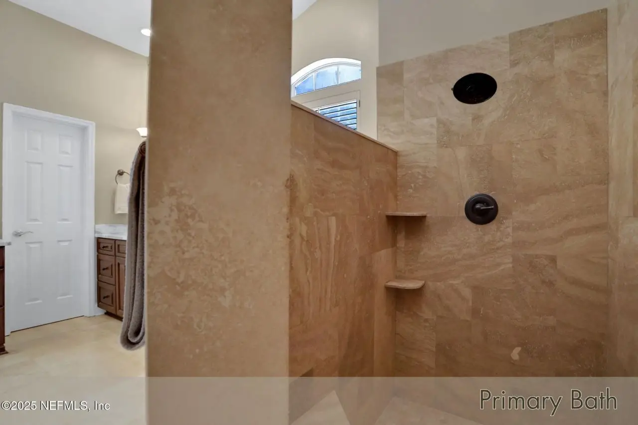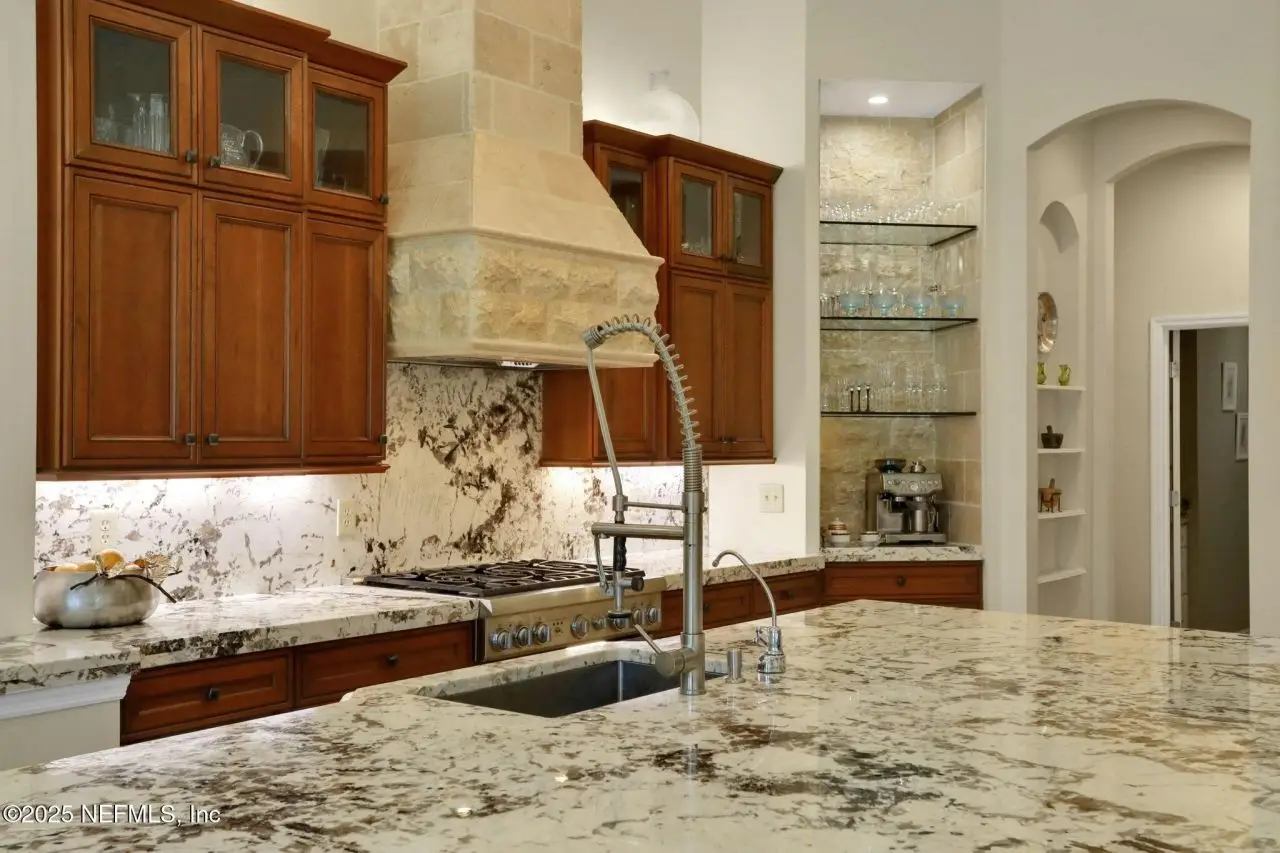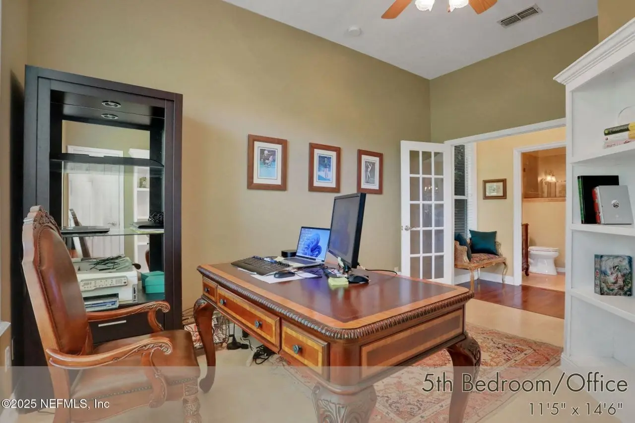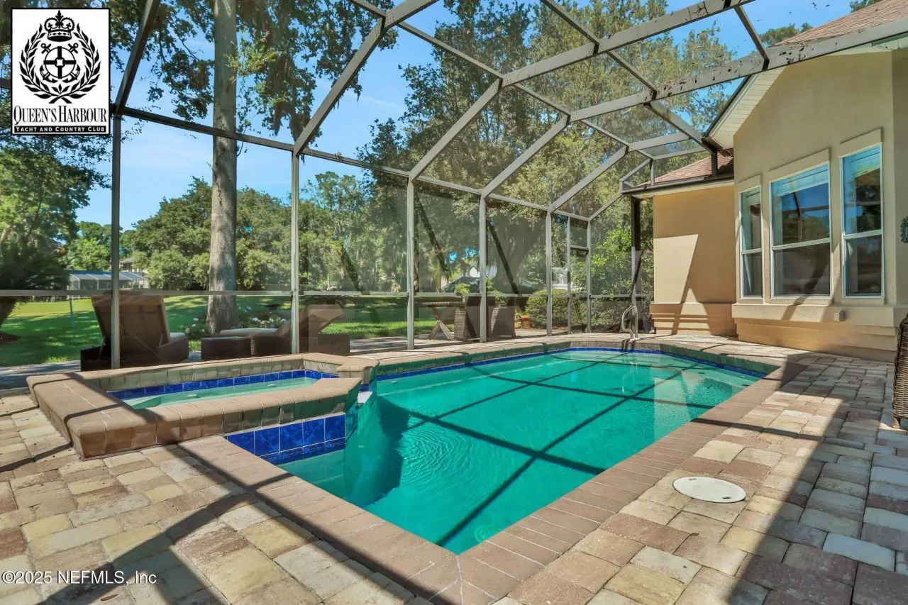 This gorgeous home sits pretty on a spacious lot overlooking the Mark McCumber designed championship golf course in the exclusive gated community of Queen's Harbour. It has five ensuite bedrooms and over 3,300 sq ft of indoor living space. An added bonus is the 860 sq ft of screened outdoor living complete with an inground pool and spa. This home has room for everyone. Pull up the expanded paver driveway and you'll immediately notice the charming courtyard entry garage. The magnificent eight-foot leaded glass double doors topped with an arched transom window create a grand entrance that floods the foyer, living room, and dining room with natural light. Step inside and prepare to be wowed by the incredible water-to-golf course views through the living room's wall of windows. The large-format travertine and gleaming engineered wood floors throughout the main level add an elegant touch that's both beautiful and practical. The spacious dining room can and has hosted dinner parties for twelve or more, making it perfect for entertaining. But the real showstopper is the Great Room, which truly serves as the heart of this home. This naturally-lit space features a wall of windows and glass doors with fabulous water-to-golf views from every angle. The luxuriously updated kitchen is a chef's paradise with a huge island that seats six for dining and gathering space for more. The breakfast nook and comfortable den with gas marble hearth fireplace paired with an arched floor-to-ceiling custom wood display cabinet complete this amazing space.The furniture-inspired Thomasville Custom Cabinetry with two-tier stacked upper cabinets features a glass display gallery to showcase all of for your attractive dishware and collectibles. Soft-close doors, custom inserts, and soft-glide drawers highlight the quality construction. The exotic and rare double straight-edge granite countertops with matching seamless backsplash create a cohesive, designer-inspired look.Two built-in tumbled travertine beverage stations add convenience and style. One serves as a coffee station while the other handles adult beverages, both feautue ambient lighting and custom glass shelving. The glass entry pantry closet with custom shelving keeps everything organized and clutter-free.The kitchen comes equipped with a top-of-the-line Thermador appliance package including a six-burner gas range topped with a limestone exhaust hood, seven-foot three-door French-style refrigerator, and Sapphire dishwasher.Off the great room, through the breakfast nook to the sun room featuring double sliders leading to the outdoor screened living space with sparkling pool and spa overlooking the park-like backyard and long views of the golf course. A huge open patio extends the outdoor entertainment options even further.The thoughtful three-way split bedroom floor plan works perfectly for multi-generational living. The primary bedroom, located just off the foyer, features a vestibuled entry with an oversized bedroom on one side and a resort-style bath on the other. This tremendous bathroom includes a soaker tub, oversized shower, two separate vanities, water closet, and two walk-in closets. The sleeping area has a generously sized sitting area with French doors to the sun room and pool.On the opposite side of the home, the guest bedroom wing includes bedrooms two and three sharing a Jack and Jill bath with double sinks and linen closet. Both bedrooms are generously sized, with one featuring a walk-in clos