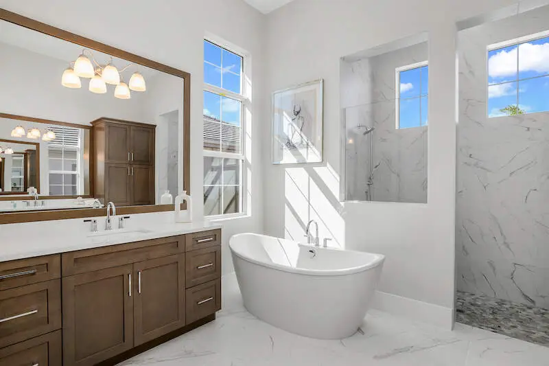 Modern self-standing bathtub and elegant bathroom features