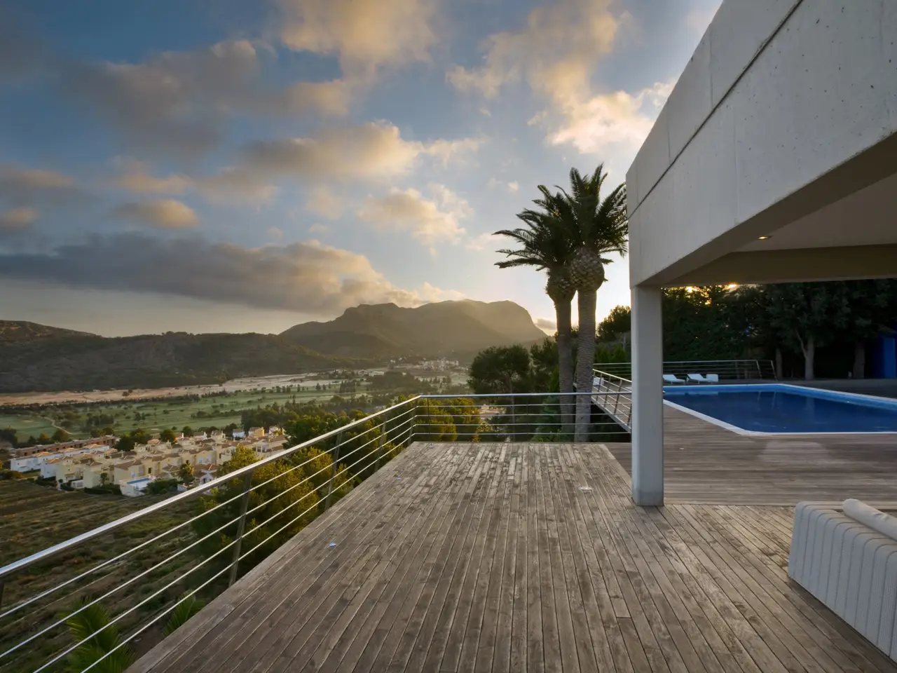 Extraordinary villa located in a very private area in the heart of the luxurious Golf La Sella and Hotel La Sella with impressive panoramic views of the Montgó mountain, the 27-hole golf course and the city of Denia and the sea. It is an exceptional property offering a cutting-edge design where straight lines predominate and large glazed doors and floor-to-ceiling windows create a cosy and bright atmosphere. The villa is set on a plot of 3,250m2 and it has a surface of 1,146m2 distributed over three floors. The ground floor gives access to the house via an impressive automatic and treated wooden door which leads to the hall and the lift that connects all the floors. On the right wing there is the guest area and the staff accommodation consisting of three double bedrooms, three en-suite bathrooms and an equipped kitchen. The first floor is home to the main rooms of the property: the large lounge with large windows offering views of the golf, the mountains and the sea. There is also a dining room, a sitting room with access to a partially covered terrace and the kitchen. All lounges have access to the terrace and the front balcony. The kitchen is equipped with the latest technology and has access to a landscaped terrace on the back. Next to this terrace, you will find a glazed library which connects with a spacious office and a guest toilet. The main bedroom enjoys spaciousness and is distributed into a rest area, two dressing areas, marble bathroom with two independent toilets, shower and whirlpool, plus two lounges annex to the bedroom which can be used as a reading room or tv room and a terrace. On the left wing, you will find a large garage with capacity for five vehicles, large temperature-controlled wine cellar, gym and changing rooms with shower. In addition, there are two storage rooms, laundry room and machine room. The illuminated pool with a self-cleaning system is surrounded by a teak deck. Next to it, there is the barbecue area and a private outdoor shower. The plot enjoys privacy and is completely fenced and equipped with surveillance system and a perimeter alarm. The garden is embellished with a great variety of vegetation such as kermes oak, walnut trees, orange and lemon trees, as well as aromatic plants and chill-out areas. Comfort and security for residents is guaranteed as it is equipped with air conditioning and underfloor heating, alarm system, CCTV video surveillance, automatic entrance doors, electric blinds, aluminium windows with safety glass, marble and wooden flooring, music system and lightening in terraces, access and gardens.