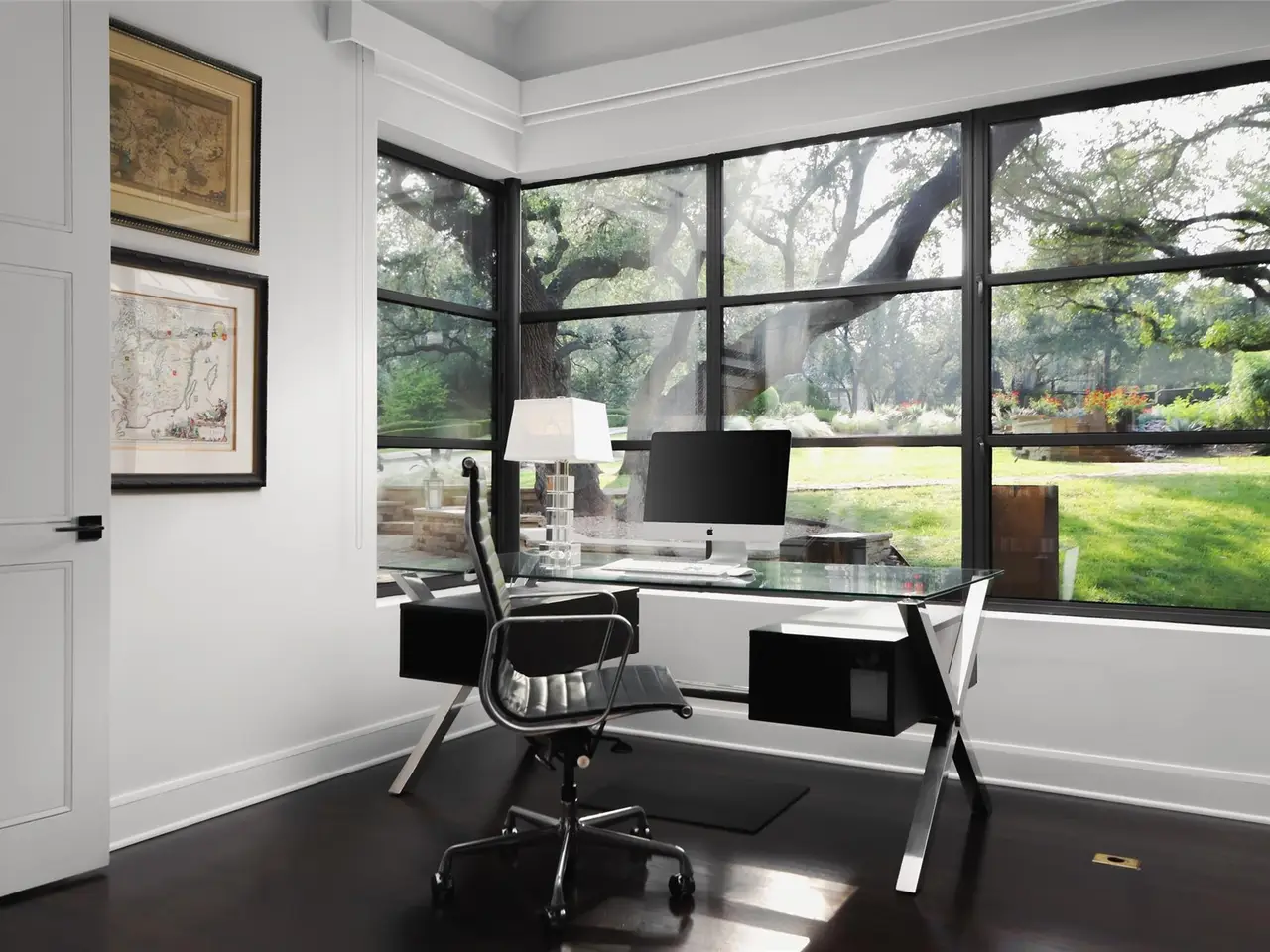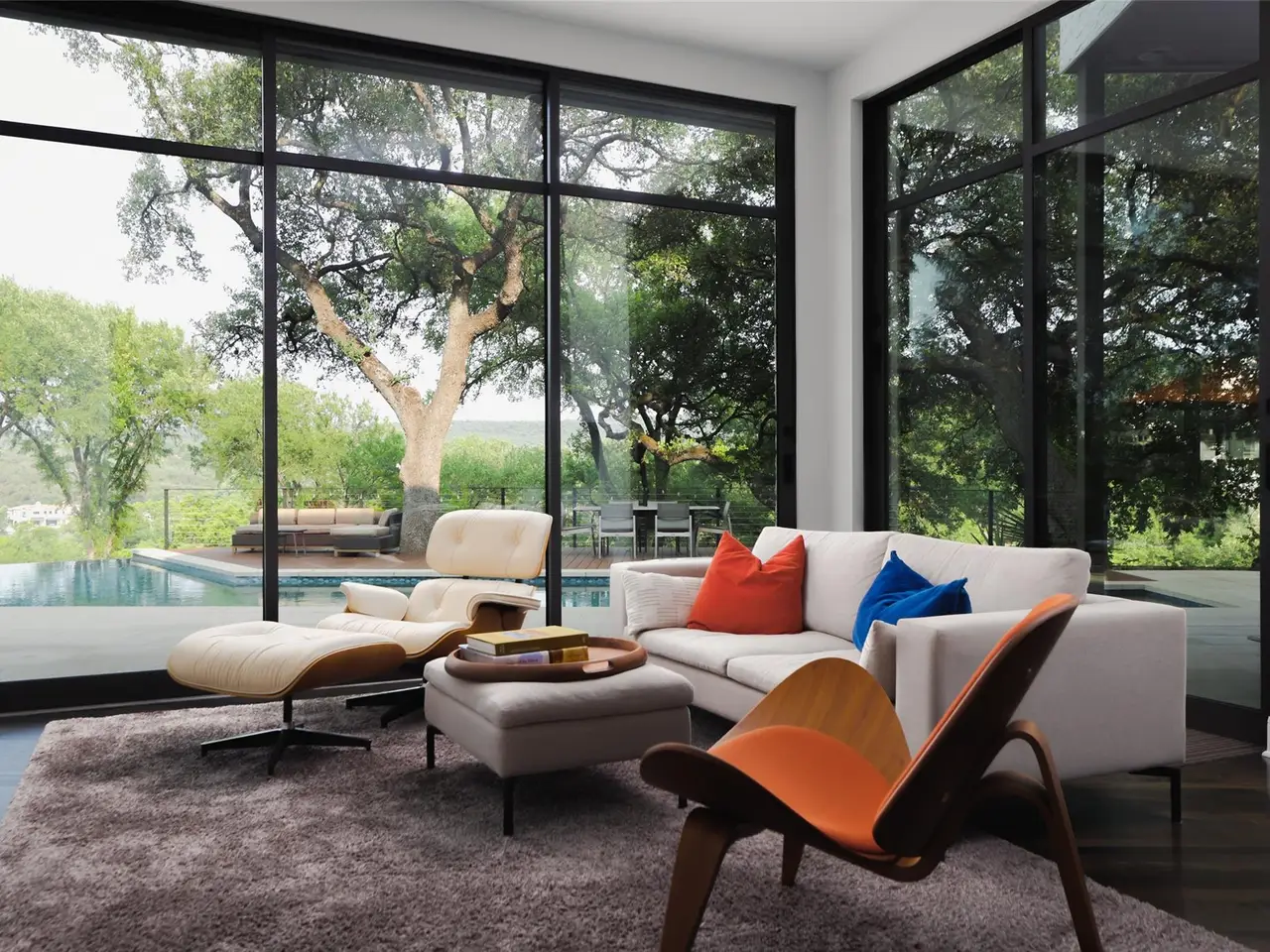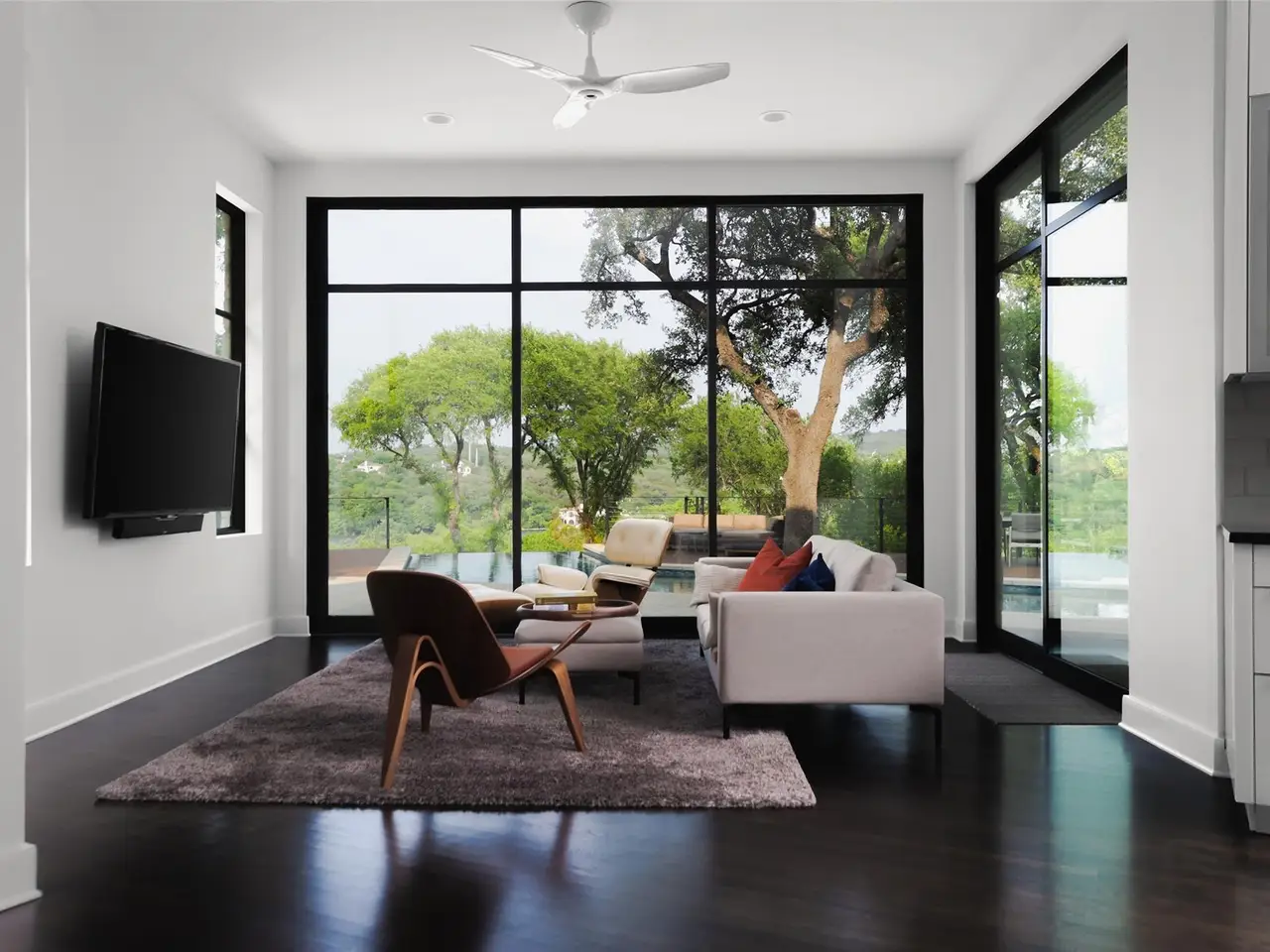 • Floor-to-ceiling glass with panoramic pool and lake views