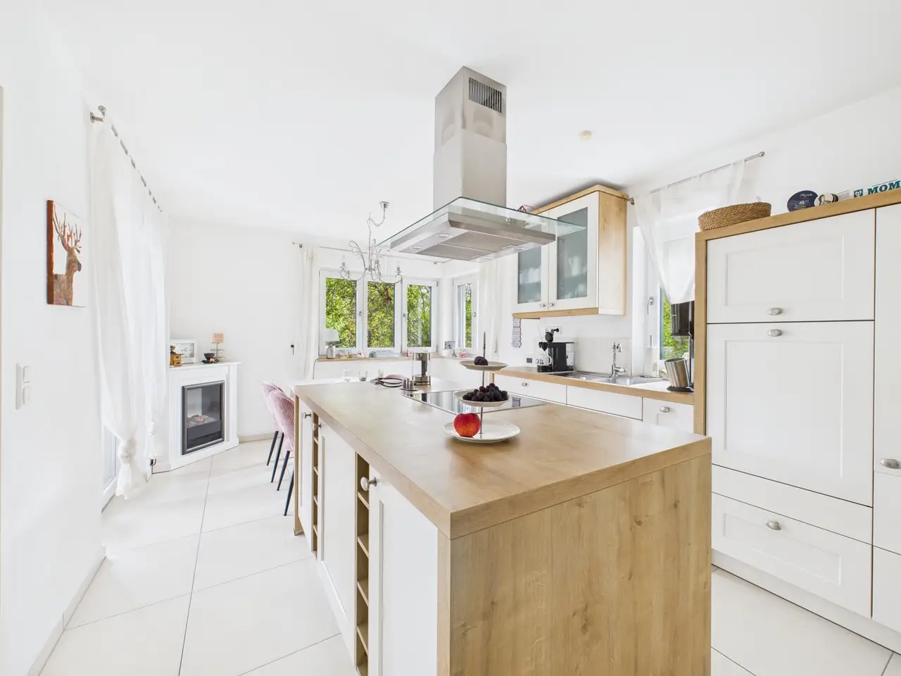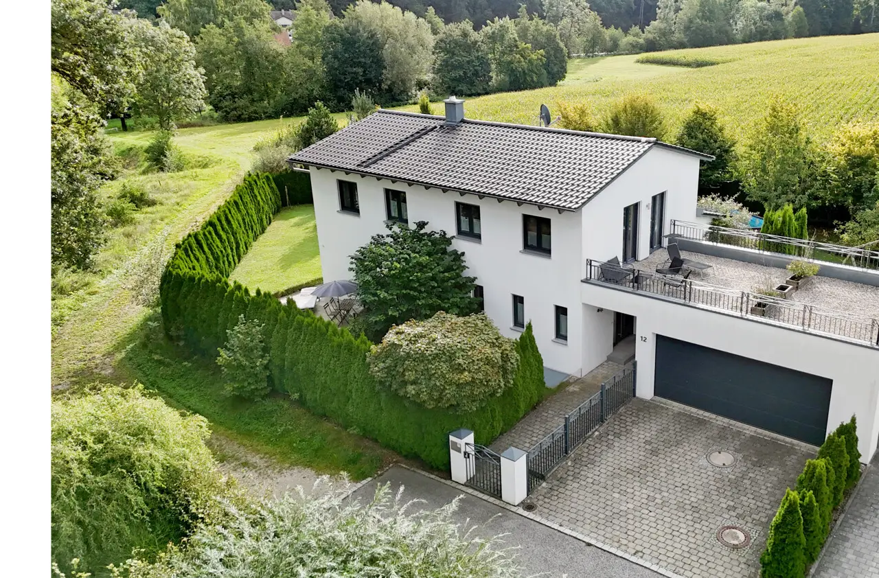 This exceptional architect-designed house from 2013 in Tiefenbach combines timeless elegance, modern architecture and a location that is second to none. On a living space of around 175 m² and a generous plot of 905 m², a living concept unfolds that is both well thought-out and prestigious. You can feel the special atmosphere as soon as you enter: clear lines, an exceptionally successful room layout and light-flooded rooms, which are enhanced by high-quality oak parquet and elegant tiled floors. Generous window fronts open up the view into the park-like, secluded garden, which offers absolute privacy and an unobstructed view - a green oasis that borders directly on a beautiful nature reserve. Centuries-old oak trees characterize the panorama, which you can enjoy from both the living room and the bedroom. Three sun terraces invite you to linger at any time of day. Whether it's breakfast in the first morning light, a sundowner on the roof terrace with fantastic sunsets or a relaxing end to the evening in the covered outdoor seating area - you'll find your favorite spot here at any time of year. The open-plan living and dining area with stylish panoramic fireplace creates an ambience that perfectly combines comfort and spaciousness. A high-quality wellness area with an exclusive bio steam sauna awaits you in the basement - the ideal retreat for relaxing hours. The comfortably converted basement rooms with underfloor heating also offer additional space that goes far beyond mere utility rooms. The technical equipment is modern and sustainable: an efficient air-to-water heat pump, triple-glazed isoglass windows, underfloor heating, a double garage and two outdoor parking spaces round off the overall picture. A property for people who are looking for something special - timeless, high-quality, unique.