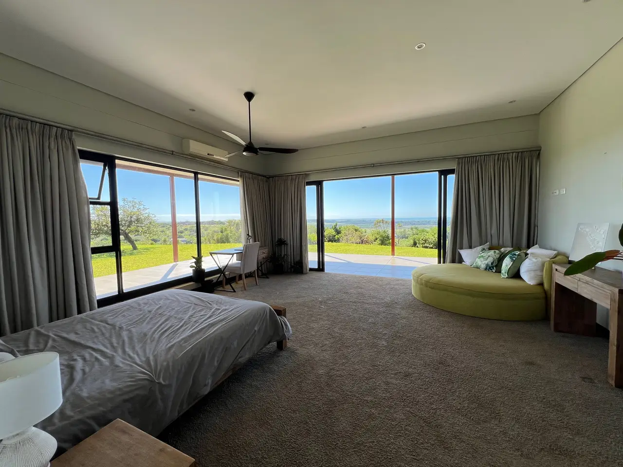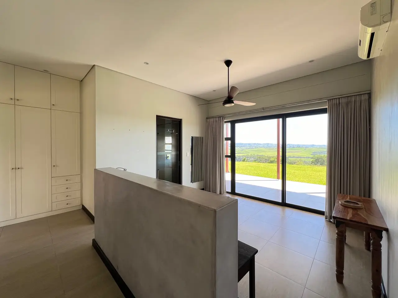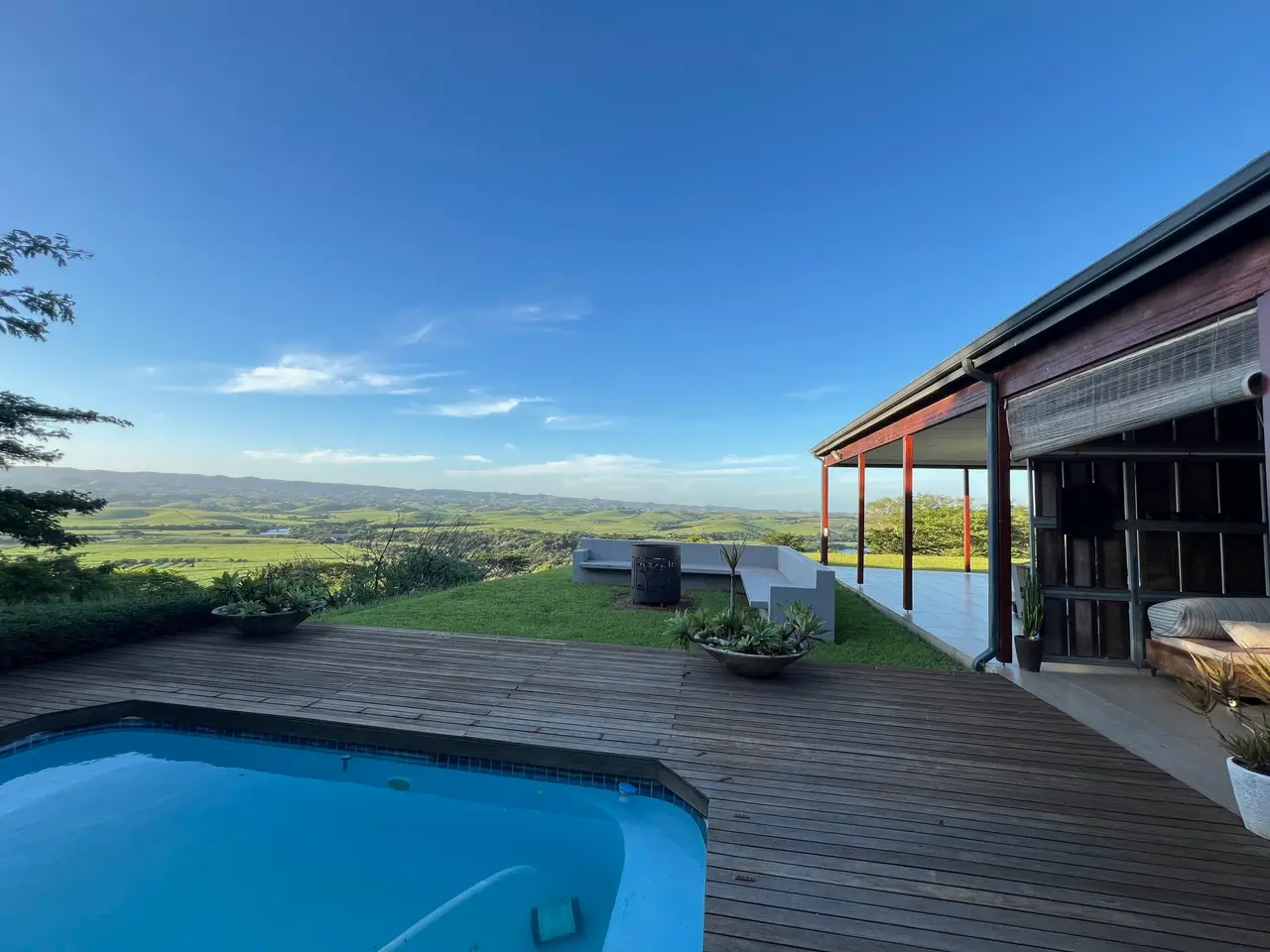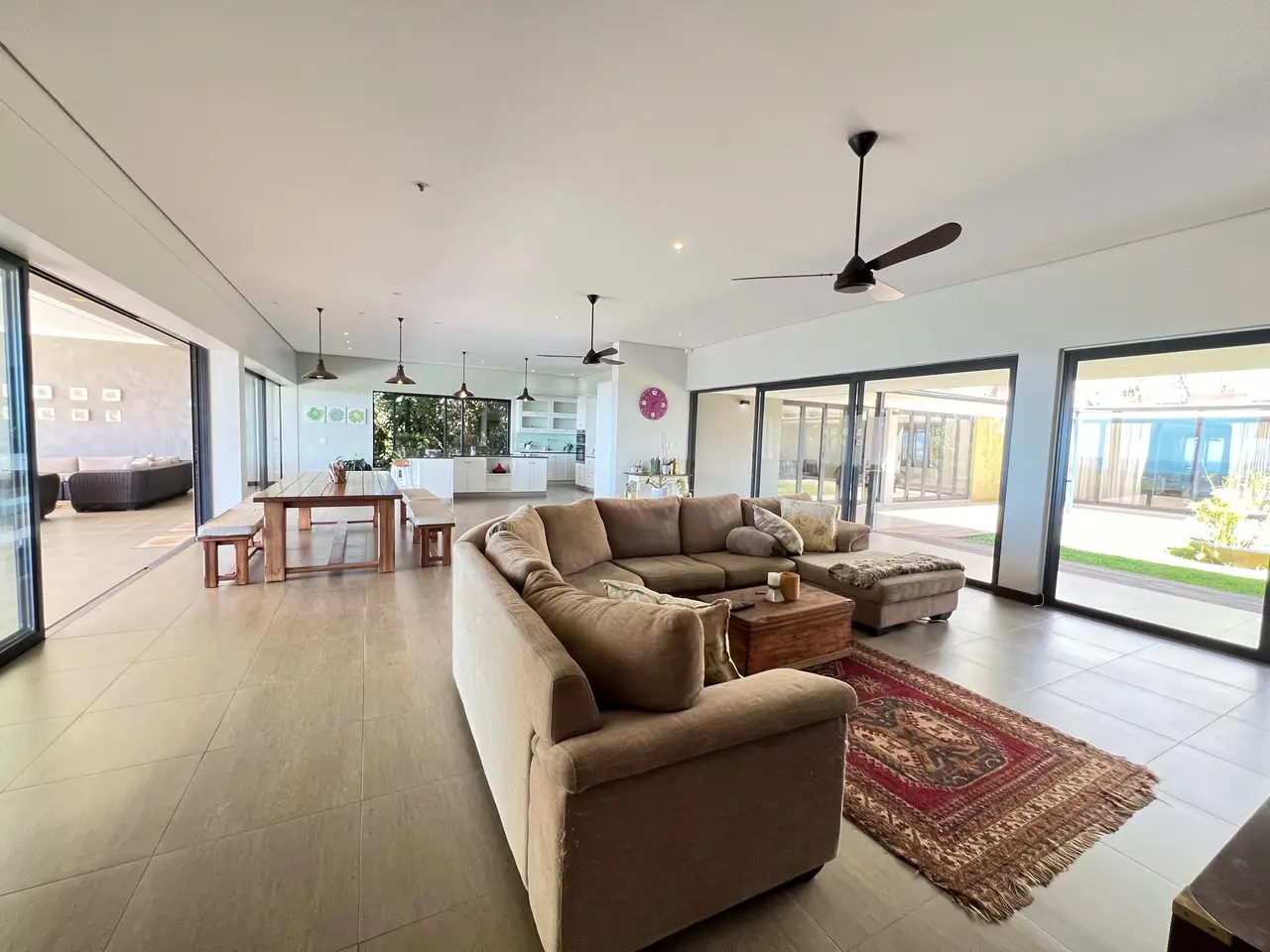 Available on the hills of Zini River Estate with endless views of grassy reclaimed cane lands overlooking the ocean, estuary, and riverine forest. 1,100 square meter home on a 11,716 square meter stand. Nestled within this Eco Estate, this single-level five bedroom residence boasts en suite bathrooms, ensuring privacy and comfort. Seamlessly blending indoor and outdoor living, the open-plan layout effortlessly connects all areas to a serene central courtyard. Indulge in luxury amenities such as a generous home gym and music room or unwind in the inviting wine cellar. Outside, a charming Boma, pizza oven, and built-in braai beckon with breathtaking views, creating perfect spaces for entertaining. Completing the package, spacious two double garages with ample storage and an inverter with batteries ensure both convenience and efficiency. The home is sold furnished if needed. Lovely pond on the property for water distribution.