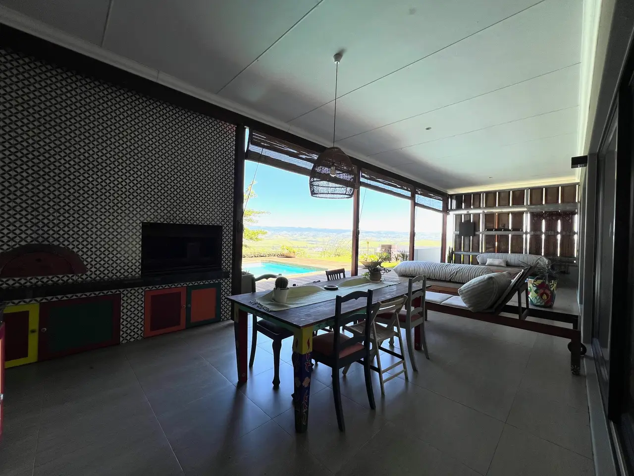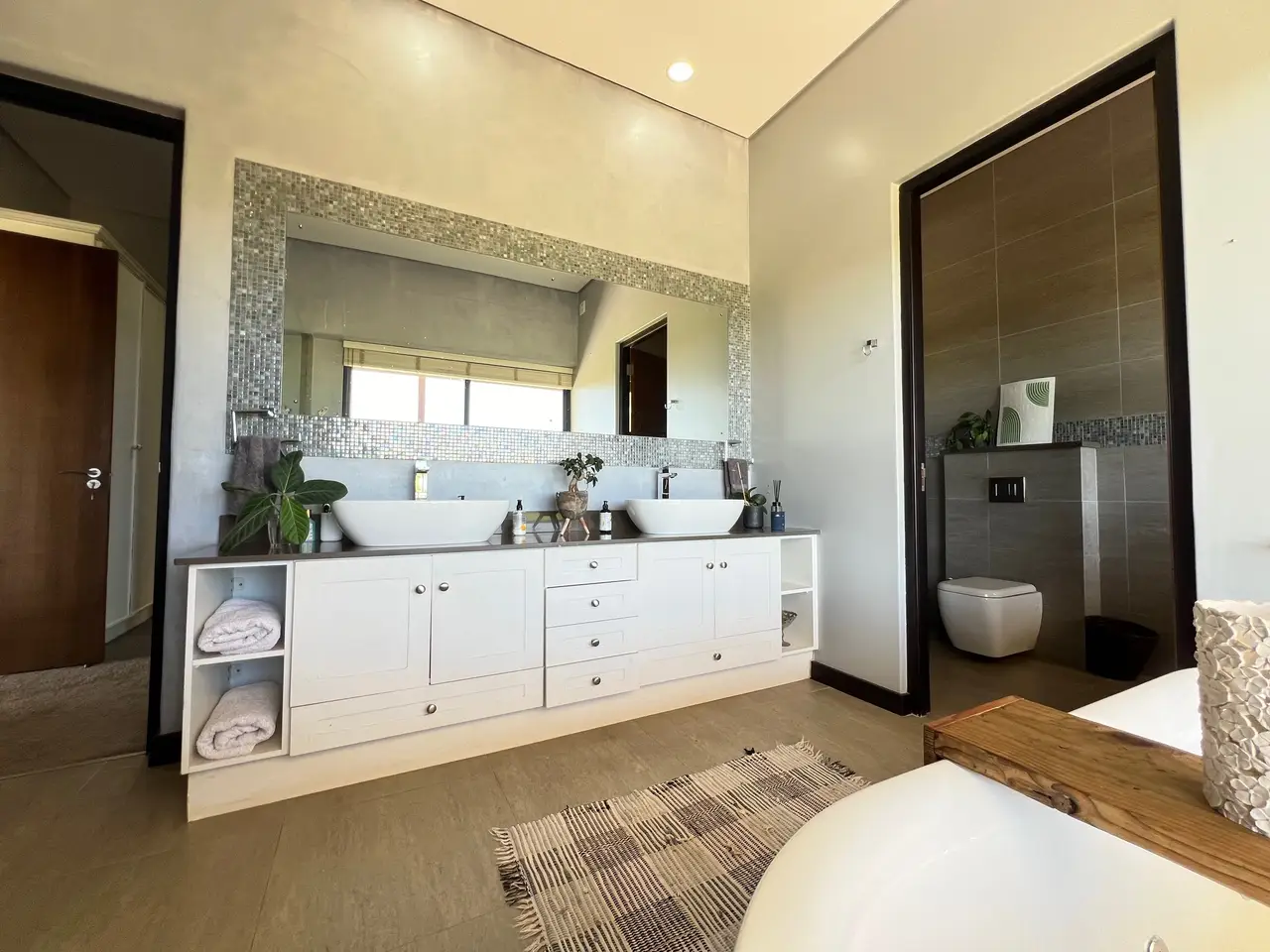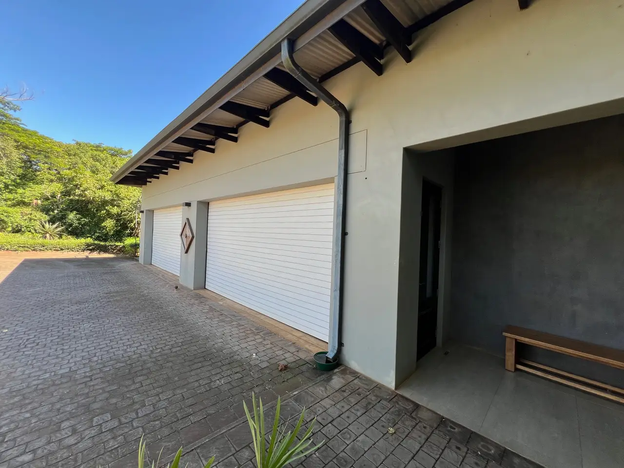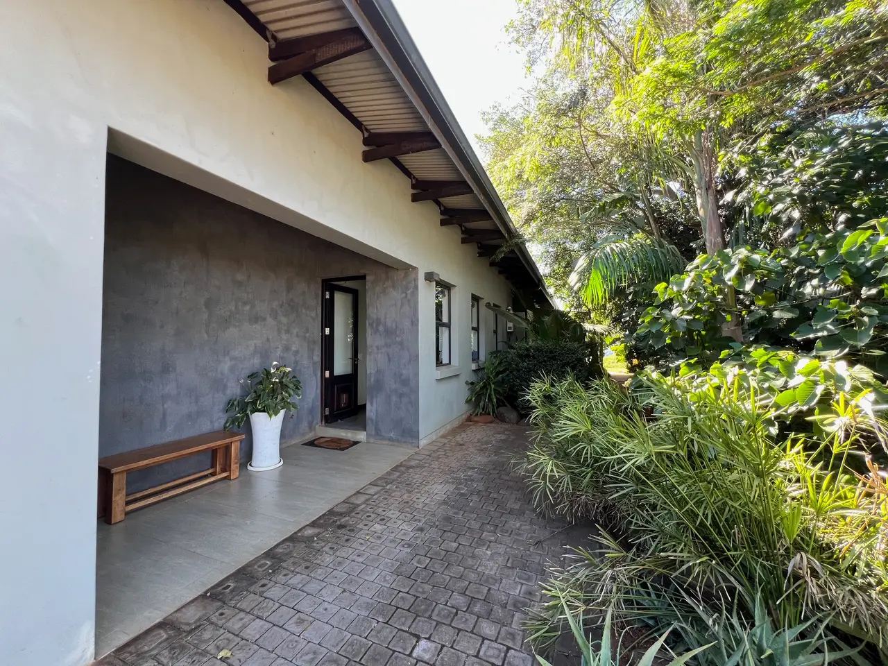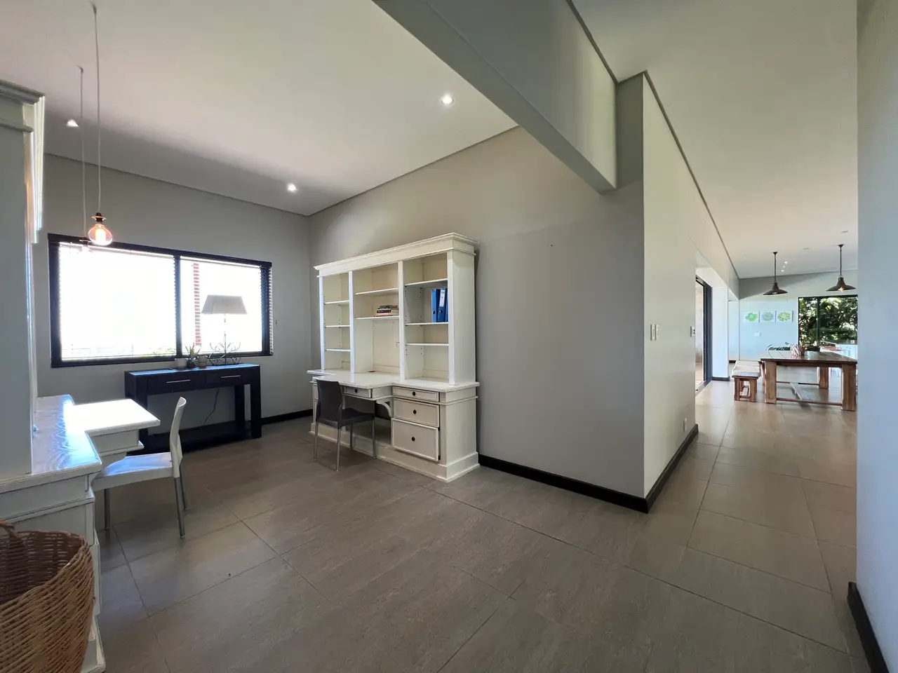 Available on the hills of Zini River Estate with endless views of grassy reclaimed cane lands overlooking the ocean, estuary, and riverine forest. 1,100 square meter home on a 11,716 square meter stand. Nestled within this Eco Estate, this single-level five bedroom residence boasts en suite bathrooms, ensuring privacy and comfort. Seamlessly blending indoor and outdoor living, the open-plan layout effortlessly connects all areas to a serene central courtyard. Indulge in luxury amenities such as a generous home gym and music room or unwind in the inviting wine cellar. Outside, a charming Boma, pizza oven, and built-in braai beckon with breathtaking views, creating perfect spaces for entertaining. Completing the package, spacious two double garages with ample storage and an inverter with batteries ensure both convenience and efficiency. The home is sold furnished if needed. Lovely pond on the property for water distribution.