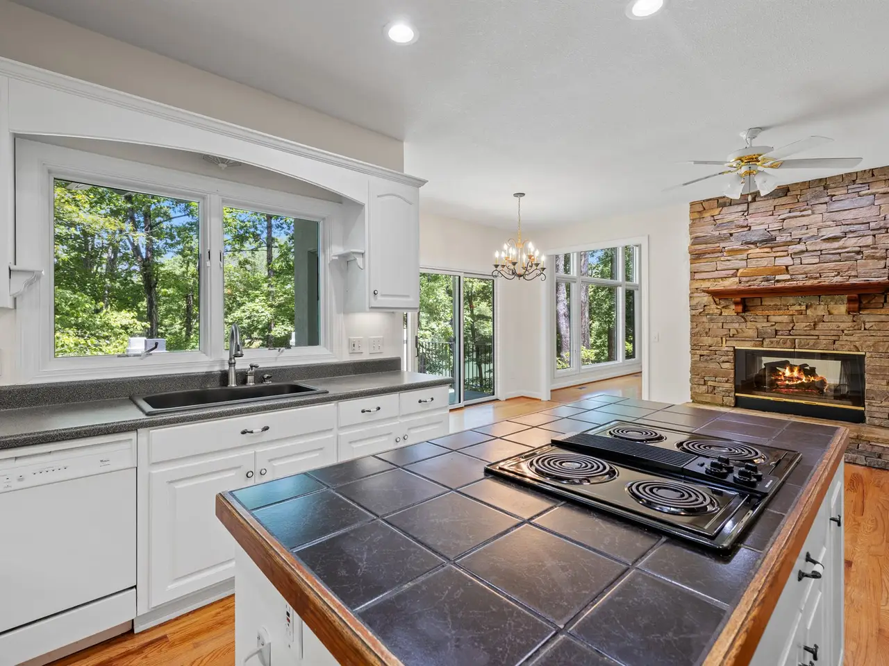 • Stone fireplace in kitchen