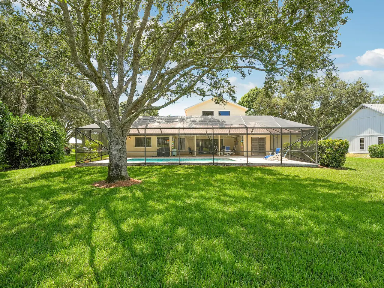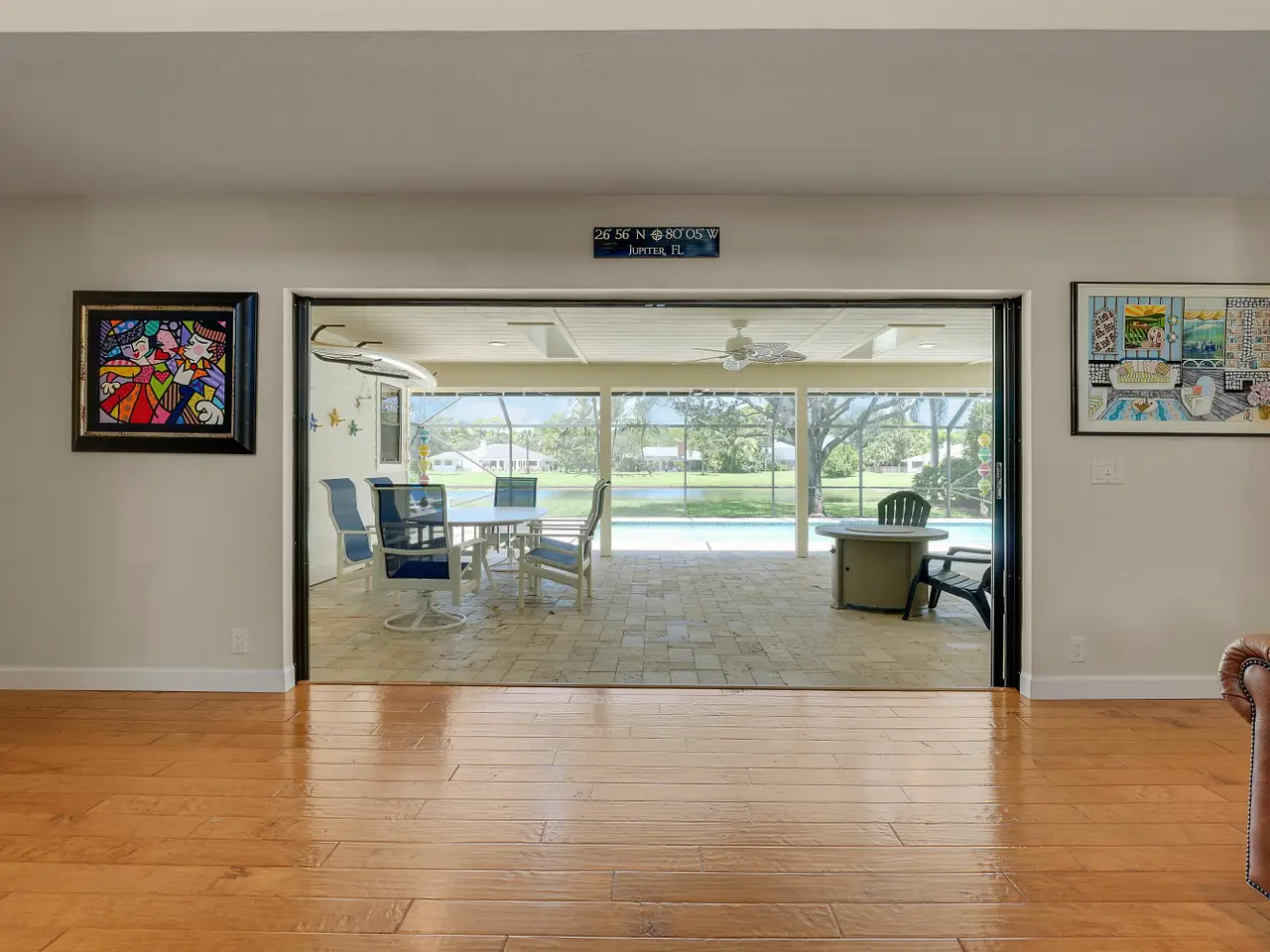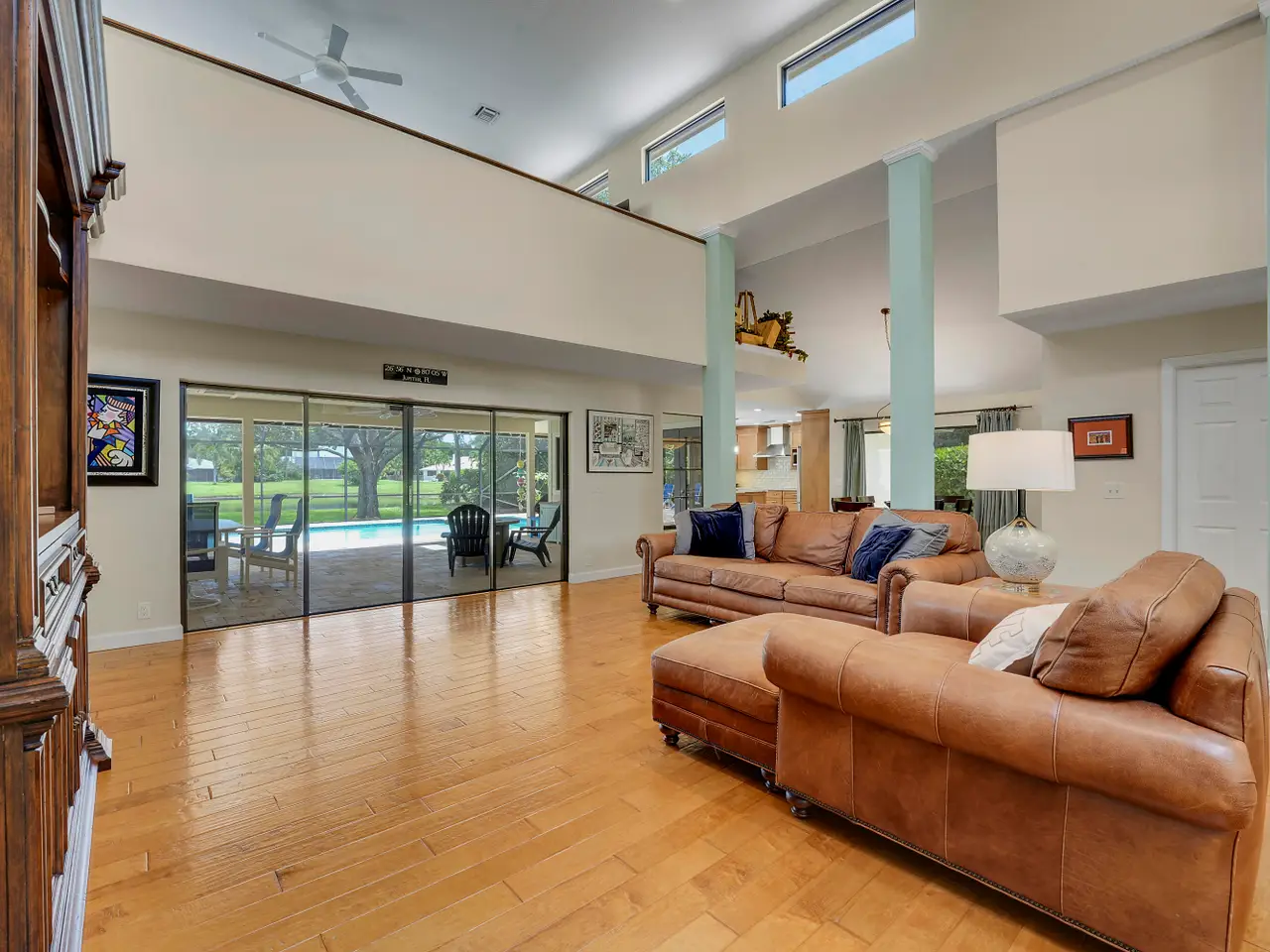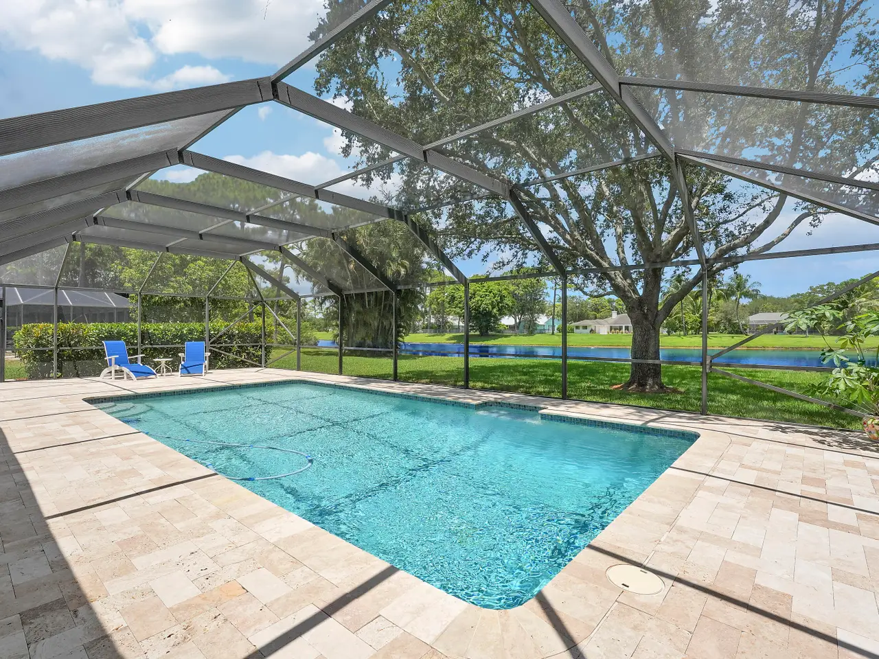 Lakefront Living in the Heart of Jupiter. Welcome to this well appointed 4 bedroom, 2-bath home (4th bedroom is a versatile loft), offering nearly 2,500 square feet of open-concept living on a half-acre lakefront lot. Soaring ceilings and abundant natural light create an airy, inviting atmosphere throughout. The spacious kitchen is a chef's dream, featuring a large island with granite countertops, newer stainless-steel appliances including a double wall oven -- perfect for entertaining. The split-bedroom floor plan ensures privacy, with generously sized rooms and thoughtful design. Step outside to your private oasis: a screened-in pool with glass tile accents, a new saltwater system, and light pavers that surrounds the pool and extends into the covered patio with custom wood paneled ceiling