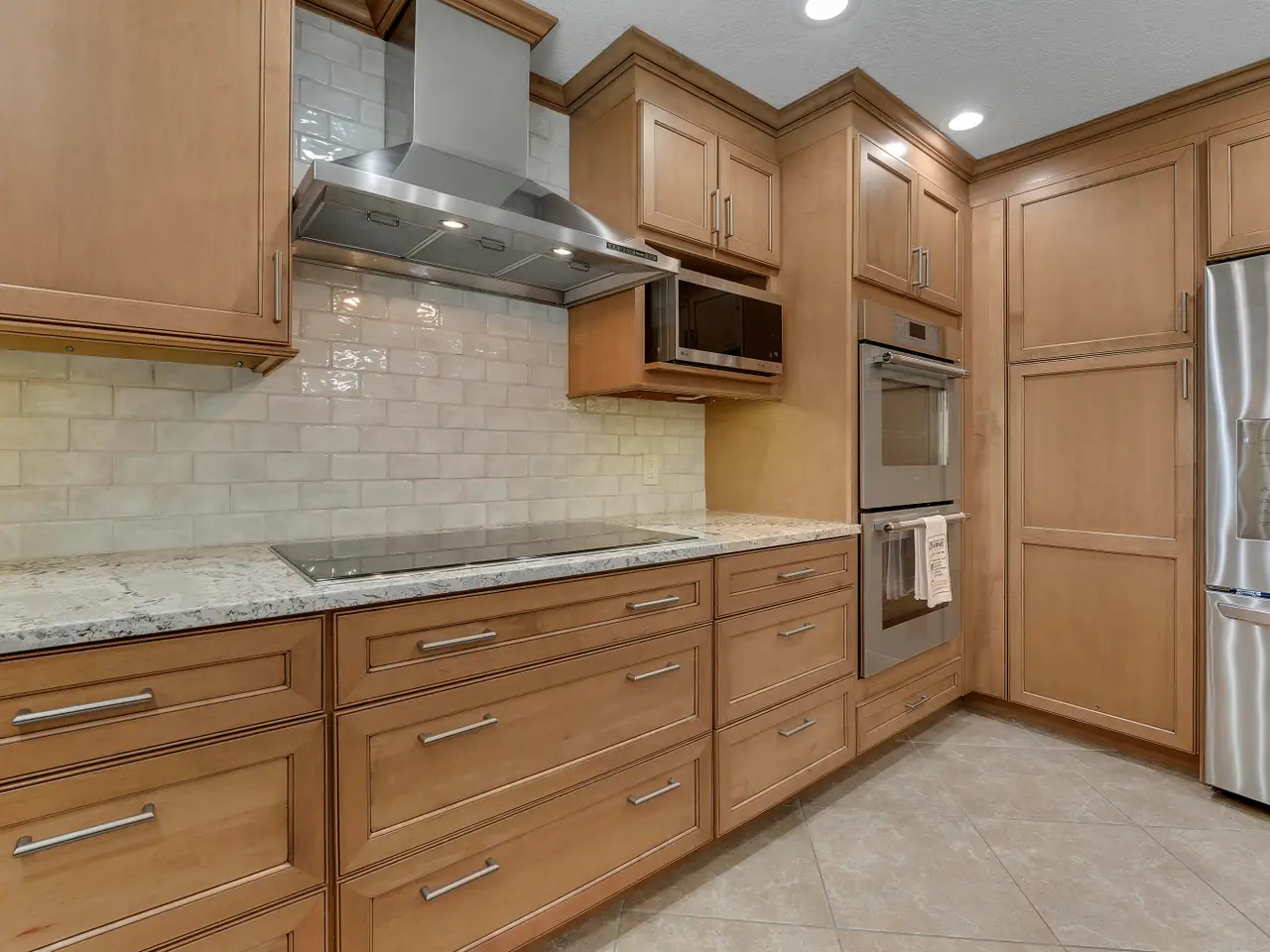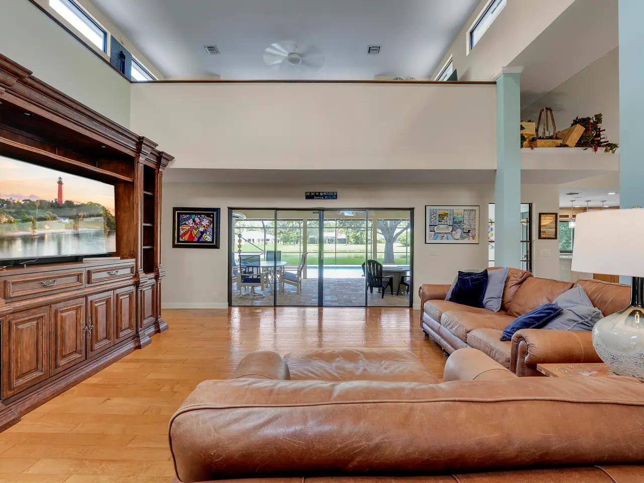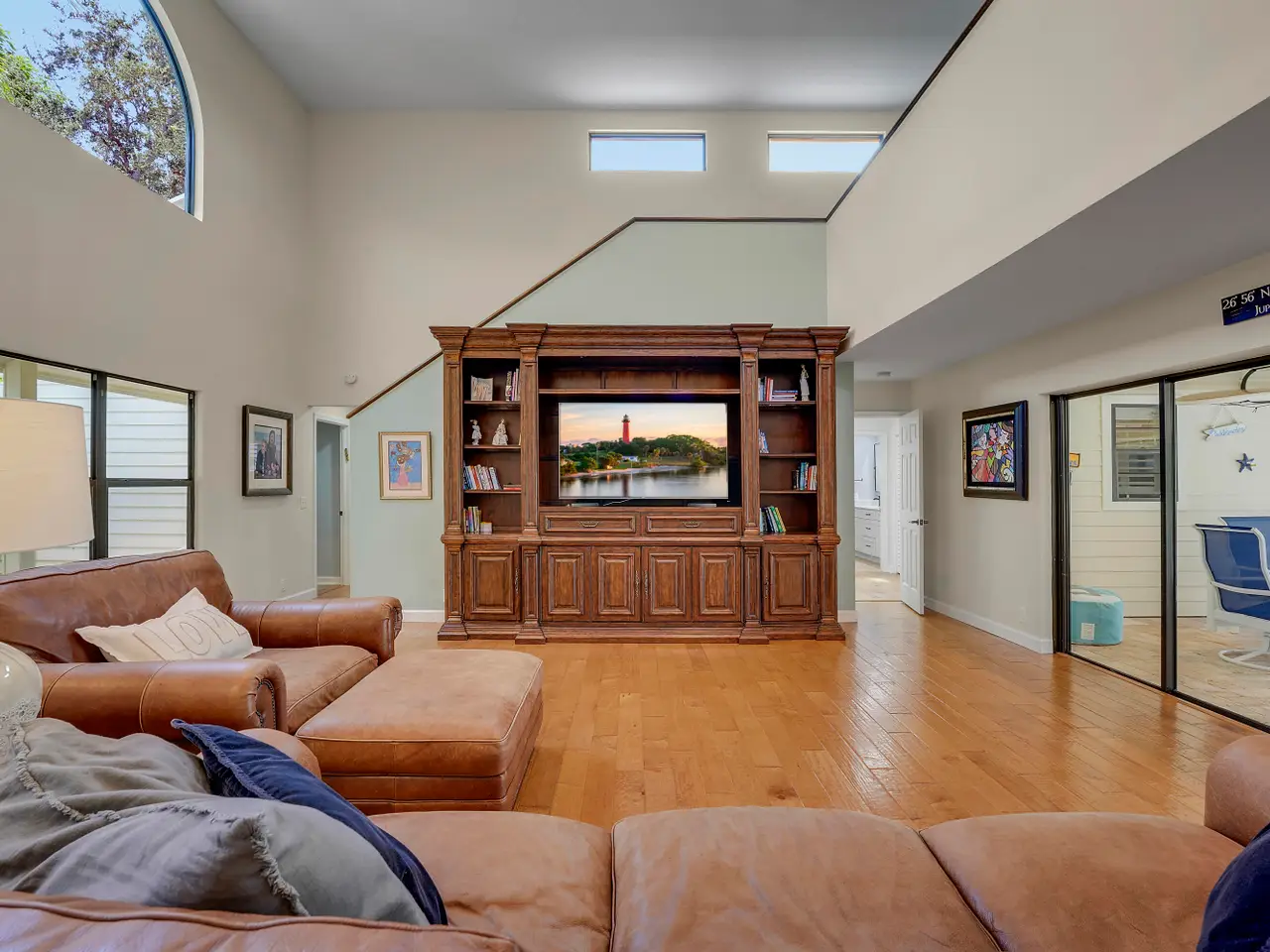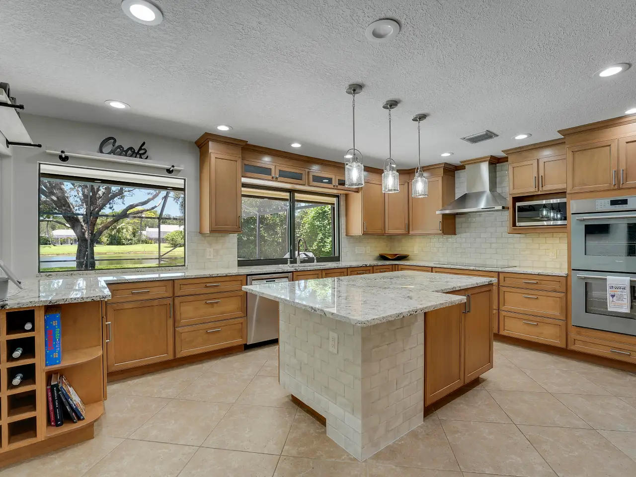 Lakefront Living in the Heart of Jupiter. Welcome to this well appointed 4 bedroom, 2-bath home (4th bedroom is a versatile loft), offering nearly 2,500 square feet of open-concept living on a half-acre lakefront lot. Soaring ceilings and abundant natural light create an airy, inviting atmosphere throughout. The spacious kitchen is a chef's dream, featuring a large island with granite countertops, newer stainless-steel appliances including a double wall oven -- perfect for entertaining. The split-bedroom floor plan ensures privacy, with generously sized rooms and thoughtful design. Step outside to your private oasis: a screened-in pool with glass tile accents, a new saltwater system, and light pavers that surrounds the pool and extends into the covered patio with custom wood paneled ceiling
