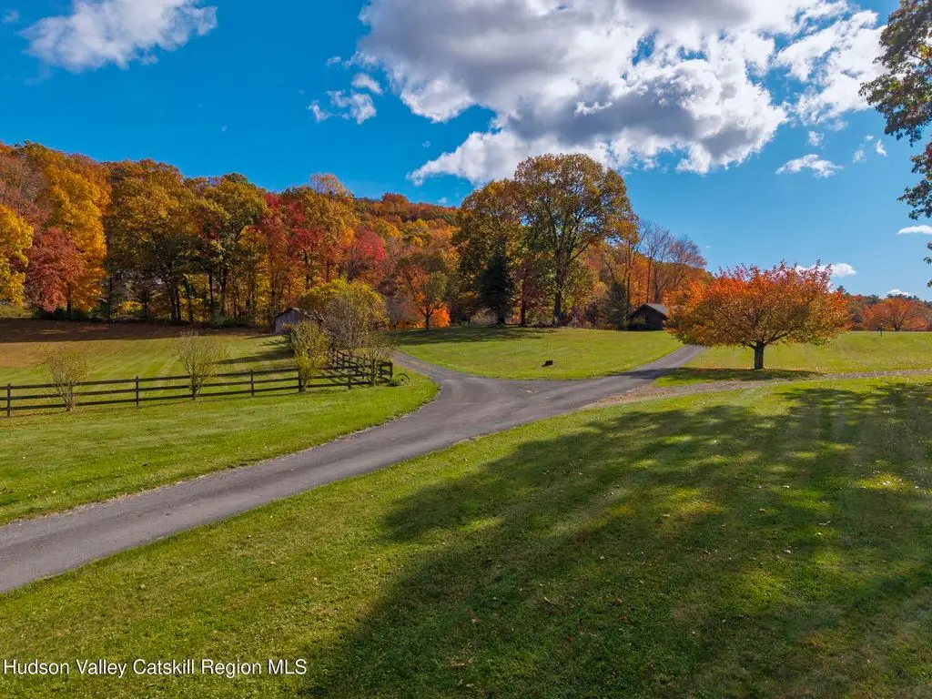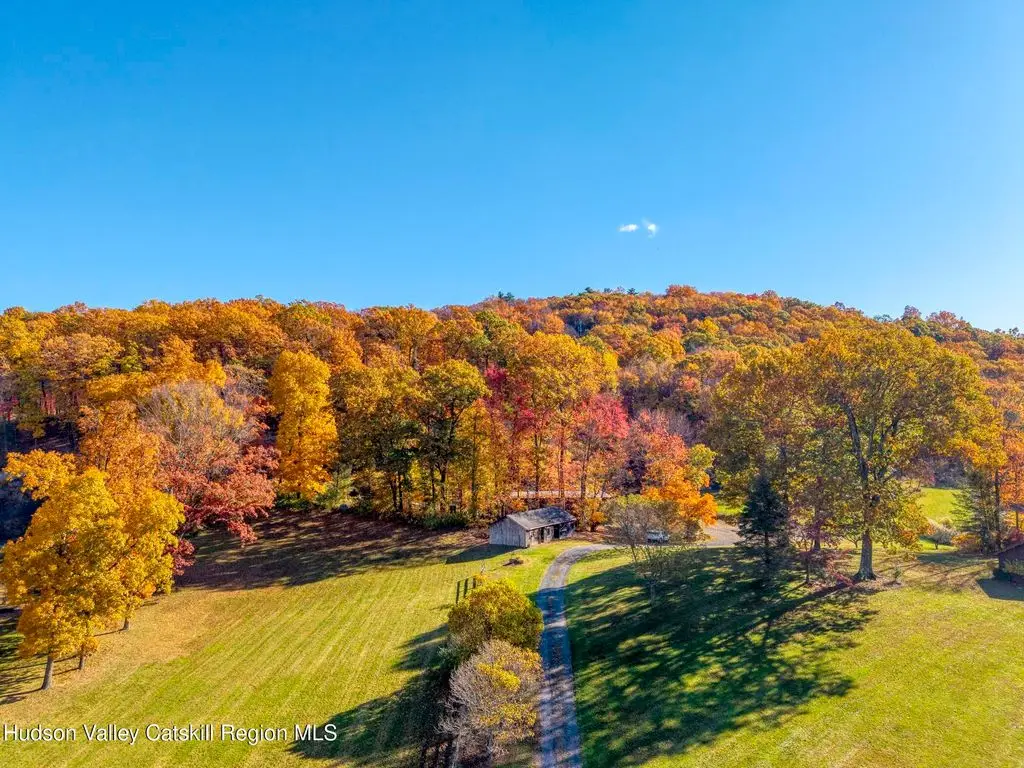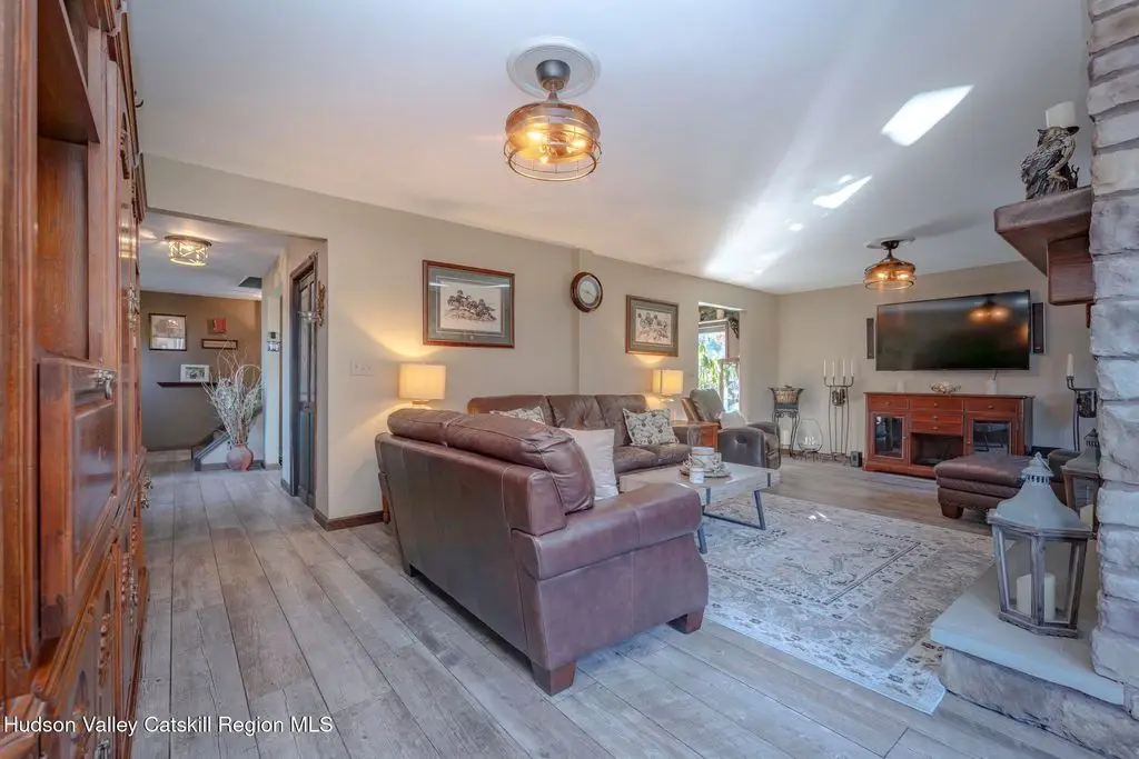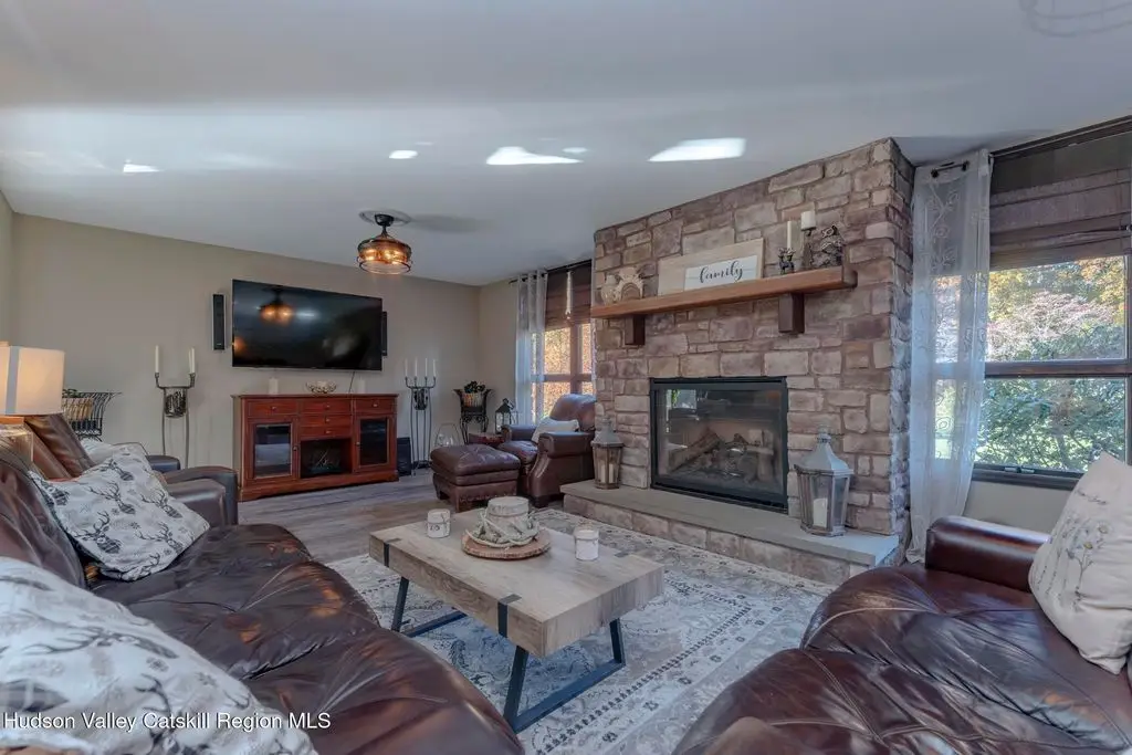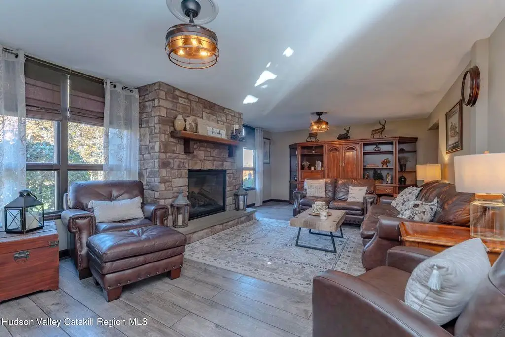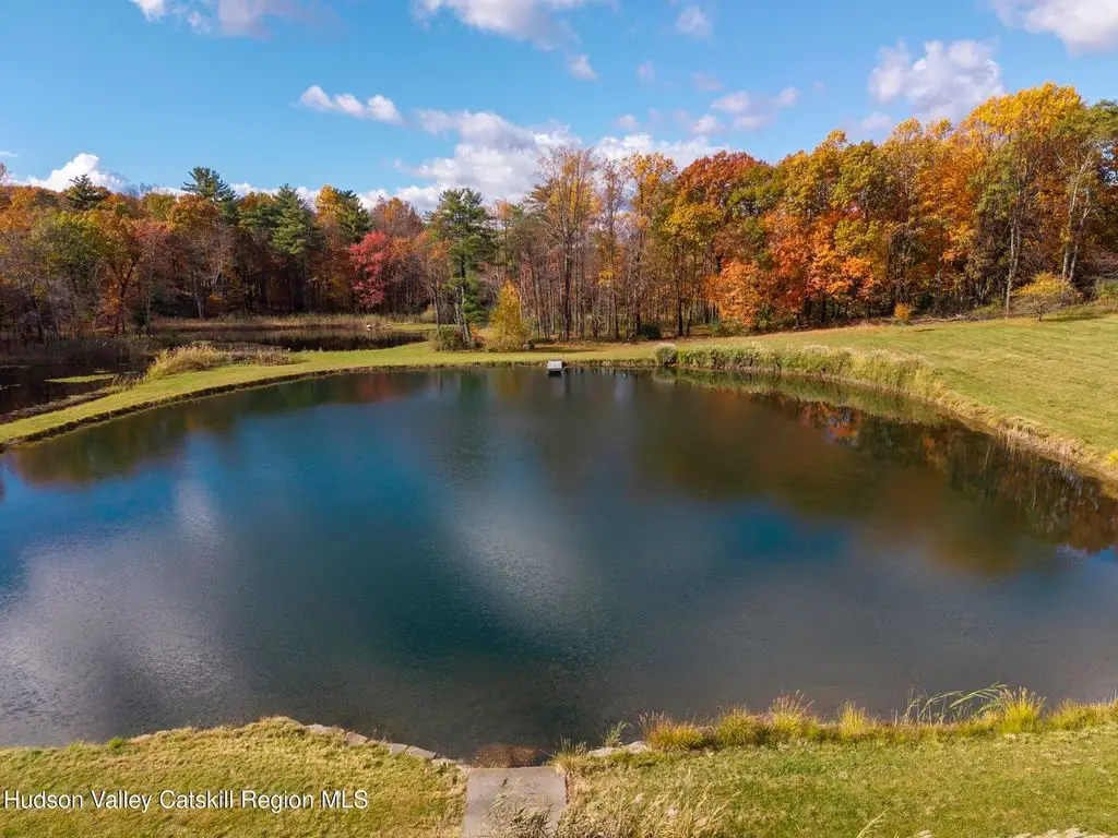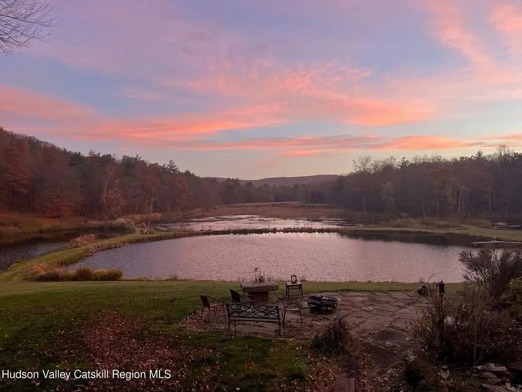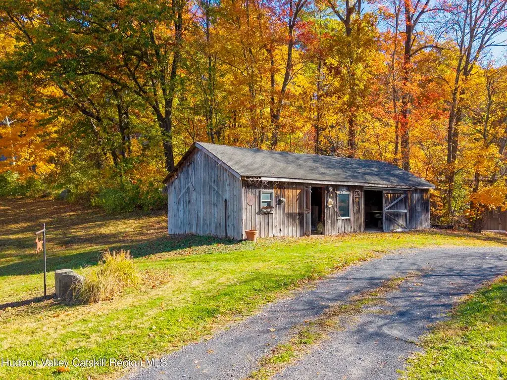 Escape to your own private retreat nestled in the woods! This 3-bedroom, 1.5 bath home offers the perfect blend of comfort and country charm. The spacious kitchen is designed for entertaining, with ample counter space and room for gathering both indoors as well as flowing out onto the two tiered deck overlooking the ponds and a waterfall that can be turned on simply by a switch in the home. Work from home or host extended family or friends with an additional flex room on the first floor. Unwind by the cozy fireplace in the living room on crisp winter evenings, or step outside and experience the serenity of the forest, open meadows, and water views. Upstairs, you will find 3 spacious bedrooms and an open sitting area complete with gorgeous views. Enjoy 18.3 secluded acres featuring 4 stocked ponds, ideal for fishing, reflection, and quiet afternoons outdoors. A 3-stall barn with tack room electric and water provides space for horses, hobbies, or storage, while the large detached garage adds even more room for vehicles and equipment. Whether you're looking for a peaceful year-round residence or a secluded getaway, this hidden gem is perfect for those seeking privacy, adventure, and a connection to the outdoors. Located 80 miles from NYC and close and convenient to historic Kingston, your peaceful retreat awaits in the heart of the Hudson Valley.