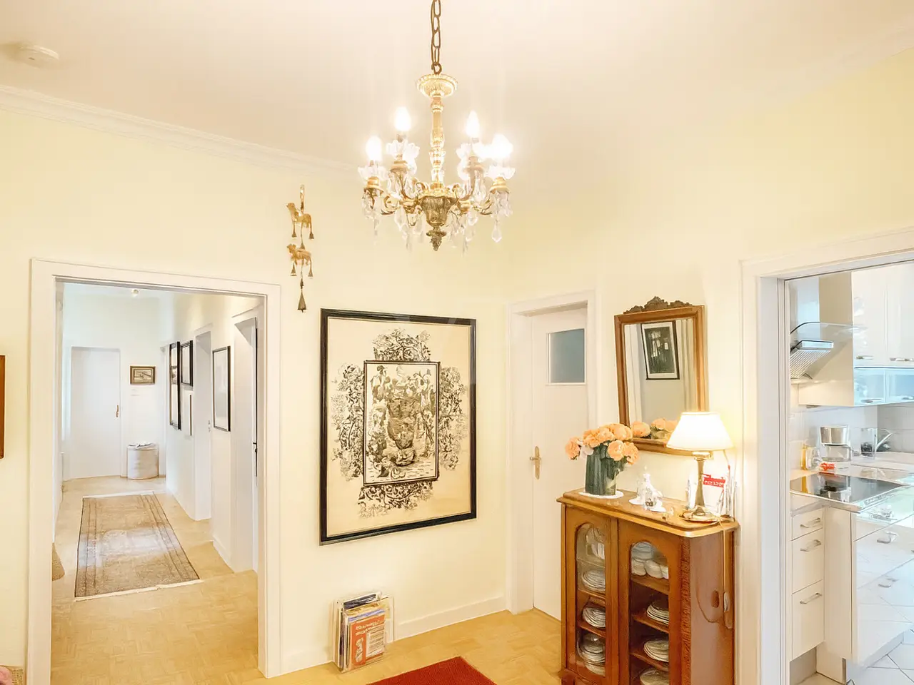 This exceptional condominium with approx. 156 m² of living space awaits you in the heart of the sought-after eastern part of the city, surrounded by urban life and at the same time in a quiet, stylish living atmosphere. The residential building, built around 1920, presents itself in prestigious architecture that combines classic style elements with contemporary furnishings - a jewel for lovers of urban quality of life at the highest level. Five generously proportioned rooms open up a wide range of possible uses. Particularly noteworthy is the elegant living room, characterized by original stucco, impressive ceiling heights and large windows that create a light-flooded ambience. This combination lends the rooms an extraordinary spaciousness and an atmosphere of timeless elegance. The heart of the apartment is the light-flooded conservatory, which conveys a feeling of peace and security at any time of year. The directly adjacent, covered balcony extends the living space outdoors and offers a stylish place for enjoyable moments in the open air. The separate, high-quality kitchen can be designed according to individual preferences and blends harmoniously into the luxurious room concept. A daylight bathroom with bathtub and shower as well as a separate guest bathroom with shower round off the offer. High-quality parquet flooring, which runs through the entire apartment, lends the rooms warmth and comfort. A modern elevator provides convenient access and makes the apartment ideal for discerning residents of all ages. The environmentally friendly district heating system guarantees an efficient, state-of-the-art energy supply. The stylish symbiosis of classic architecture, elegant furnishings and modern technology makes this apartment a truly prestigious property. In a prime eastern city location, this property boasts an excellent infrastructure: boutiques, upscale restaurants, charming cafés, cultural facilities and perfect public transport connections are just a few steps away. This apartment combines the best of classic living culture and modern comfort - a refuge for people with high standards of style, location and quality of life.