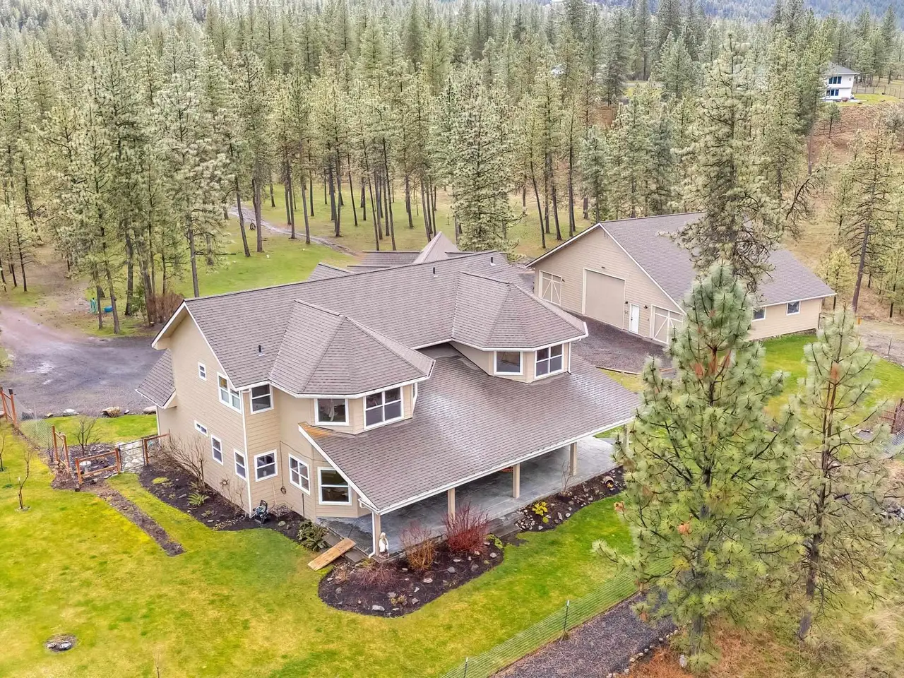 Welcome to this remarkable custom-built home, perfectly situated on 10 acres of park-like grounds with breathtaking views of Lake Spokane. This energy-efficient home boasts zonal Geothermal heating and cooling. The chef’s kitchen is a dream, offering ample cabinet space, double ovens, and a spacious walk-in pantry. The main floor includes a guest suite with an attached bath, a cozy family room, a formal living room, an office, a half bath, and a mudroom for added convenience. Upstairs, you’ll find a large master suite, two generously sized bedrooms, a laundry room, and another full bath. Don’t miss the impressive 687 sq. ft. bonus room, perfect for entertainment or additional living space. For car enthusiasts and hobbyists, the home features an attached 3-car garage and a massive 40x62 detached shop with radiant floor heat in the center bay, making it ideal for year-round use. Enjoy sunsets and endless river views from the expansive back patio that extends the length of the home.