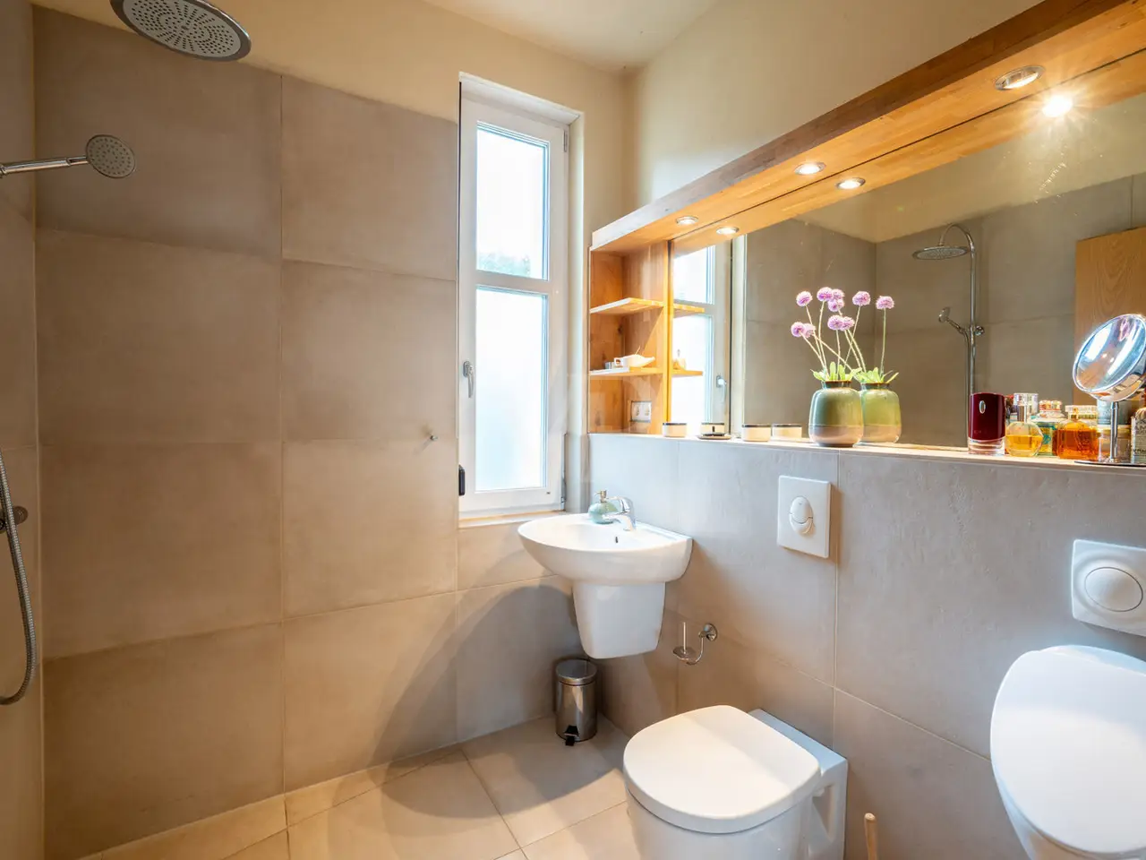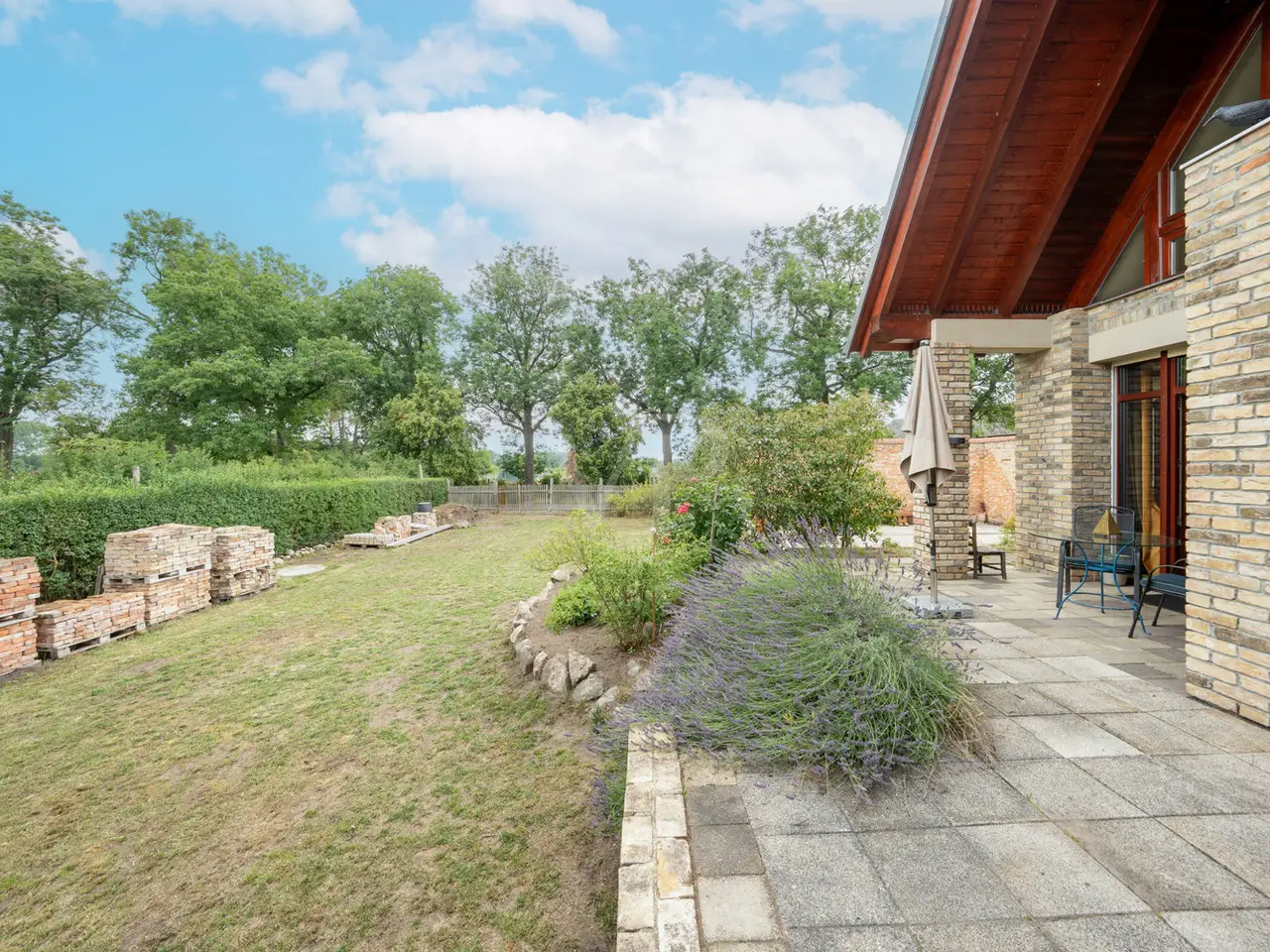 This impressive 923 m² courtyard and garden property is just a 25-minute drive south of Berlin and Potsdam. Nestled in the protected Nuthe-Nieplitz nature park, it offers a peaceful, natural environment. The location creates a fascinating contrast to the urban density of the cities and invites you to enjoy nature in all its beauty. A place that combines peace, nature and space. From the street, you enter the property via a paved entrance courtyard, which was designed in the style of the historic three-sided courtyards in the neighborhood. This is reflected in the courtyard development and the building materials used. A wide fieldstone staircase leads up to the main house, which was built about one meter above the ground to enhance the sweeping views of the landscape. This exceptional architect-designed house, which was built in 2017, harmoniously combines modern construction quality with traditional elements and impresses with its high-quality workmanship and flexible floor plan. With around 183 m² of living space and around 90 m² of usable space, this property offers plenty of room for individual living, working and development. The solidly built house combines modern energy efficiency with charming details. Energy efficiency class A ensures low operating costs, while inside, a harmonious blend of historic wooden beams and exposed concrete in the ceilings creates a special atmosphere. Large windows with triple glazing and shutters allow plenty of light into the home. The south-west orientation makes it possible to experience the changing rhythm of sunlight in a subtle way. Sustainable energy is provided by a solar thermal system, underfloor heating and a double-sided wood-burning stove, which can optionally provide additional heat via an adjustable opening in the attic. A fiber optic connection is available. The heart of this house is the first floor with its spacious open-plan living and dining area, which flows seamlessly into the terrace and garden. There is also a small home office, a barrier-free shower room, a timeless kitchen and a practical kitchen pantry. Warm real wood oak floorboards and clay plaster on the ceilings and walls create a cozy atmosphere. A wide staircase takes you to the top floor, which impresses with its exposed carpentry. Here you will find two loft rooms for living and sleeping, a dressing room, the utility area and a bathroom with bathtub. The offset timber and glass façade also offers a wonderful view of the unobstructed landscape. The space on offer is complemented by an approx. 60 m² heated coach house, which can be used as an office, guest house, sauna or fitness room, as well as an approx. 30 m² workshop, which serves as a utility building or cellar replacement room. The well-kept outdoor area is lovingly landscaped: The so-called "ruin courtyard" with seating walls and a U-shaped brick wall serves as a wind-protected retreat and is complemented by a small, sheltered patio courtyard as well as covered alcoves that can be used for both sunny and shady stays. The property boundary is bordered by historic brickwork, hedges and a picket fence. Exterior lighting with motion detectors creates a cozy atmosphere, while roof drainage is provided by two retention and soakaways in the courtyard and garden area. There are also two garden water connections. There is ample space for vehicles and there is the option of building a large carport. This house harmoniously combines old and new, high-quality craftsmanship, authentic materials and modern living quality. It is a home with character and a wide range of possible uses, which impresses with its special atmosphere and individual design.
