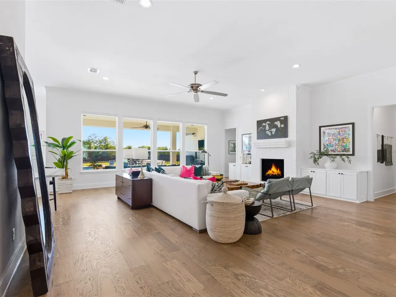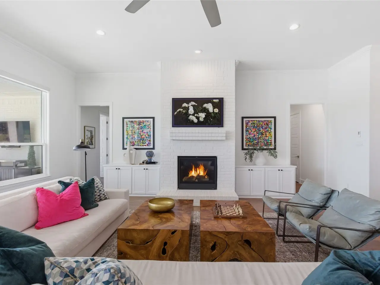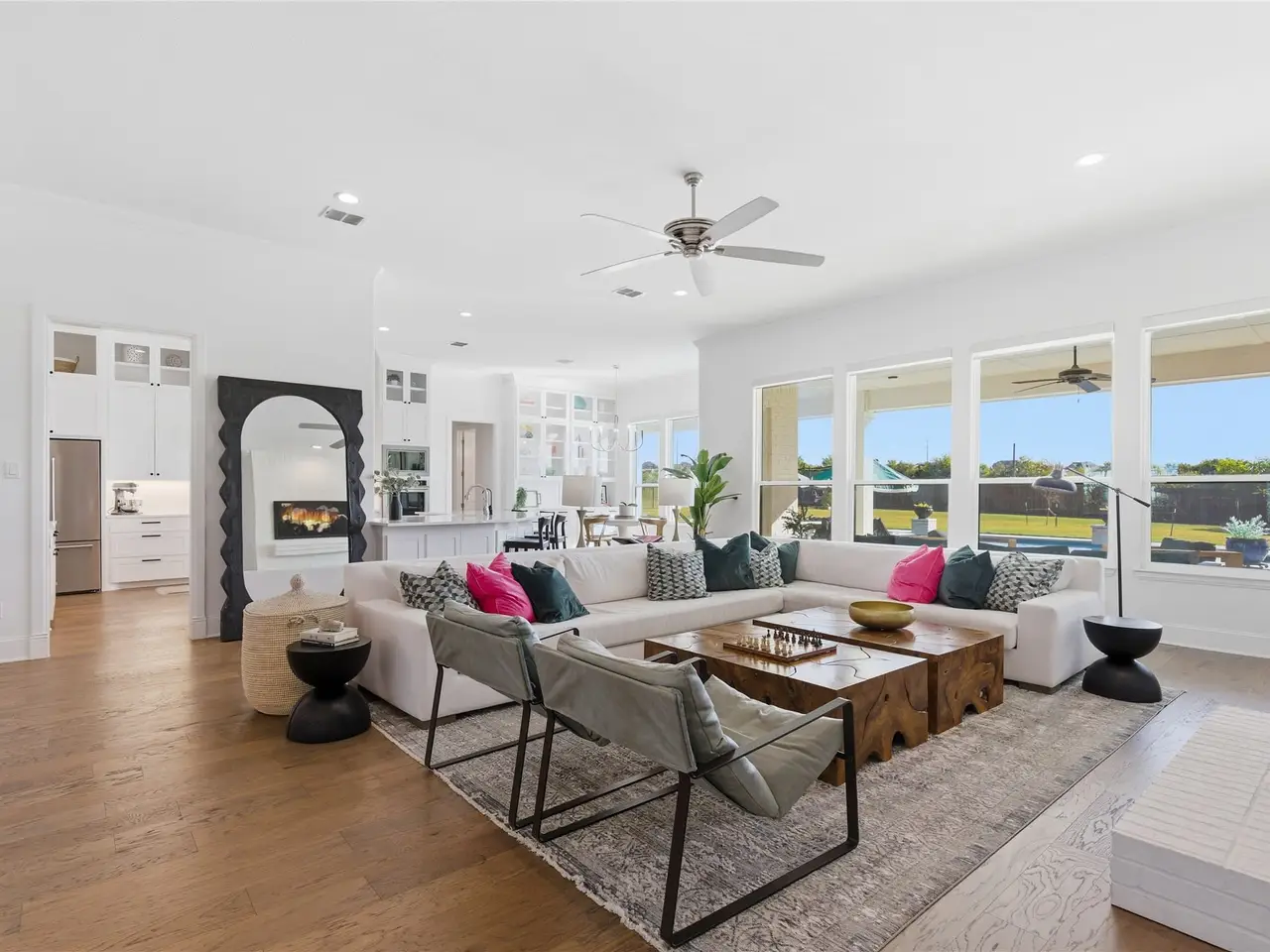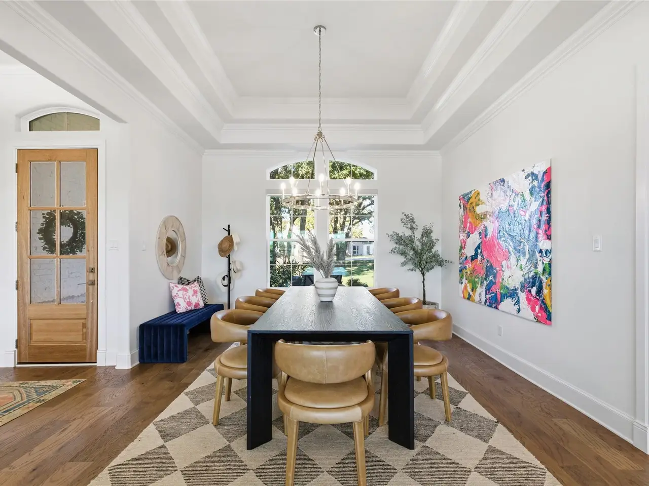 Experience luxury living on over an acre in Aledo ISD with this beautifully appointed home designed for comfort, style, and spacious indoor-outdoor living. A sweeping covered patio overlooks the resort-style pool and lush fenced yard, offering an ideal backdrop for entertaining or unwinding. The light-filled interior embraces an open layout anchored by a grand living room with a fireplace framed by custom built-ins. The elegant dining room showcases coffered ceilings, while the chef-inspired kitchen features quartz countertops, stainless appliances, gas cooktop, double ovens, butlers pantry, and a walk-in pantry. The breakfast room, with its charming built-in buffet and expansive backyard views, is the perfect everyday gathering space. A refined home office with French doors and full wall of built-ins provides the ideal work-from-home setting. The serene primary suite includes vaulted ceilings, a generous sitting area, and a spa-style bath with double vanities, soaking tub, separate shower, and a walk-in closet that conveniently connects to the oversized laundry room. Additional highlights include a second living room with a custom wet bar, a large storage closet, and a flexible bonus room that functions beautifully as a second office, nursery, or home gym.