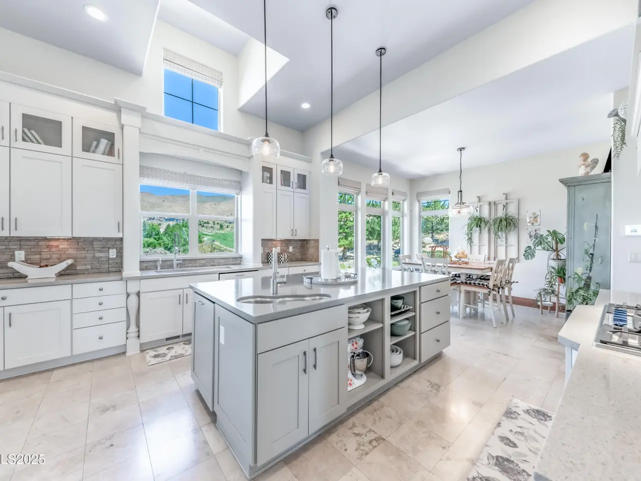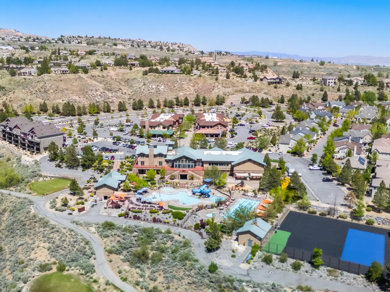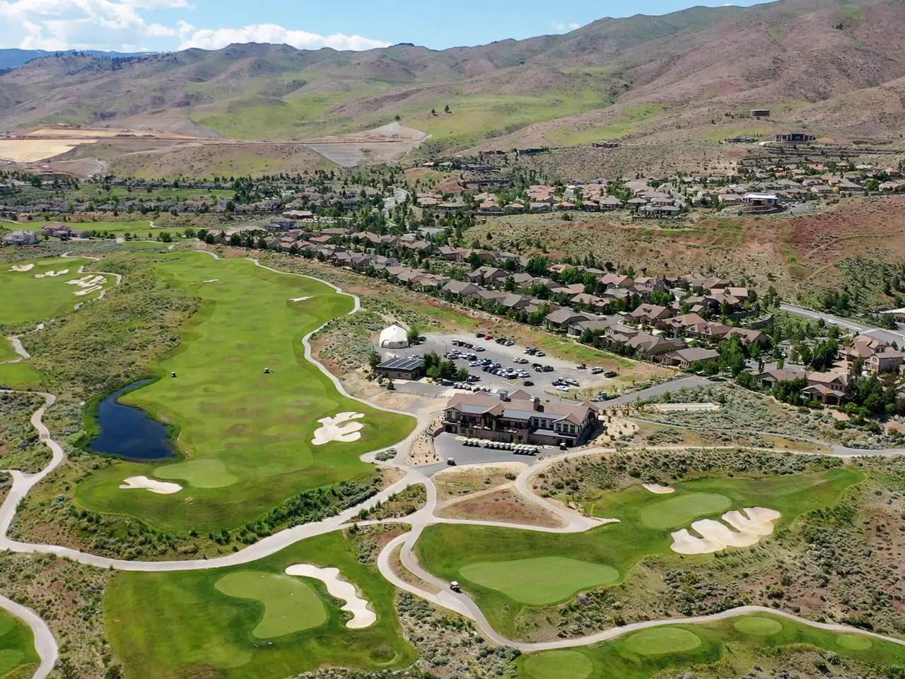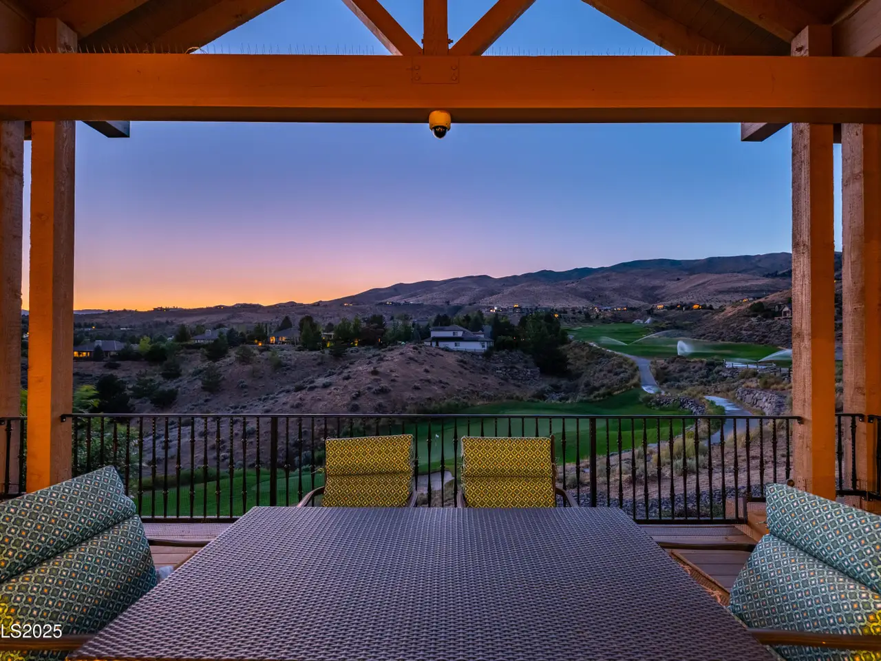 Welcome to luxury living in a small gated enclave within Reno's Somersett Community. Just off the 4th roundabout, this custom home overlooks the signature 3rd hole and 4th tee of the Tom Kite designed Somersett Golf course. Enjoy stunning sunsets from the wisteria-covered deck that spans the great room, kitchen, and primary suite. The spacious primary suite with panoramic mountain and golf course views is complete with reading nook, coffee bar, soaking tub with fireplace and a glamorously sized closet. The den and powder room are just off the foyer. A charming guest suite flows into the enclosed courtyard with a barbecue and seating area. Downstairs, discover two guest suites, a family room with wet bar and wine storage, and a six-seat movie theater. The .86-acre lot includes a 4-car, 1,400 sq. ft. garage with workspace and attic storage. Don't golf? Visit the town square for dining or wander to the HOA rec center with amenities including two pools, tennis & pickleball, a gym and Canyon Nine Golf Course. Trails and Parks are featured throughout the community. This is refined, relaxed living in one Reno's most desirable settings—where views, privacy, and comfort come together seamlessly.