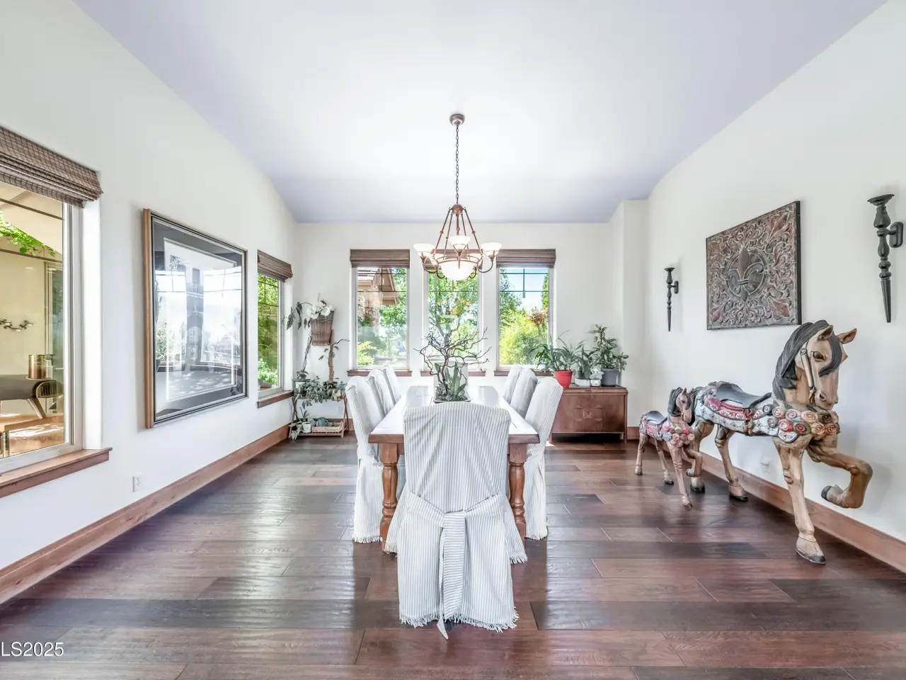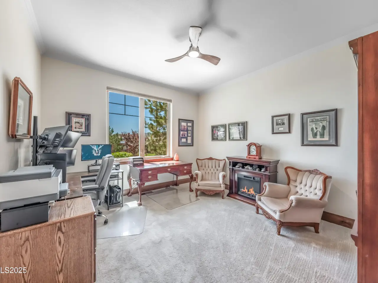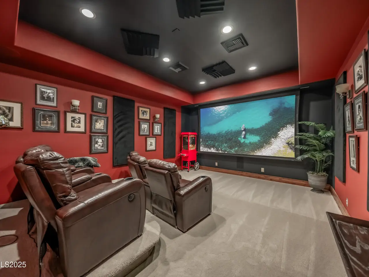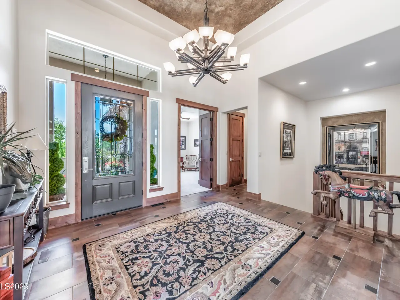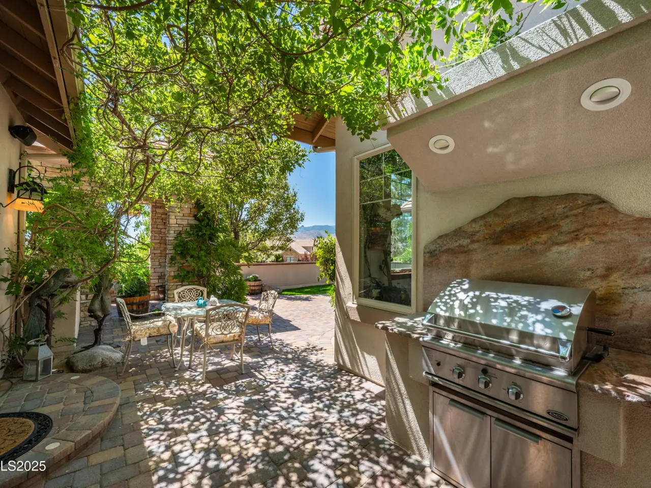Welcome to luxury living in a small gated enclave within Reno's Somersett Community. Just off the 4th roundabout, this custom home overlooks the signature 3rd hole and 4th tee of the Tom Kite designed Somersett Golf course. Enjoy stunning sunsets from the wisteria-covered deck that spans the great room, kitchen, and primary suite. The spacious primary suite with panoramic mountain and golf course views is complete with reading nook, coffee bar, soaking tub with fireplace and a glamorously sized closet. The den and powder room are just off the foyer. A charming guest suite flows into the enclosed courtyard with a barbecue and seating area. Downstairs, discover two guest suites, a family room with wet bar and wine storage, and a six-seat movie theater. The .86-acre lot includes a 4-car, 1,400 sq. ft. garage with workspace and attic storage. Don't golf? Visit the town square for dining or wander to the HOA rec center with amenities including two pools, tennis & pickleball, a gym and Canyon Nine Golf Course. Trails and Parks are featured throughout the community. This is refined, relaxed living in one Reno's most desirable settings—where views, privacy, and comfort come together seamlessly.