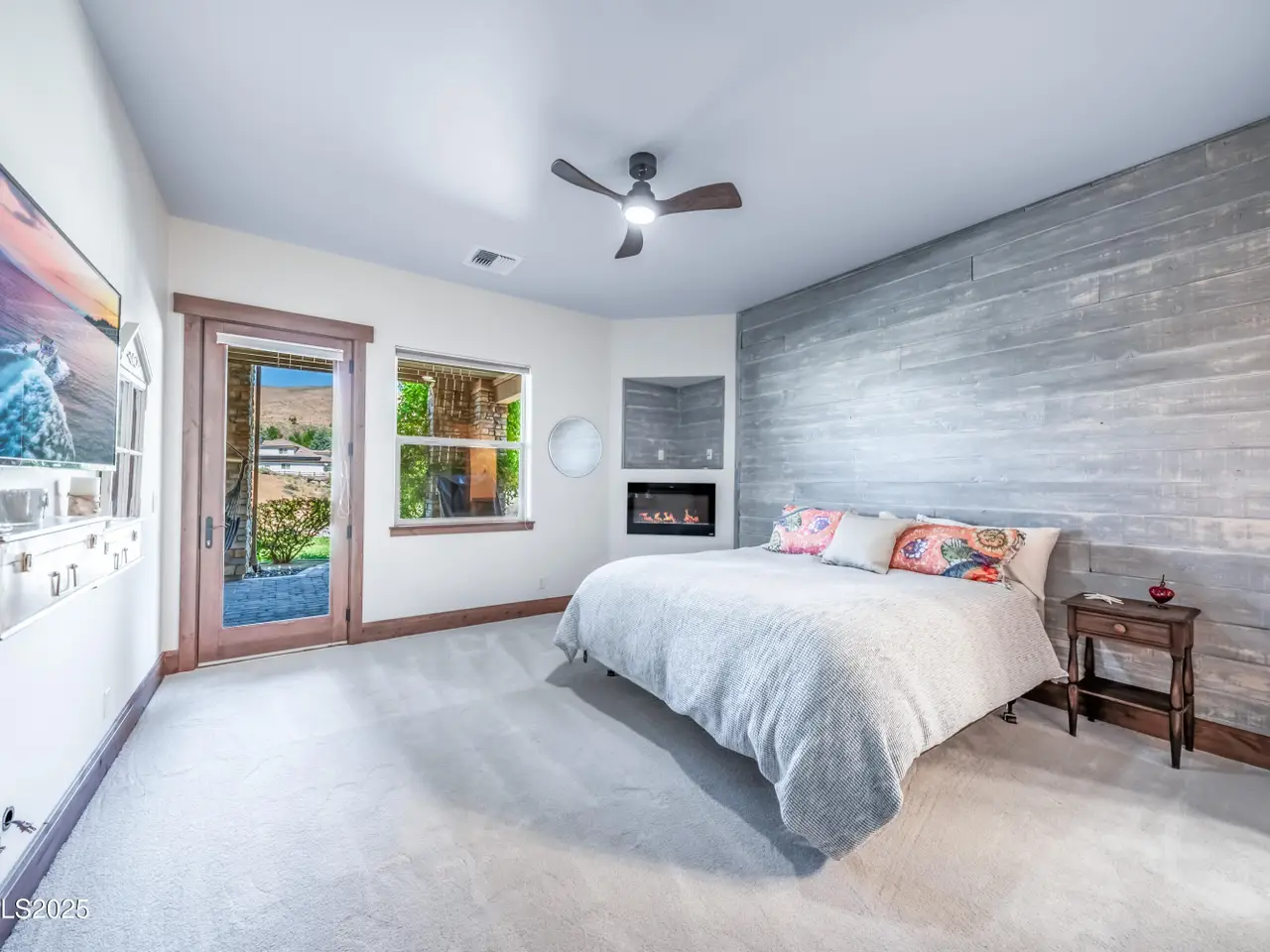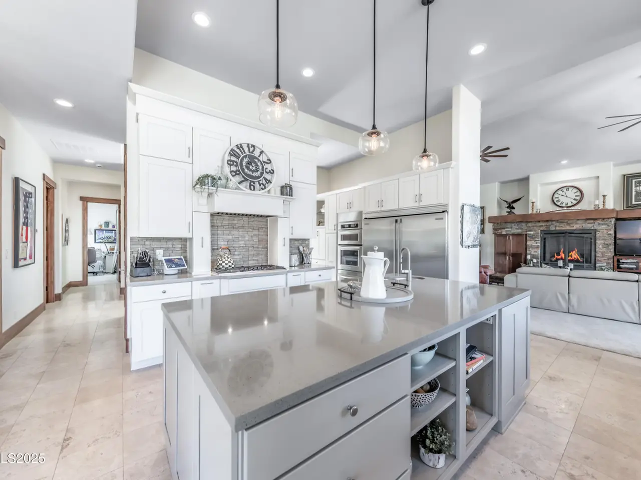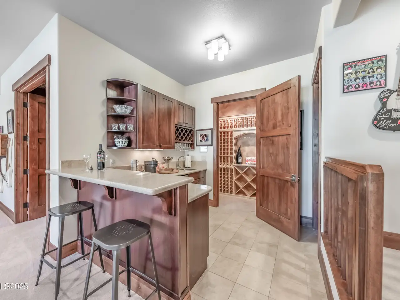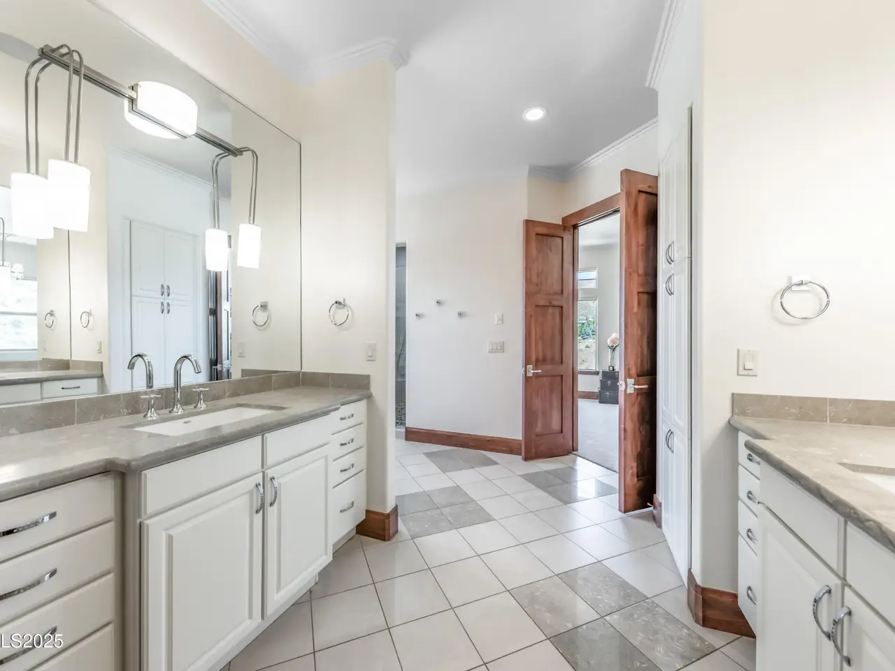 Welcome to luxury living in a small gated enclave within Reno's Somersett Community. Just off the 4th roundabout, this custom home overlooks the signature 3rd hole and 4th tee of the Tom Kite designed Somersett Golf course. Enjoy stunning sunsets from the wisteria-covered deck that spans the great room, kitchen, and primary suite. The spacious primary suite with panoramic mountain and golf course views is complete with reading nook, coffee bar, soaking tub with fireplace and a glamorously sized closet. The den and powder room are just off the foyer. A charming guest suite flows into the enclosed courtyard with a barbecue and seating area. Downstairs, discover two guest suites, a family room with wet bar and wine storage, and a six-seat movie theater. The .86-acre lot includes a 4-car, 1,400 sq. ft. garage with workspace and attic storage. Don't golf? Visit the town square for dining or wander to the HOA rec center with amenities including two pools, tennis & pickleball, a gym and Canyon Nine Golf Course. Trails and Parks are featured throughout the community. This is refined, relaxed living in one Reno's most desirable settings—where views, privacy, and comfort come together seamlessly.