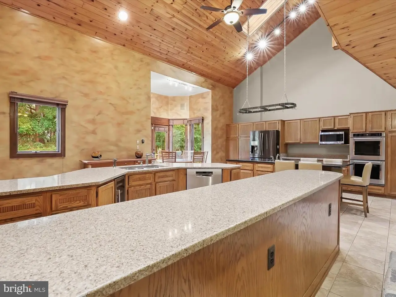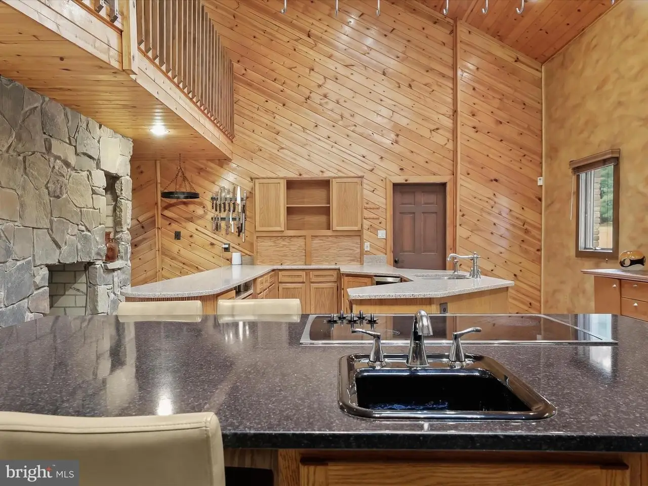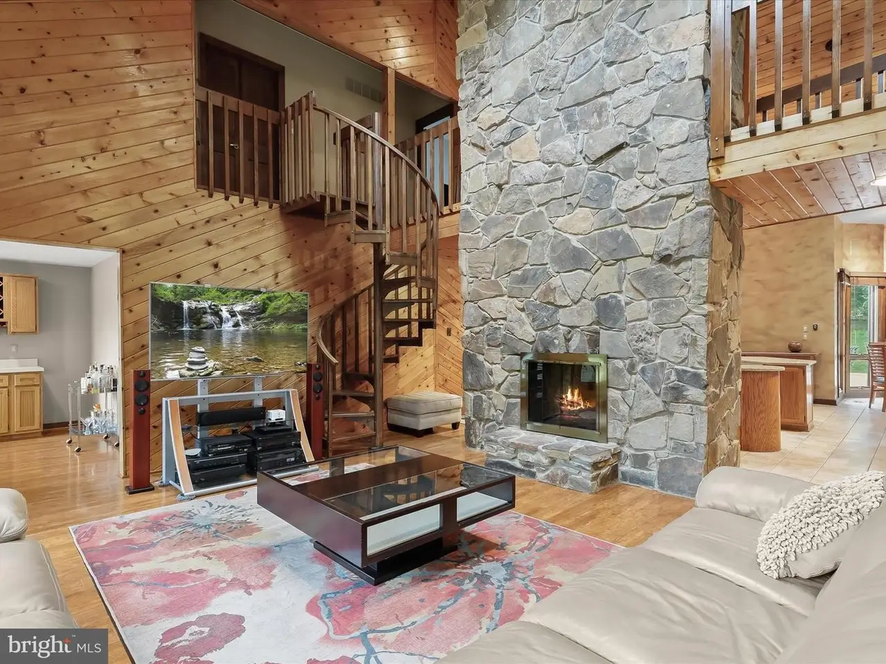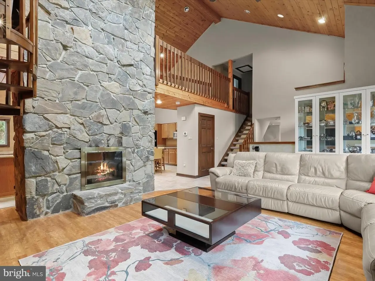 Welcome to your private retreat in one of the area's most sought-after communities! This one-of-a-kind custom home offers a truly unique living experience that will make you feel like you are on vacation every day. Featuring five bedrooms and three full bathrooms spread across four thoughtfully designed levels, this home provides generous space, flexibility, and privacy for every lifestyle. Nestled on over 4 acres of beautifully landscaped grounds that back to trees, the setting offers tranquility and seclusion while still being conveniently located near everything you need. From the moment you step inside, you are greeted by soaring vaulted ceilings with wood planks, skylights, and an abundance of natural light throughout. The main level features an impressive living room with a two-story stacked-stone wood-burning fireplace that is double-sided and shared with the kitchen, creating a warm, welcoming ambiance. A bar area off the living room is perfect for entertaining. The expansive kitchen is a chef's dream, fully equipped with stainless steel appliances, granite countertops, and a dining area with access to the deck overlooking the backyard and woods. Upstairs, the primary bedroom suite is a true escape, with a luxurious en-suite bathroom that includes a jetted tub and walk-in steam shower, along with a large walk-in closet and dressing vanity area. Three additional bedrooms and a second full bathroom complete the upper level. The lower level includes a spacious family room, a fifth bedroom, and a third full bathroom. A versatile bonus room on this level is ideal for an office, playroom, or even another bedroom. Downstairs, the basement provides even more flexibility with a recreation room and a large office with built-ins. Don't miss this rare opportunity to own a spectacular property that combines architectural distinction with a serene, resort-like atmosphere.