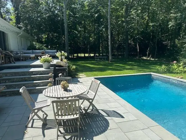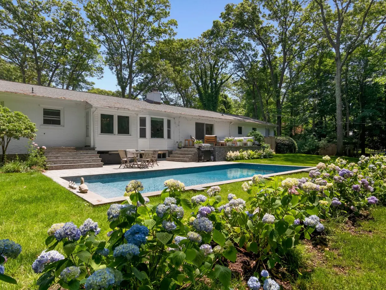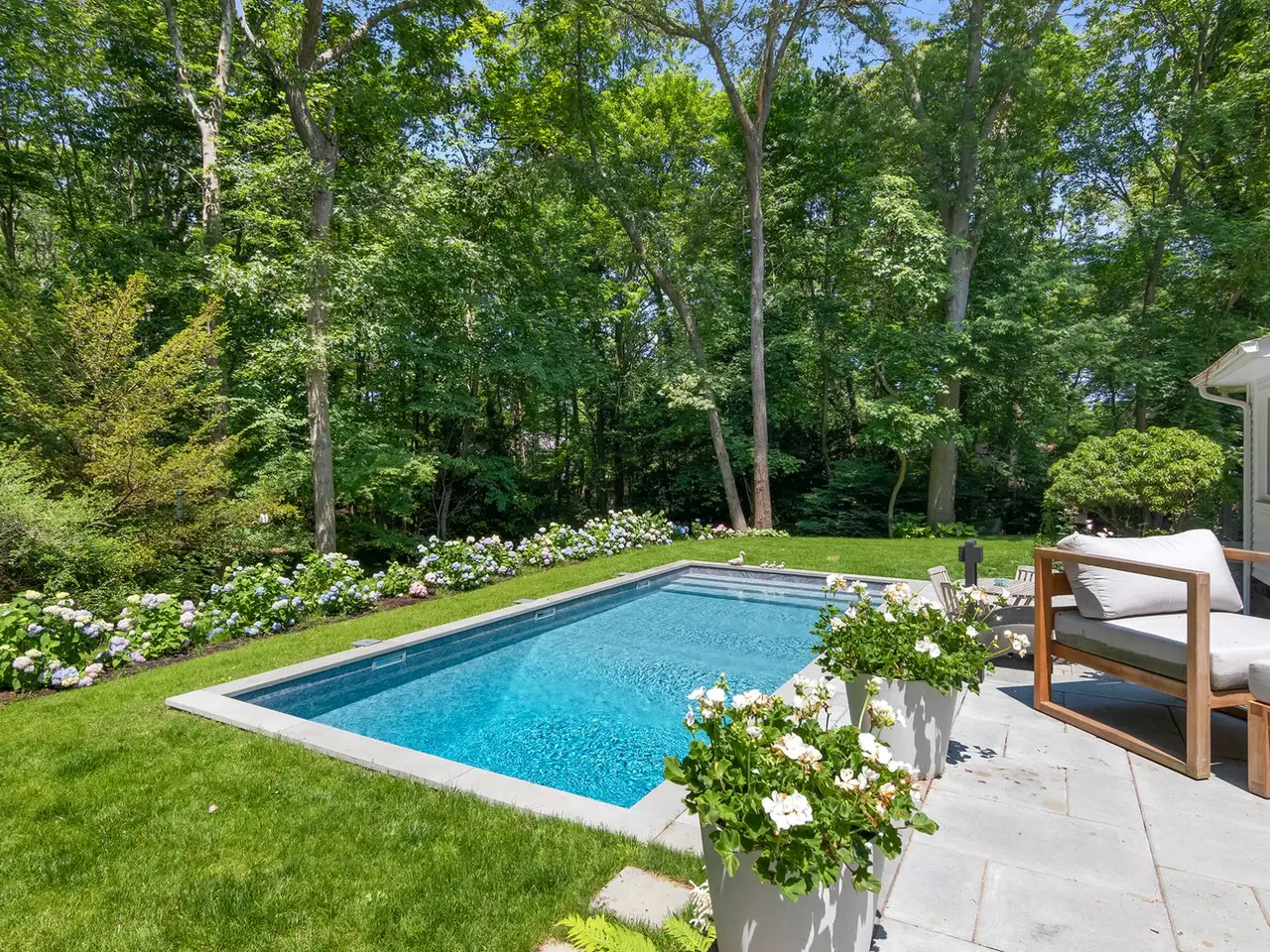 Lovingly restored mint-condition Modern 1964 ranch in Belle Terre with a new pool and gorgeous landscaped grounds with weather-smart irrigation on a full acre. The circular pea-gravel driveway leads to the connected two-car garage or to the front door, your choice. The large front yard gently slopes up to the house. The very private backyard has an expansive lawn, mature hydrangeas and roses, a fabulous propane-heated saltwater pool with a fence around the entire backyard (mostly not visible through the forest), a luxurious outdoor hot shower, and a large bluestone terrace off the living room, perfect for sunbathing. Gracious double front doors lead to a large foyer. Nailed down oak strip flooring throughout the home. New casement windows, double hung, and picture windows. The white 4-sided chef's kitchen has soft white stone counters, a breakfast bar, and a windowed eat-in area. All new top-of-the-line appliances: Blue Star gas range, matching Blue Star refrigerator/freezer, Miele dishwasher, and a double basin stainless steel modern Kohler farmers-sink. White large format subway tile backsplash with floating shelving on one side and plenty of cabinetry on the other sides. The dining room opens to the kitchen and overlooks the pool and backyard. The living room has a wonderful fireplace and glass sliding doors to the terrace. The primary bedroom is spacious and has 4 large California Closets and an ensuite bathroom with gray mosaic floor tile, a large marble vanity, and a shower/tub combo with Jacuzzi. The guest spa bath is modern and sleek with a wonderful walk-in shower. There are two guest bedrooms upstairs. Downstairs, there is a legal bedroom and full bath plus a huge renovated rec room, utility room, gym area, and wood shop. 3200 sq feet of living space overall and 4841 total interior. Best of all, you get Belle Terre amenities, including two private beaches with free kayak/small boat storage, one on the Sound, and one on the Harbor. Rare opportunity to acquire a mid-century, tastefully renovated home with excellent landscaping, a new roof, central air and heat, in sought-after Belle Terre. Move right in! Listing ID 924700