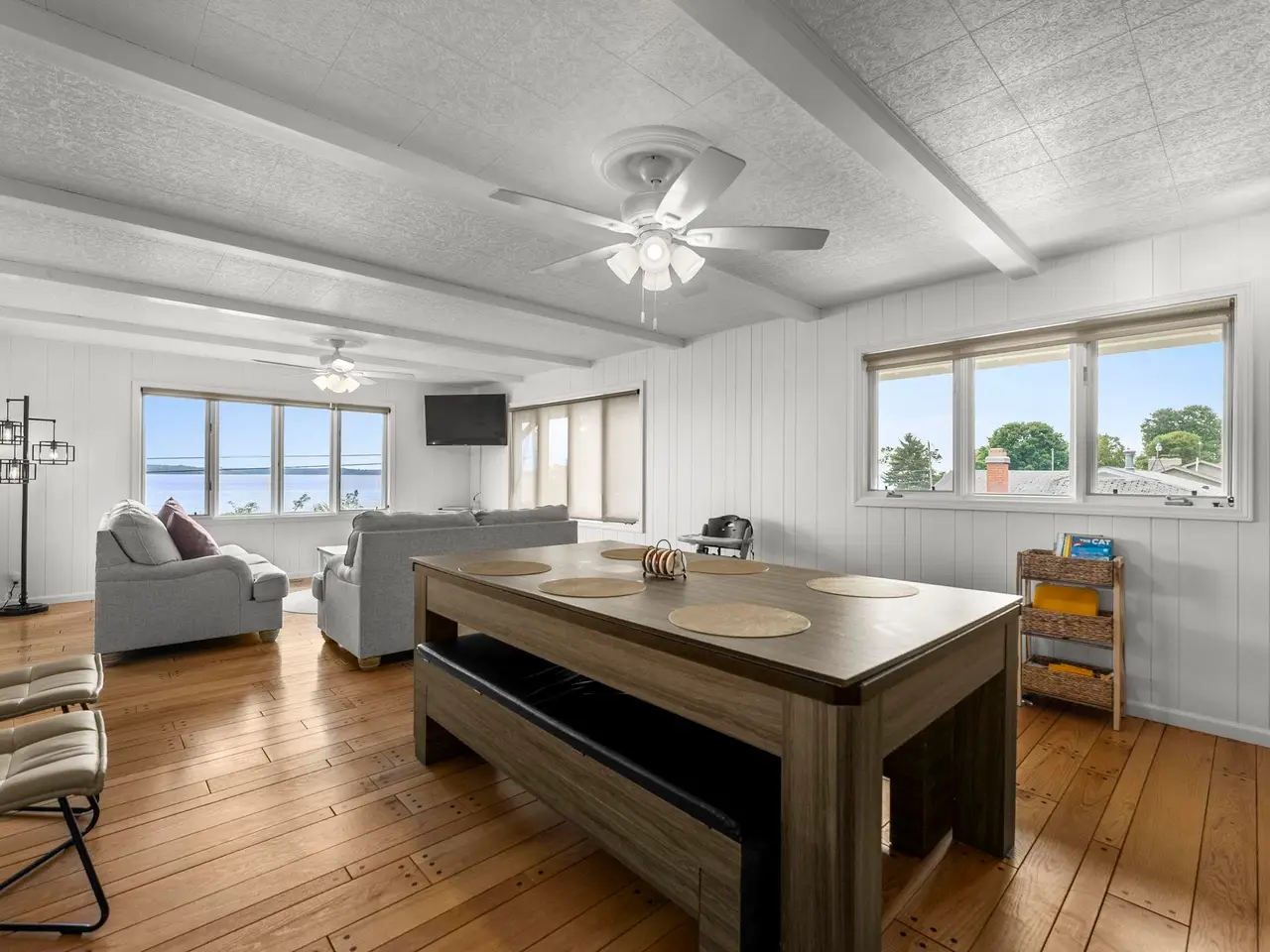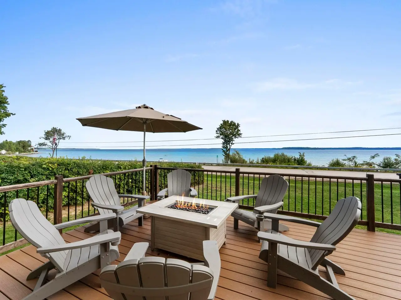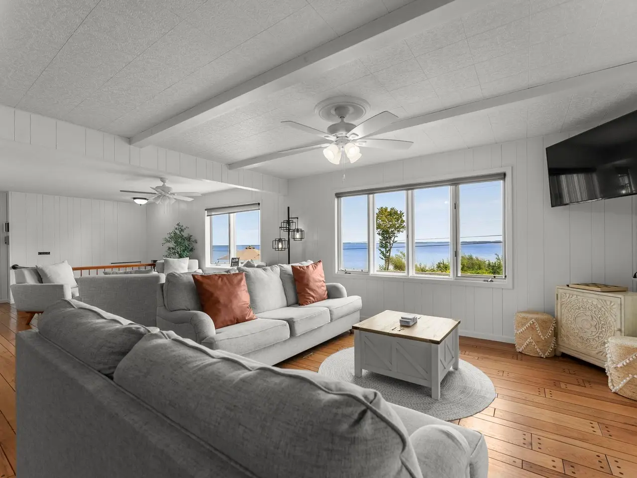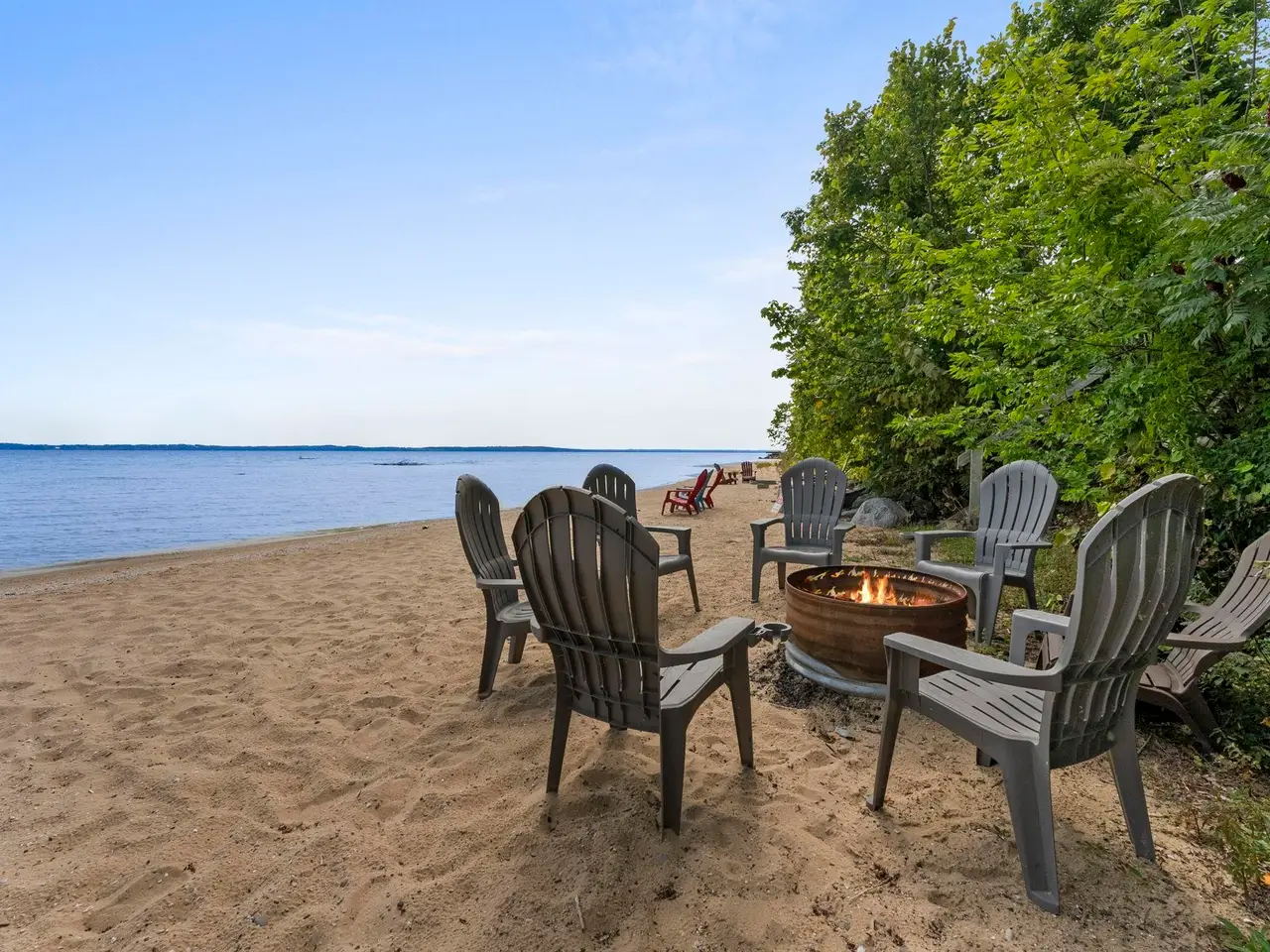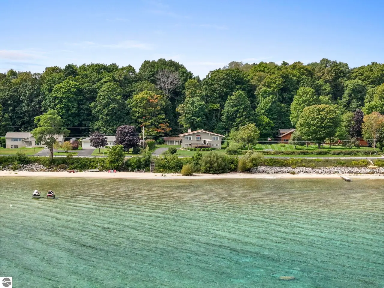 100 feet of private sandy frontage on West Bay with breathtaking views! Ideally positioned between Suttons Bay and Traverse City, this beautifully styled four-bedroom, two-bath retreat offers over 2,000 square feet of light-filled living space. Inside, crisp white interiors pair seamlessly with hardwood and luxury vinyl plank floors, creating a timeless coastal ambiance perfectly suited for lakefront living. The newly remodeled primary suite bathroom showcases a spa-like walk-in shower and double vanity, while the lower level features a second newly remodeled spa bathroom with its own walk-in shower. Outdoors, evenings are best spent unwinding on the expansive sandy beach, taking in the sweeping views of Power Island and the ever-changing shades of blue across the crystal waters of West Bay. Designed and decorated with relaxed elegance, this home is the quintessential lake house -- a perfect blend of comfort, style, and waterfront charm.